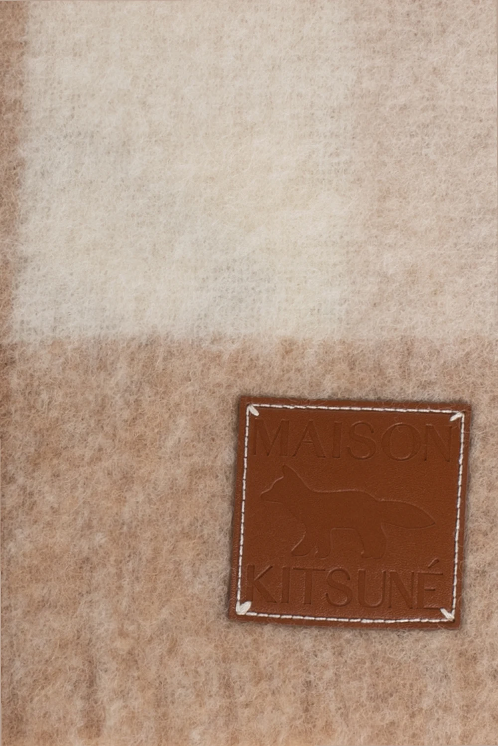 Beżowo-kremowy szal Maison Kitsune. Wykonany z alpaki. Ozdobiony wzorem w kratę i naszywką z logo. Brzegi zakończone frędzlami.