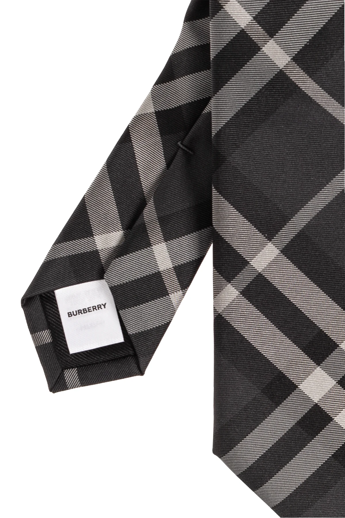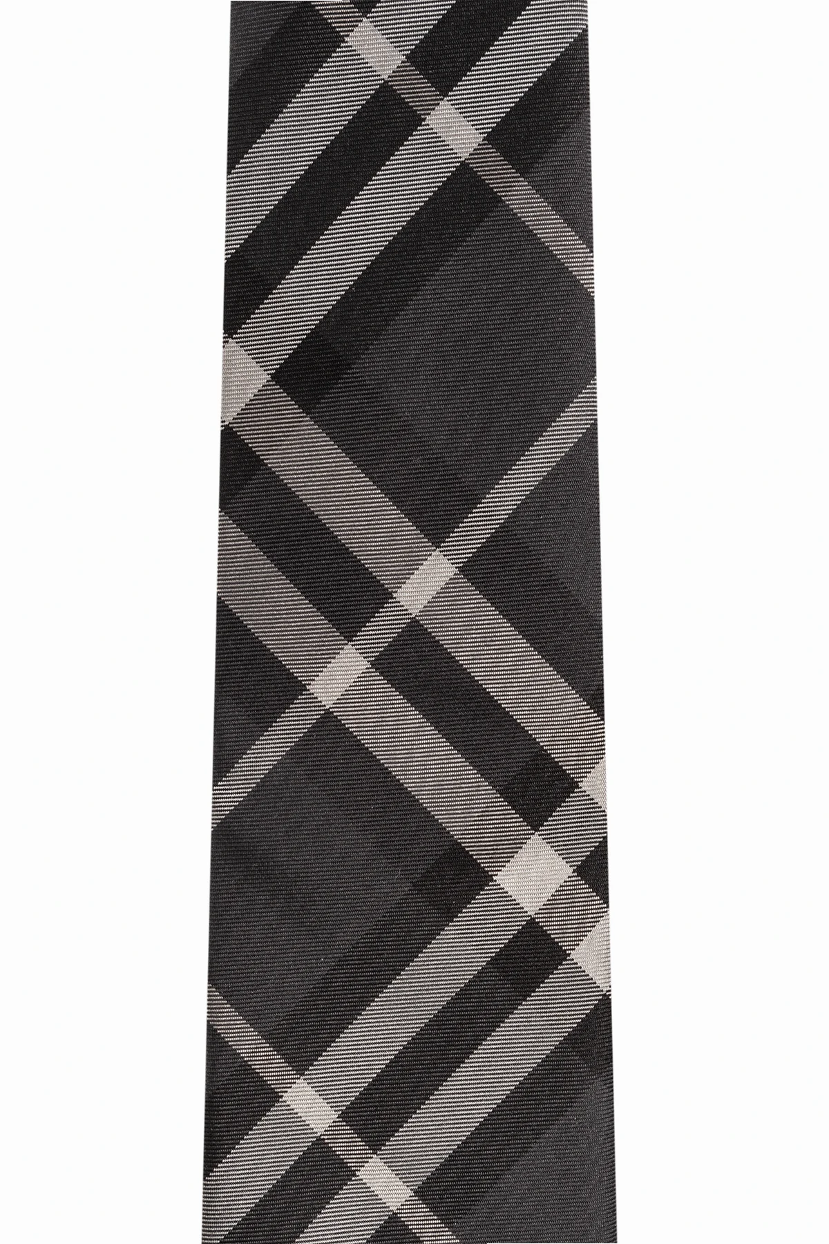 Ciemnoszaro-czarny krawat Burberry. Wykonany z jedwabiu. Ozdobiony charakterystycznym wzorem w kratę.