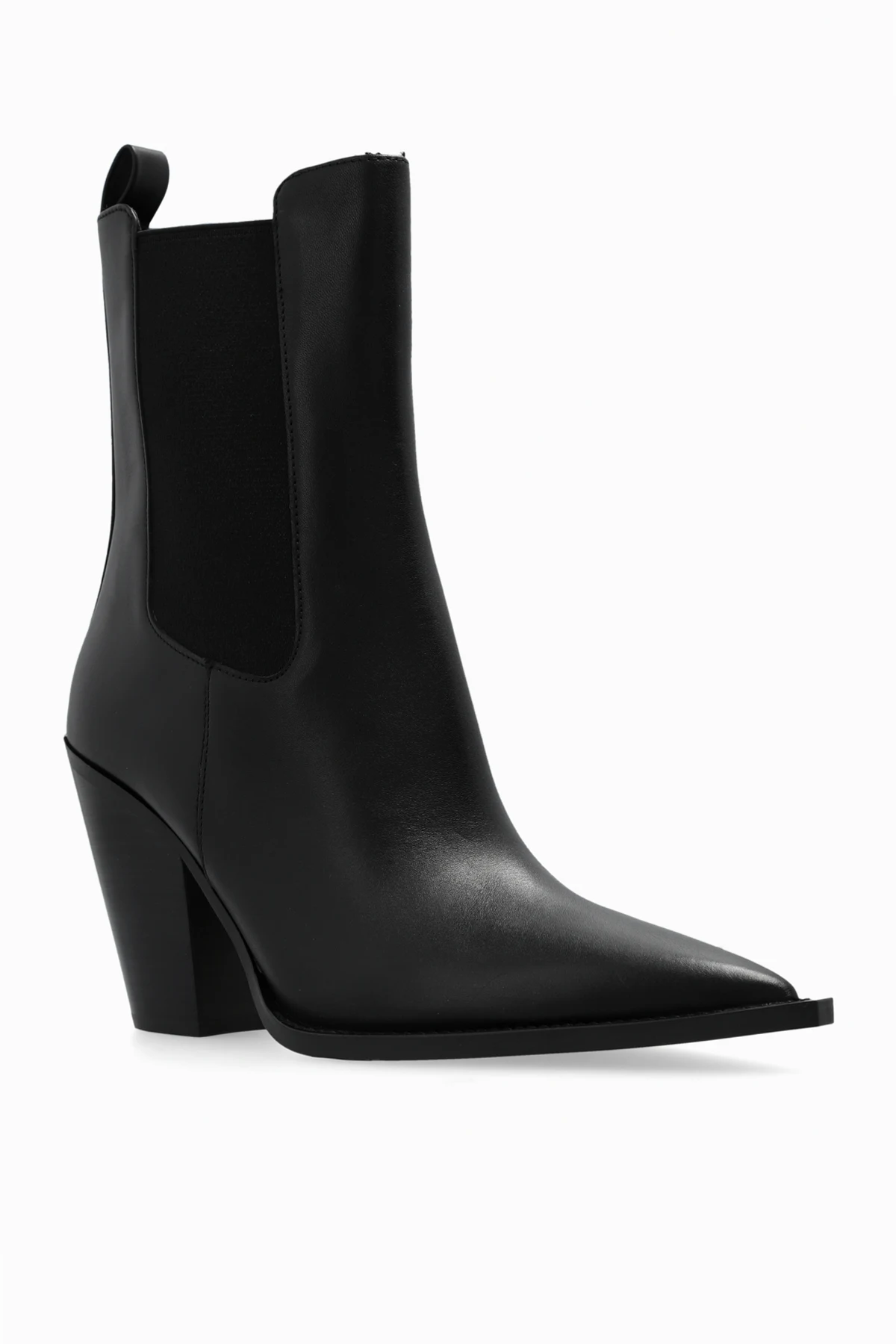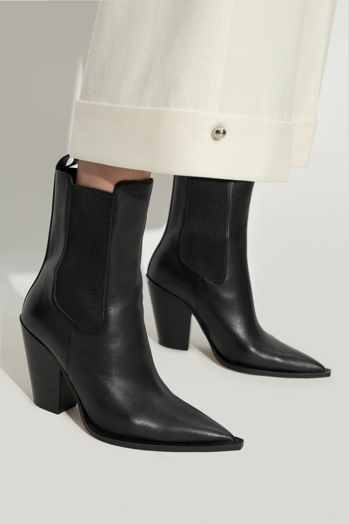 Wykonane z gładkiej, wysokiej jakości skóry, botki posiadają elastyczne wstawki boczne z materiału tekstylnego ułatwiające zakładanie i zdejmowanie. Wysoki, szeroki obcas typu słupek, również pokryty skórą, zapewnia stabilność oraz dodaje eleganckiego wyglądu.