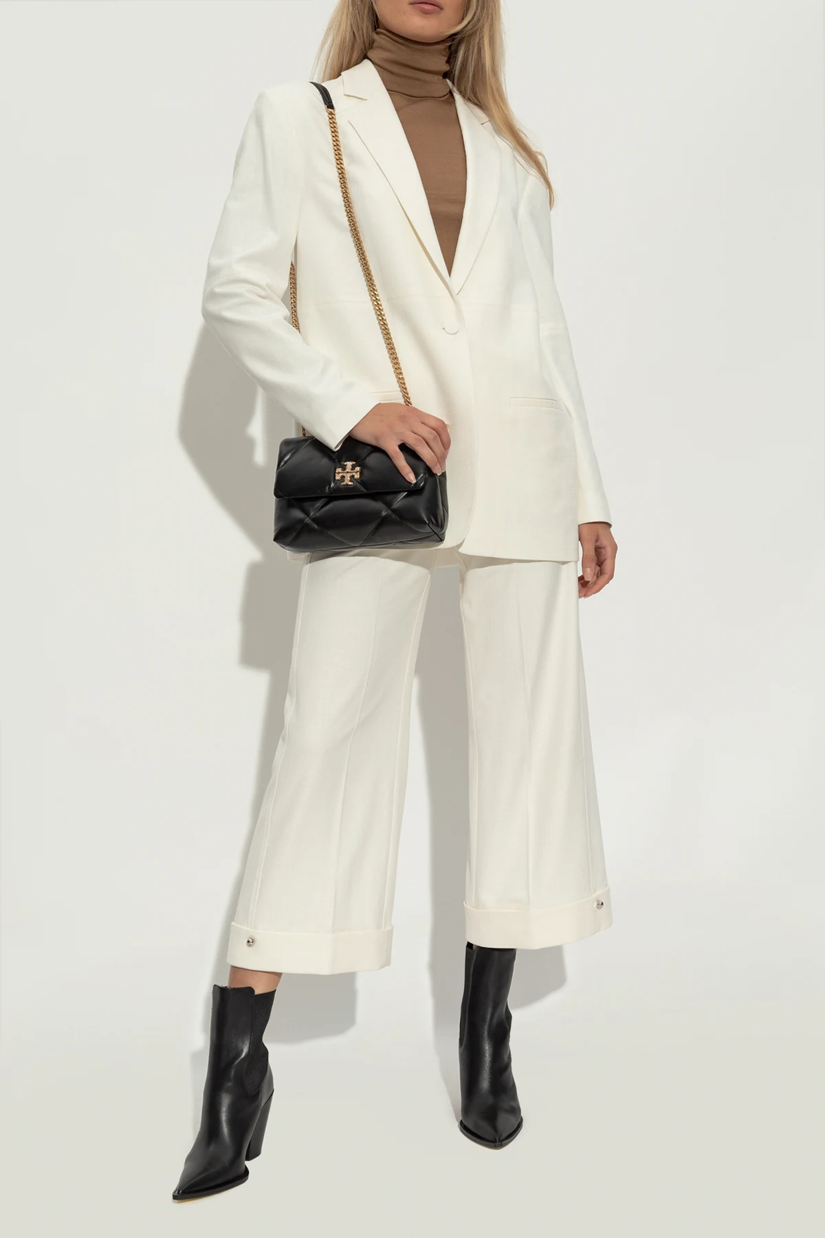Unikalne detale, takie jak metalowy element z logo projektanta.