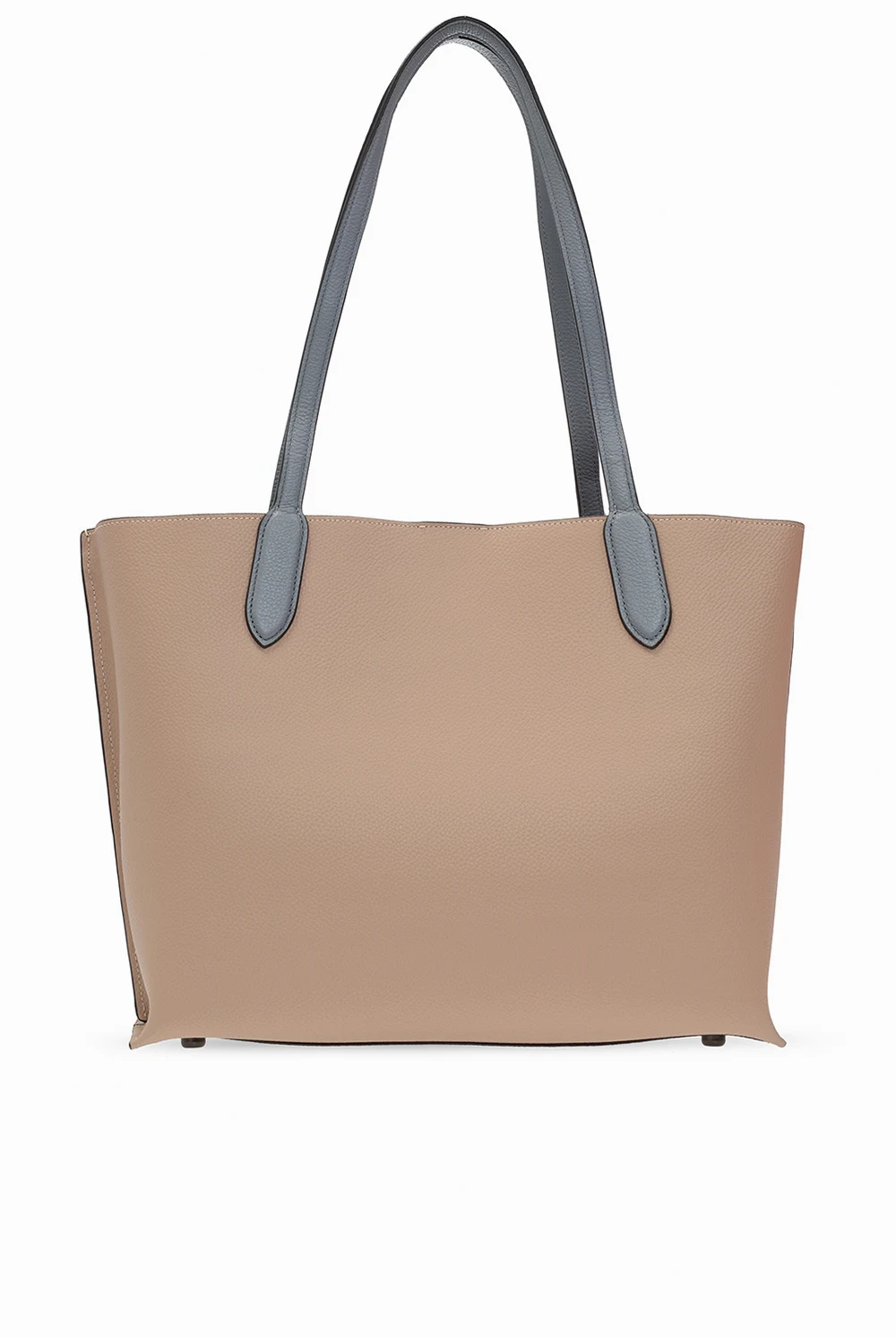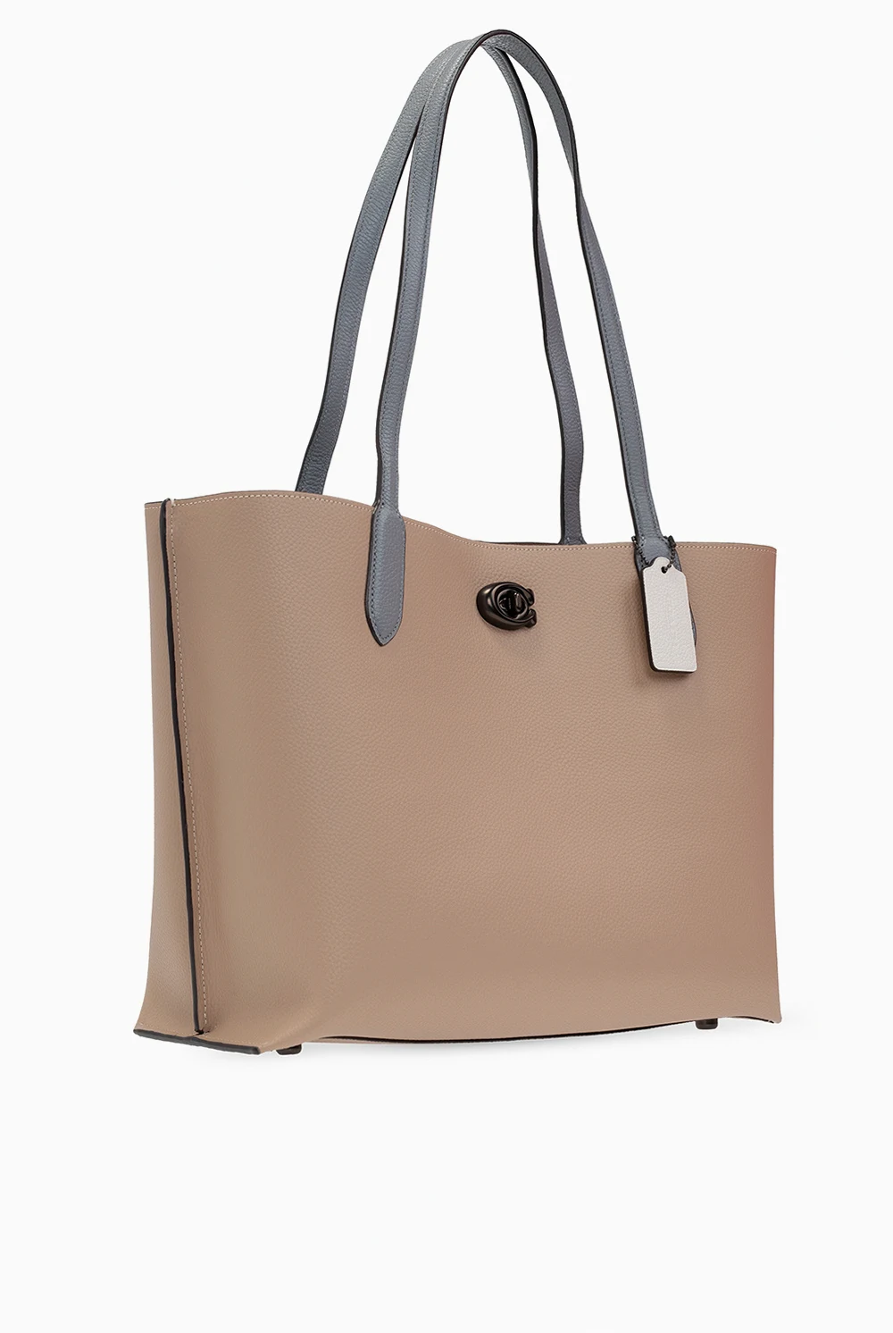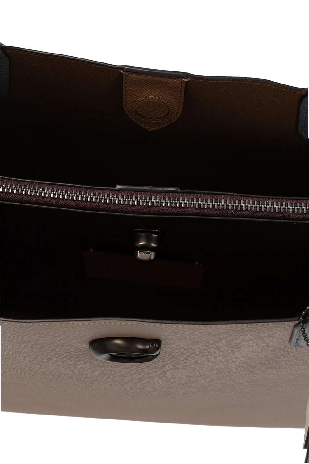 Beżowo-szara torba typu 'shopper', model 'Willow' Coach. Wykonana ze skóry o ziarnistej fakturze. Zamykana na dekoracyjne zamknięcie z logo oraz magnetyczne zamknięcie. Ozdobiona przeszyciami w kolorze białym. Dwie półokrągłe rączki. Warstwa wewnętrzna w kolorze fioletowo-brązowym. Wewnątrz komora z dwiema przegrodami i kieszenią zamykaną na zamek.