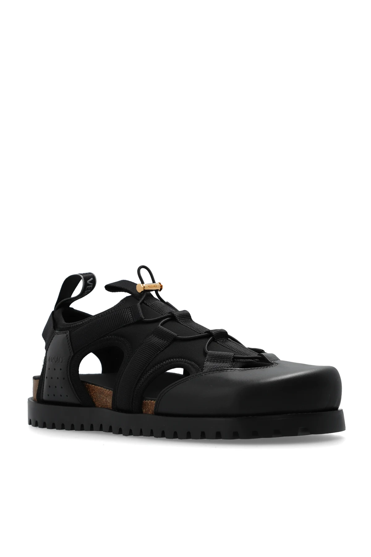 Czarne sandały Versace. Wykonane z gładkiej skóry i materiału. Z przodu system szybkiego sznurowania. Z boku wytłoczone logo. Z tyłu czarno-szary uchwyt z logo. Brązowa, korkowa podeszwa wykończona czarną gumą.