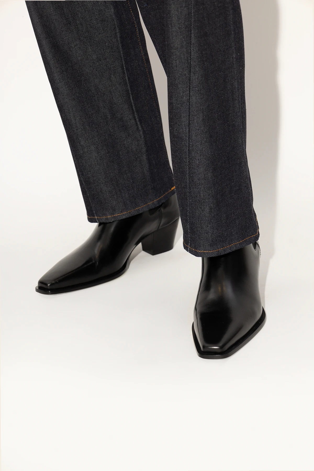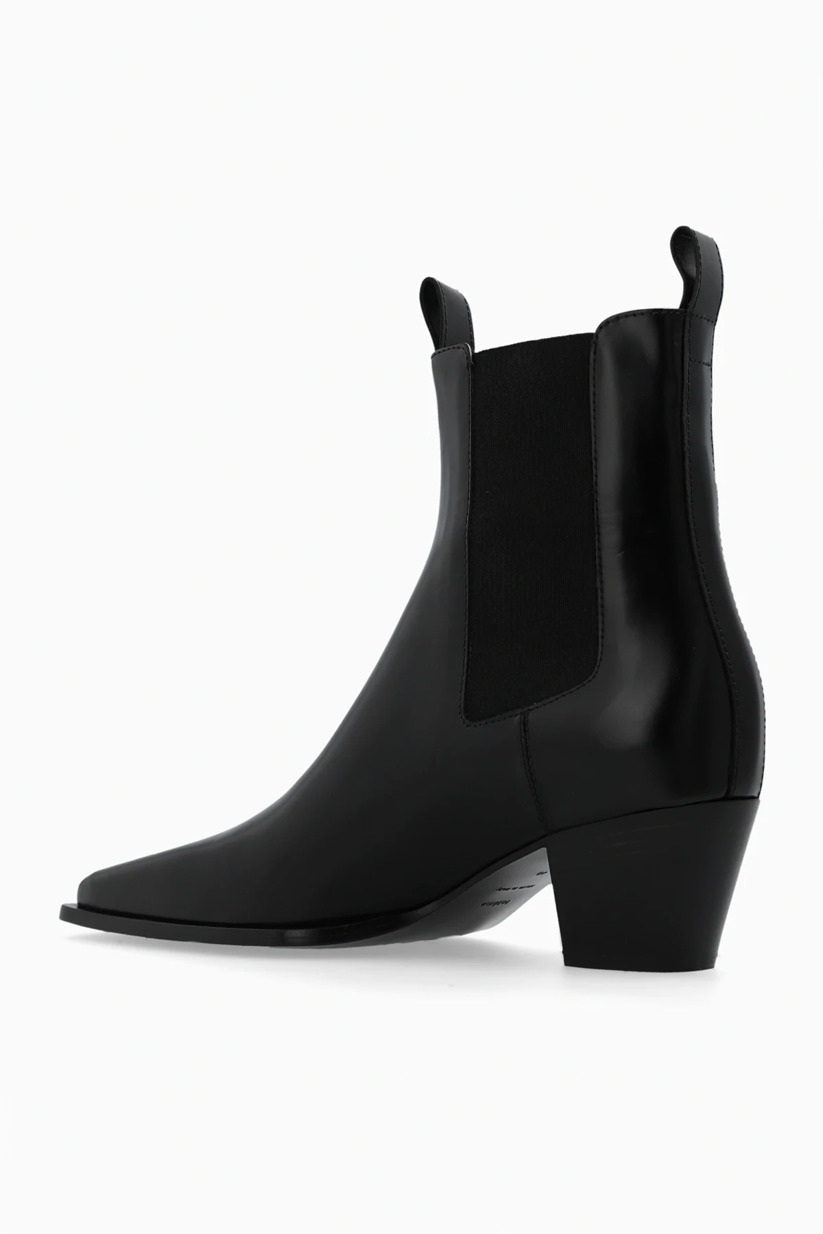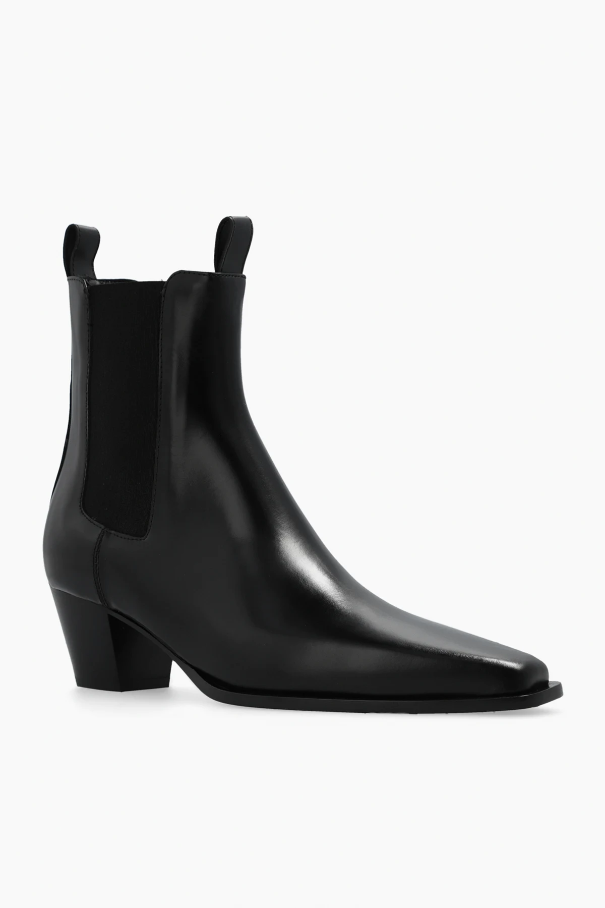 Czarne sztyblety na obcasie Toteme. Wykonane ze skóry. Po bokach wszyta guma. Czarna, skórzana podeszwa.