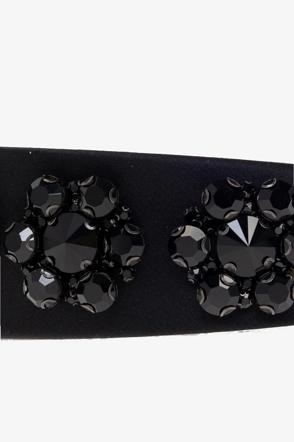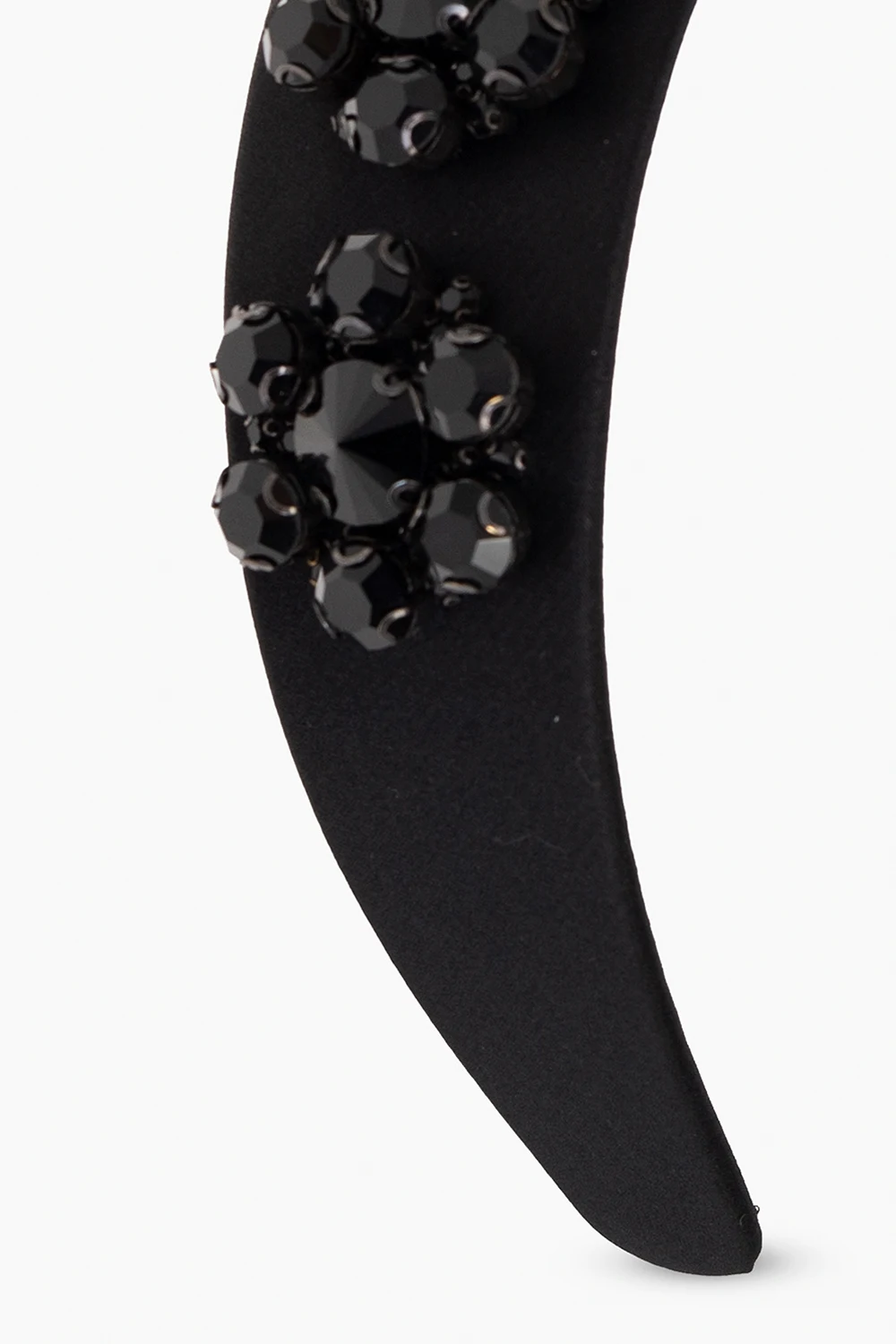 Czarna, satynowa opaska na głowę Erdem. Ozdobiona aplikacjami w kształcie kwiatów wykonanymi z połyskujących kamieni.