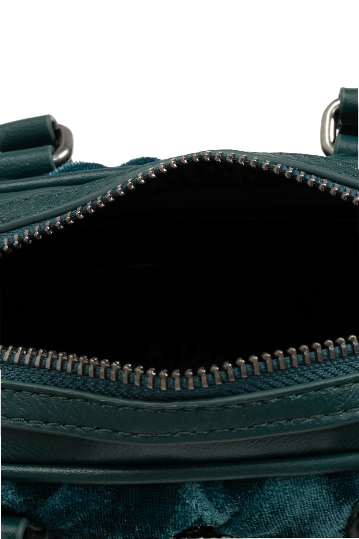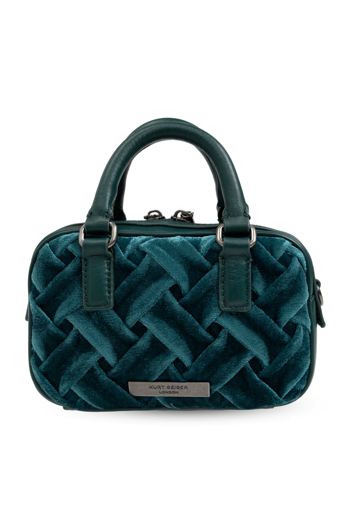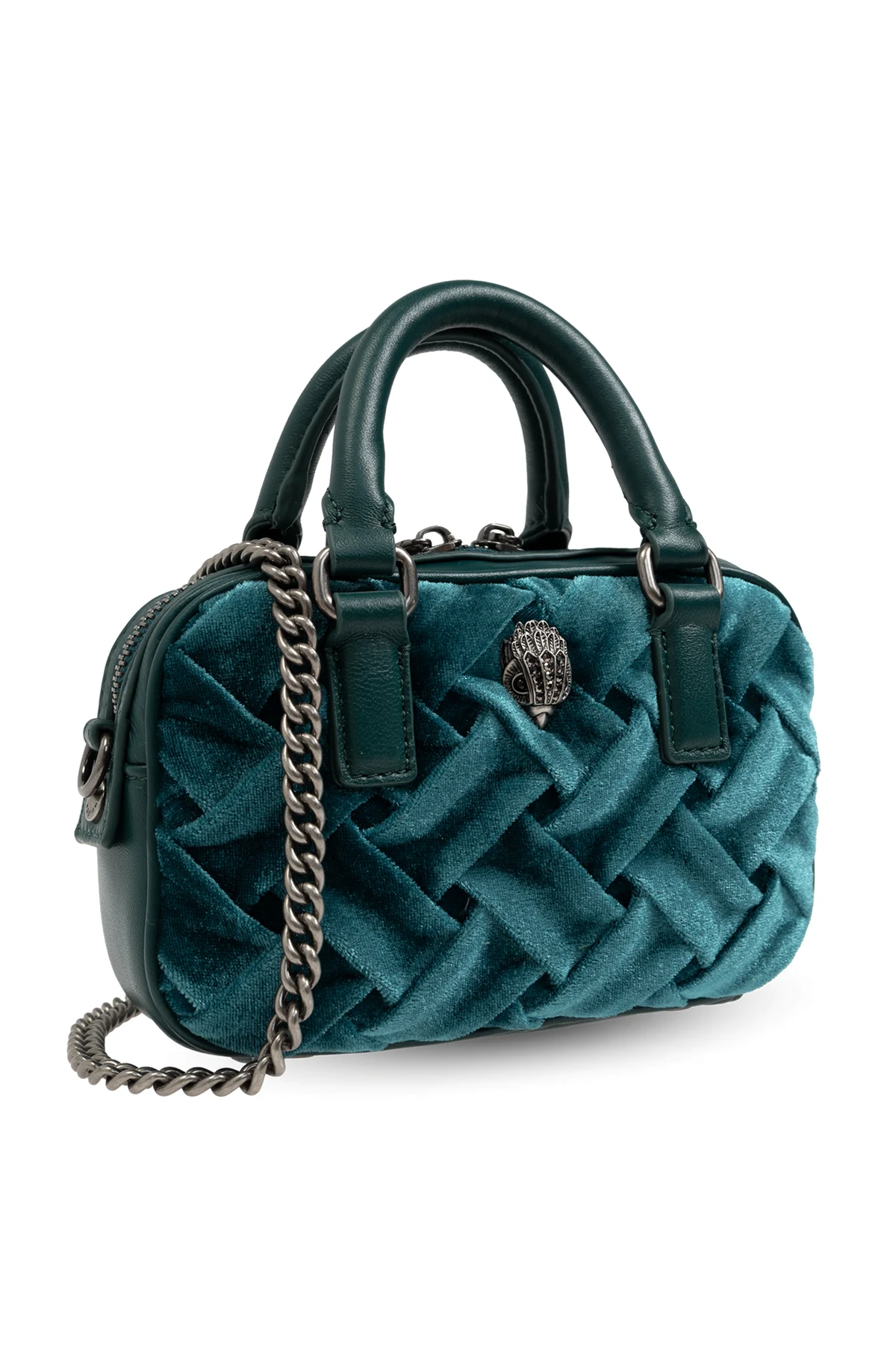 Torba ma kompaktowy, prostokątny kształt, który podkreśla jej praktyczność. Wykonana z zielonego weluru o plecionej strukturze, emanuje luksusem i unikalnością. Metalowy element dekoracyjny w kształcie głowy ptaka z ozdobnymi detalami na przedniej stronie oraz metalowa plakietka z wygrawerowanym logo projektanta na tylnej stronie, dodają jej niepowtarzalnego stylu.