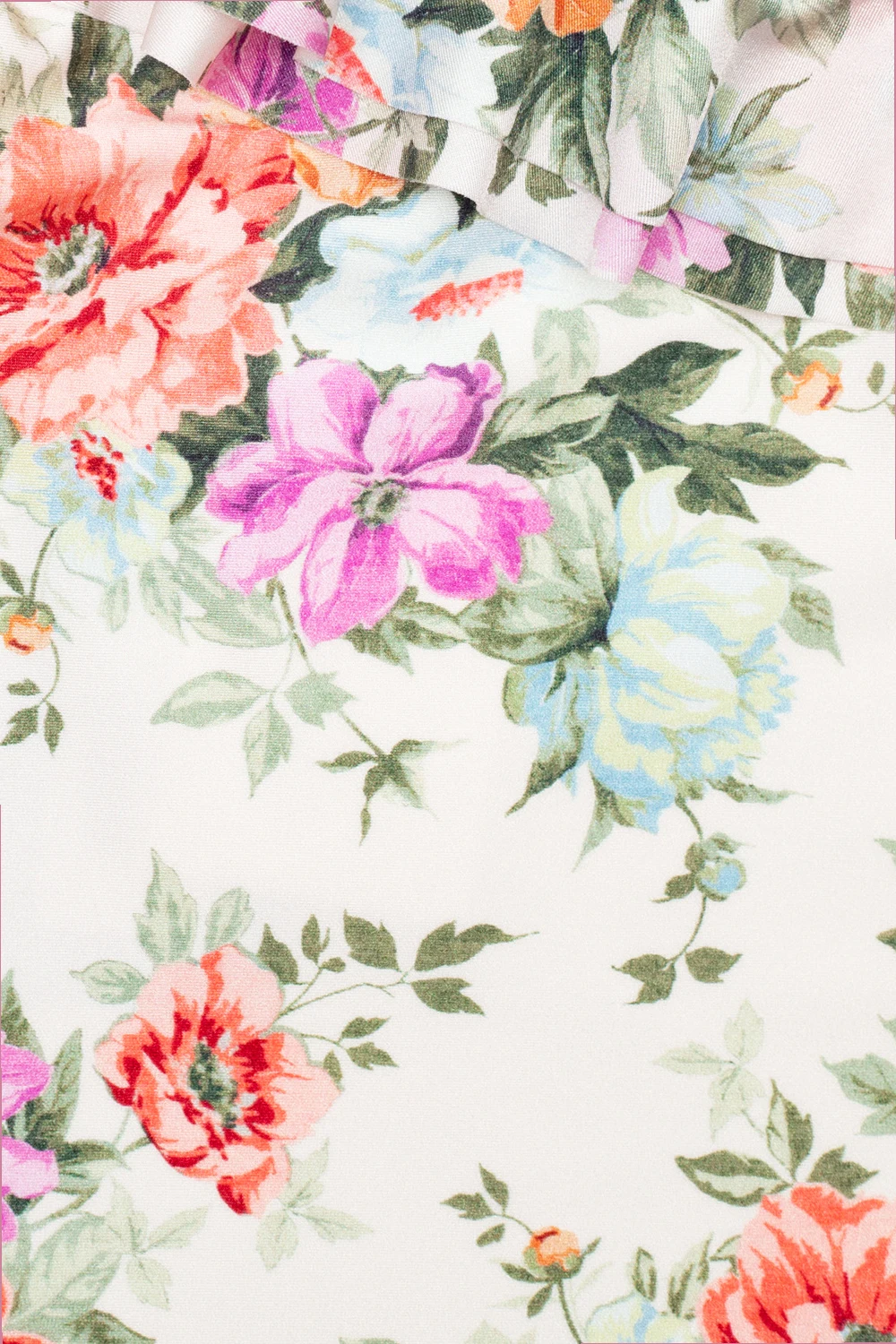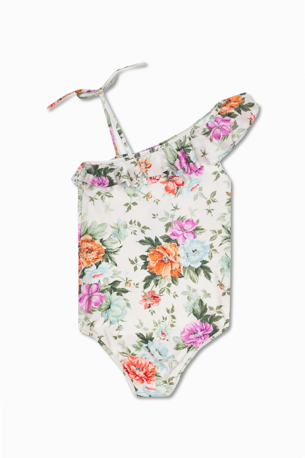 Kolorowy, jednoczęściowy kostium kąpielowy Zimmermann Kids. Ozdobiony nadrukiem z motywem kwiatowym. Jedno ramiączko z dekoracyjną kokardą. Dekoracyjna falbana.