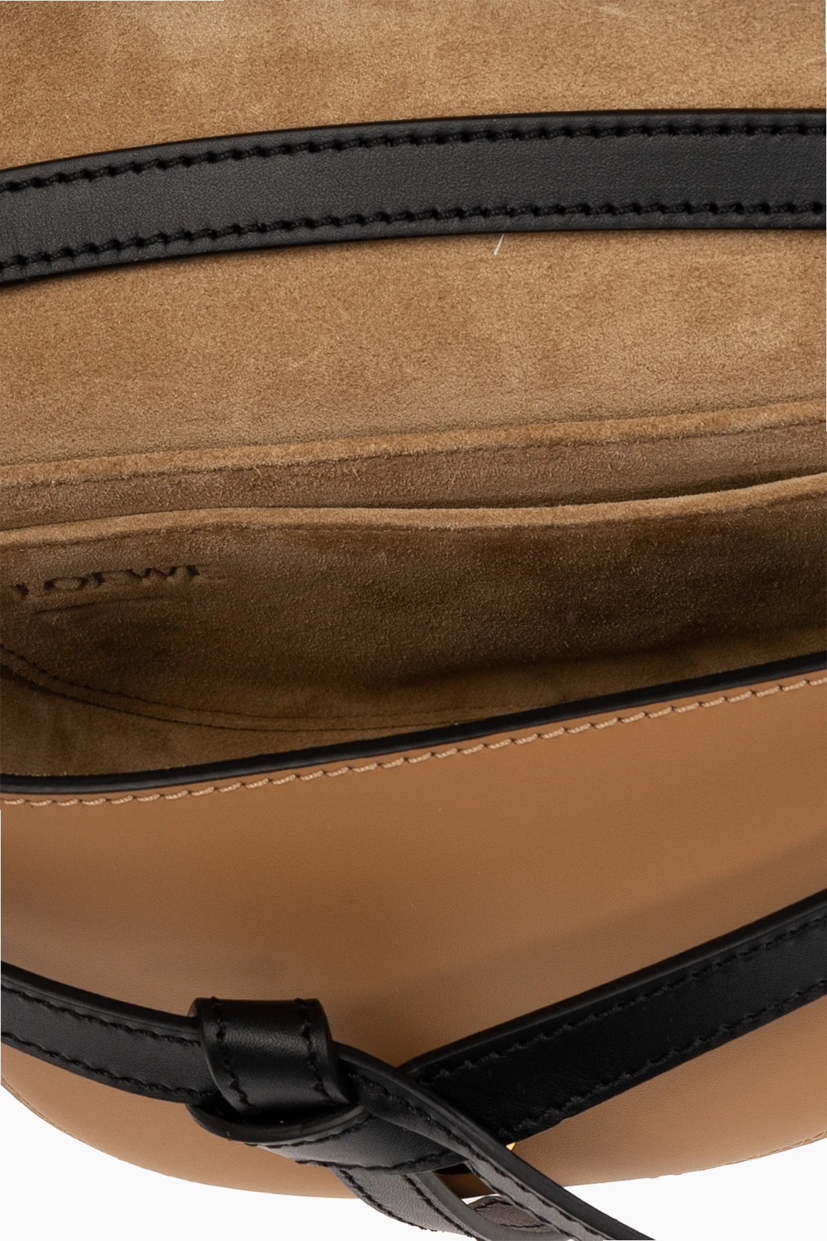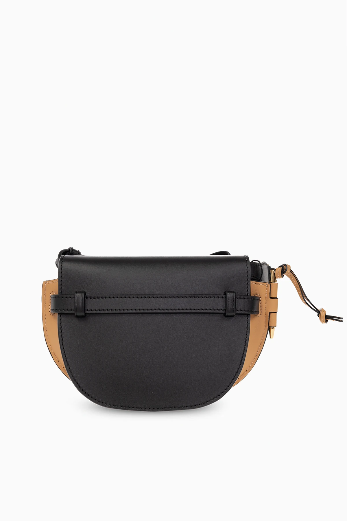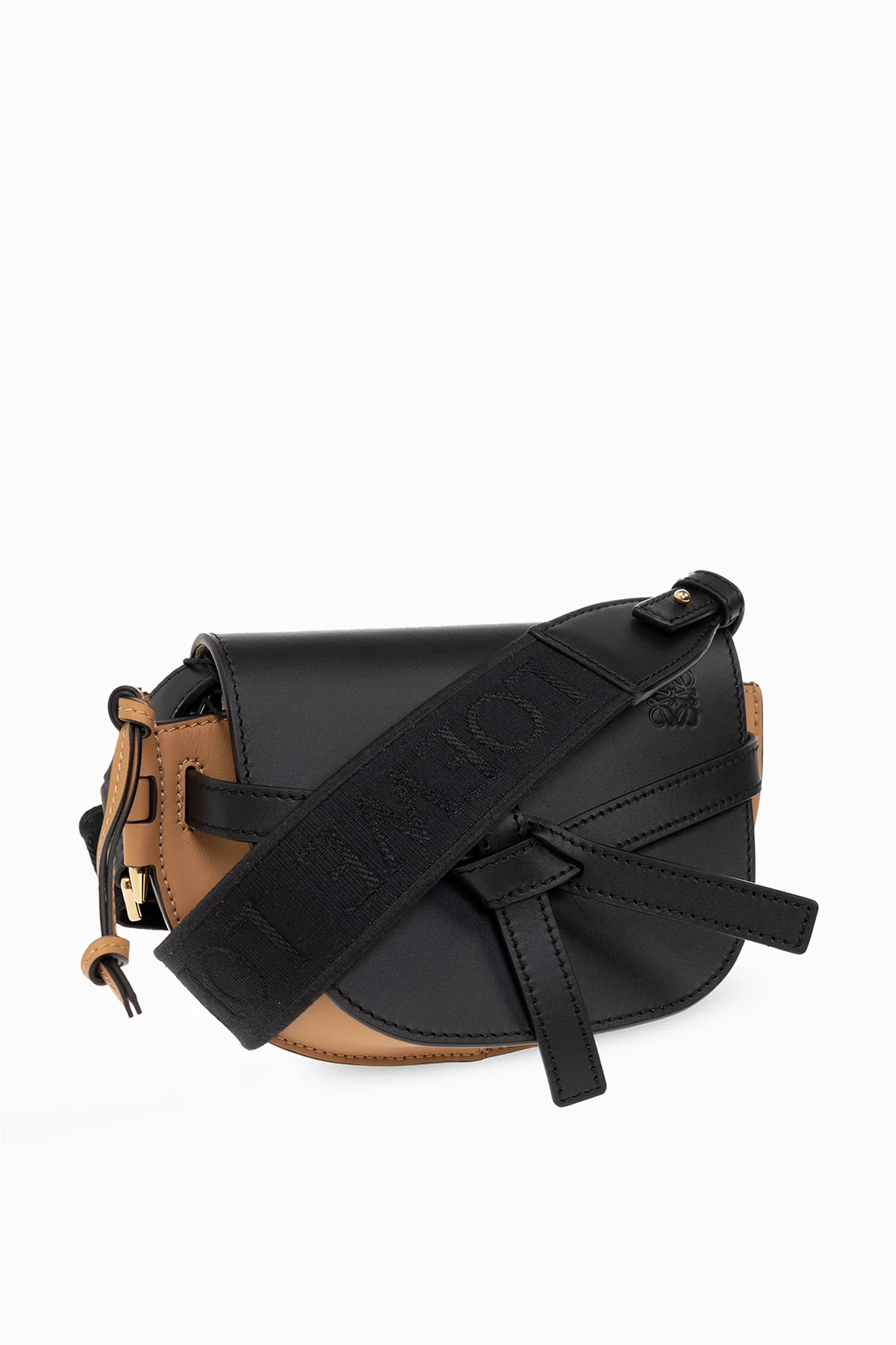 Czarno-brązowa torba na ramię, model 'Gate Dual Mini' Loewe. Wykonana ze skóry cielęcej. Zamykana na magnetyczny zatrzask. Ozdobiona wytłoczonym wzorem z monogramem. Z przodu dekoracyjny pasek z węzłem. Wewnątrz komora oraz wsuwana kieszeń. Odpinany, regulowany pas. Metalowe wykończenie w kolorze złotym. Możliwość noszenia jako torba na pas.