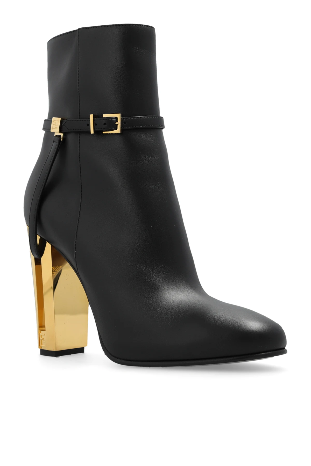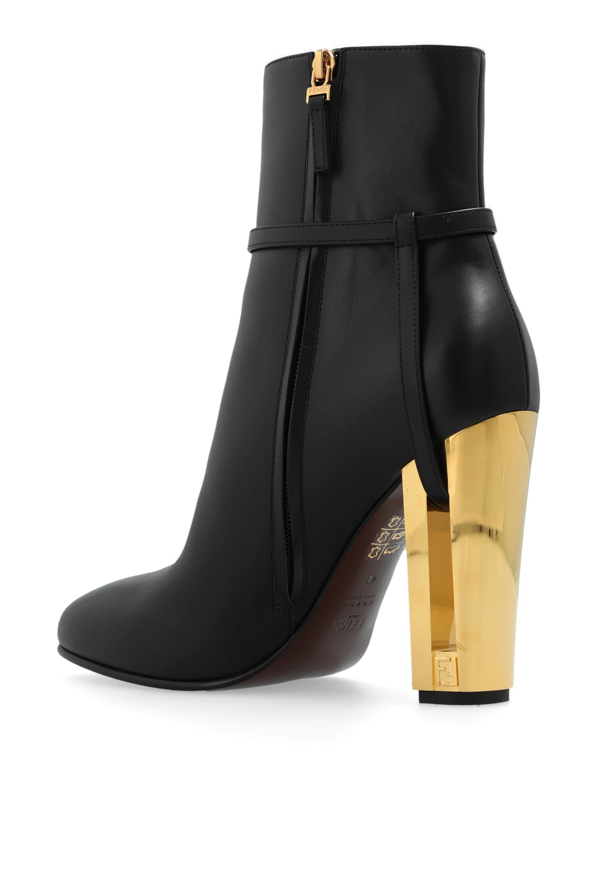 Czarne botki na obcasie, model ‘Delfina’ Fendi. Wykonane z gładkiej skóry cielęcej. Z boku zapinane na zamek. Ozdobione dekoracyjnym regulowanym paskiem z klamrą i aplikacją w kolorze złotym. Zaokrąglony nosek. Dekoracyjny obcas w kolorze złotym z logo. Ciemnobrązowa, skórzana podeszwa.