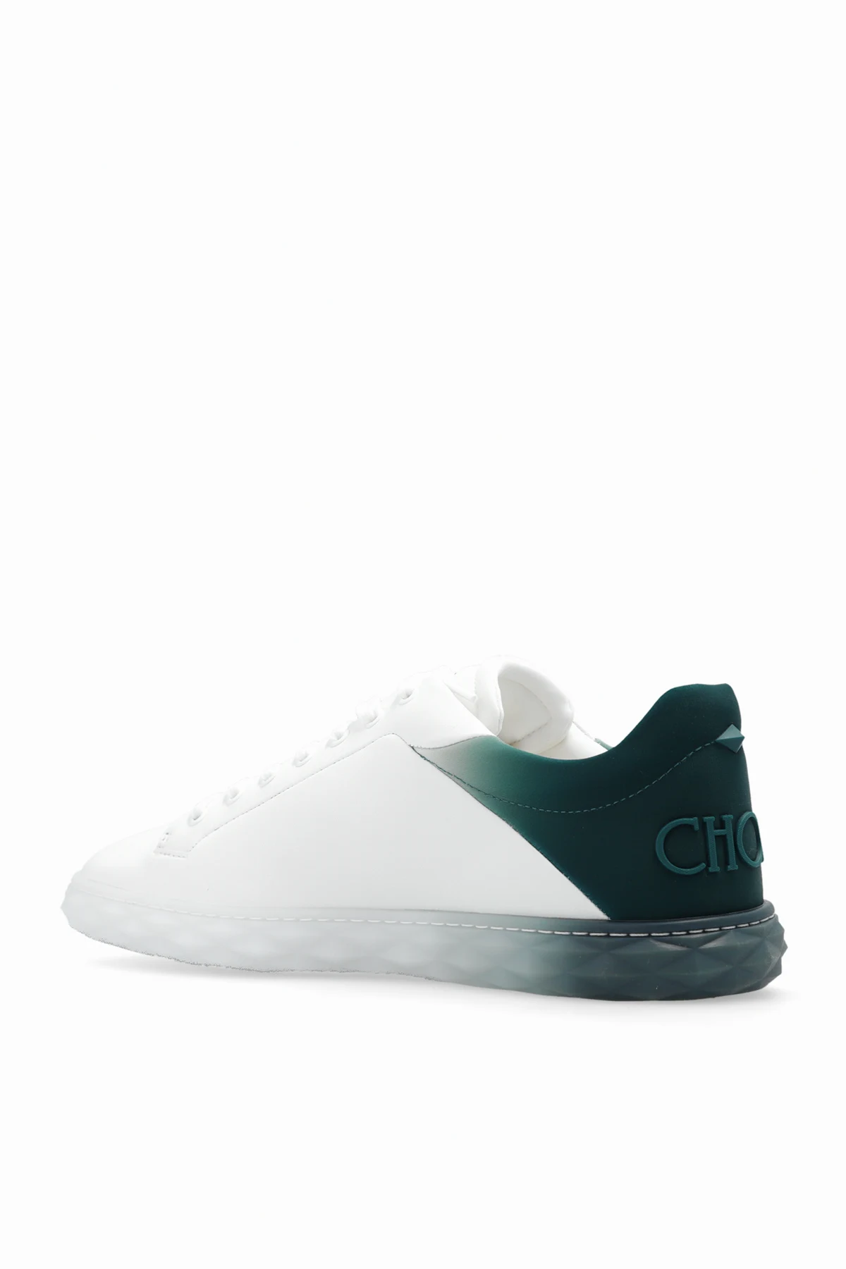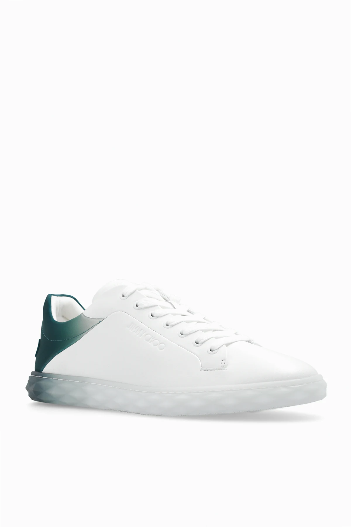 Białe, sznurowane buty sportowe, model ‘Diamond’ Jimmy Choo. Wykonane z gładkiej skóry. Wykończone ciemnozielonym materiałem z efektem gradientu. Ozdobione logo. Biało-zielona, gumowa podeszwa.