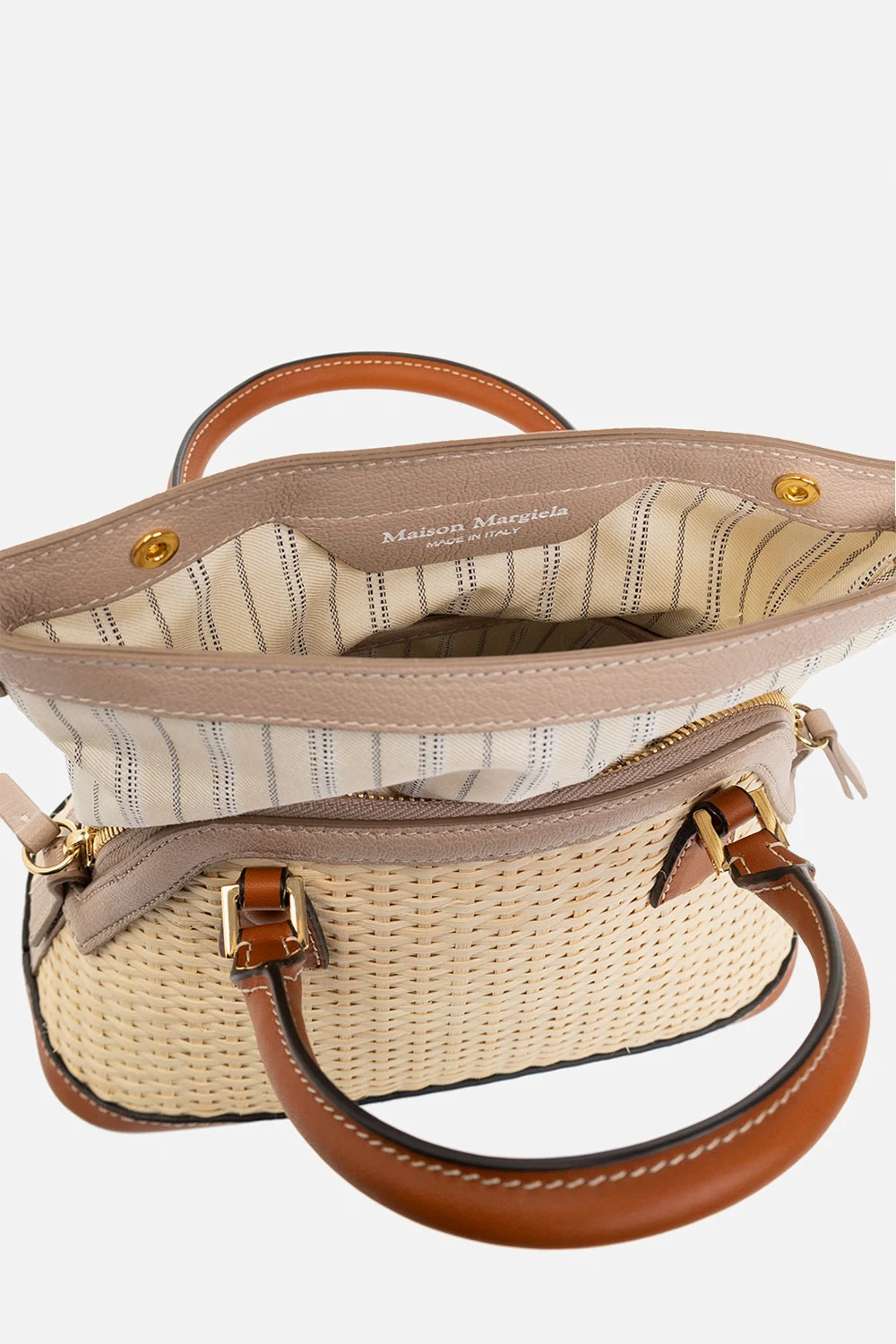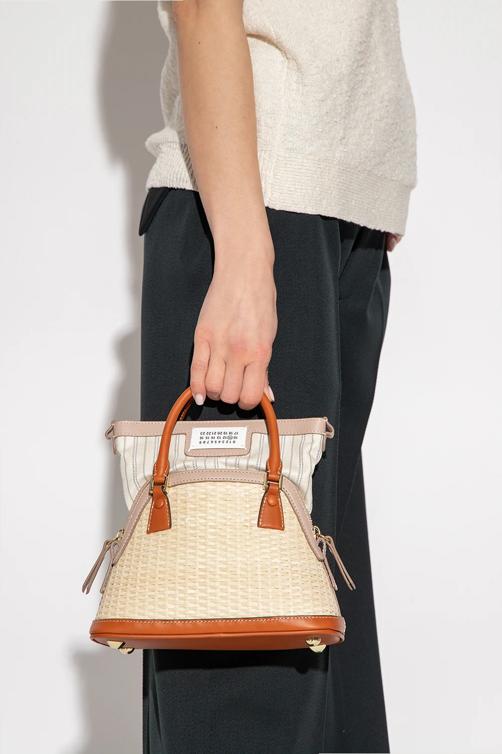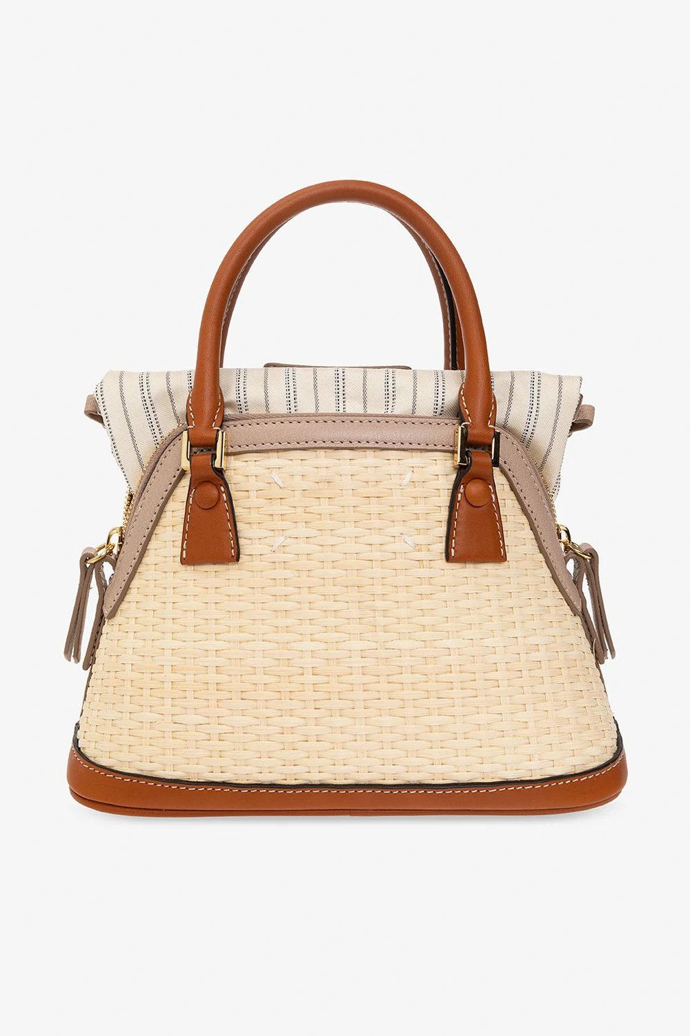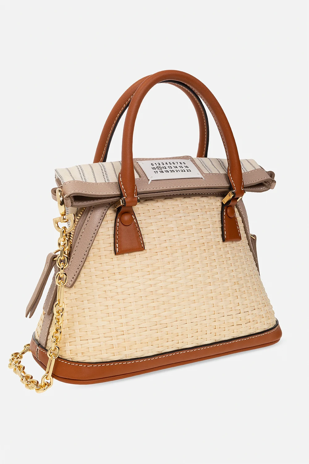 Beżowobrązowa torba na ramię, model '5AC' Maison Margiela. Wykonana z rafii. Wykończona skórą cielęcą w kolorze brązowym. Zamykana na dwubiegunowy zamek oraz podwójne zatrzaski. Z przodu ozdobiona białą naszywką z logo. Dwie półokrągłe rączki. Odpinany łańcuch na ramię. Wewnątrz komora. Metalowe wykończenie w kolorze złotym.