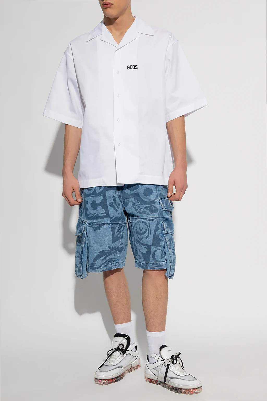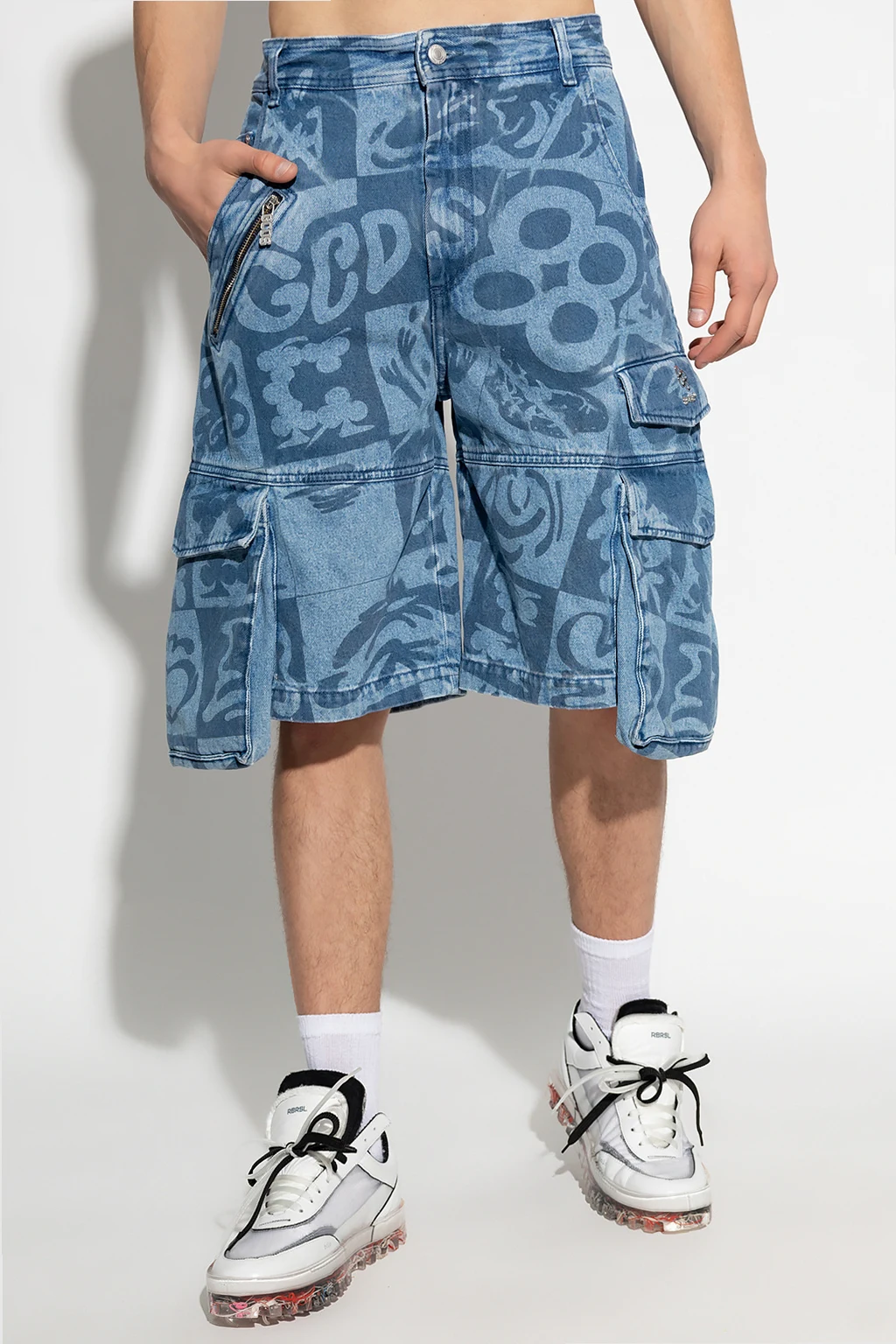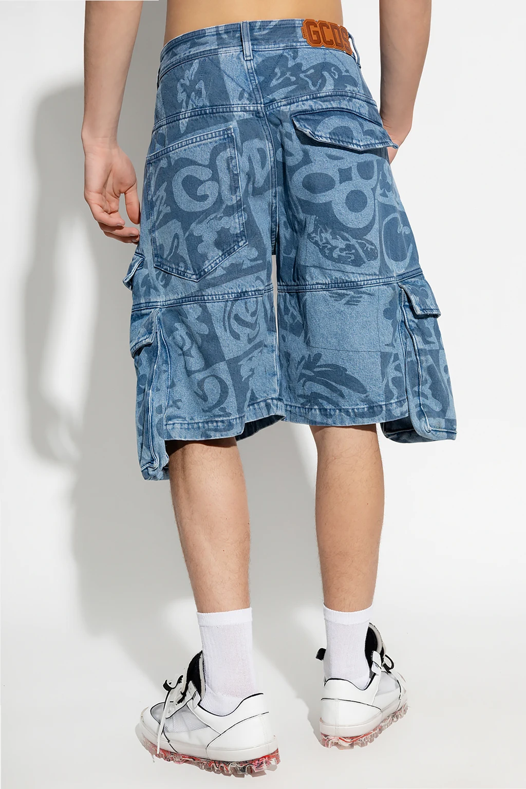 Niebieskie, jeansowe szorty GCDS. Zapinane na guzik oraz zamek. Ozdobione wzorem z motywem logo. Z tyłu naszywka w kolorze brązowym. Z przodu metalowa aplikacja z logo w kolorze srebrnym. Dziewięć kieszeni: z przodu trzy wsuwane, trzy z patkami oraz zamykana na zamek, z tyłu kieszeń wsuwana i z patką.