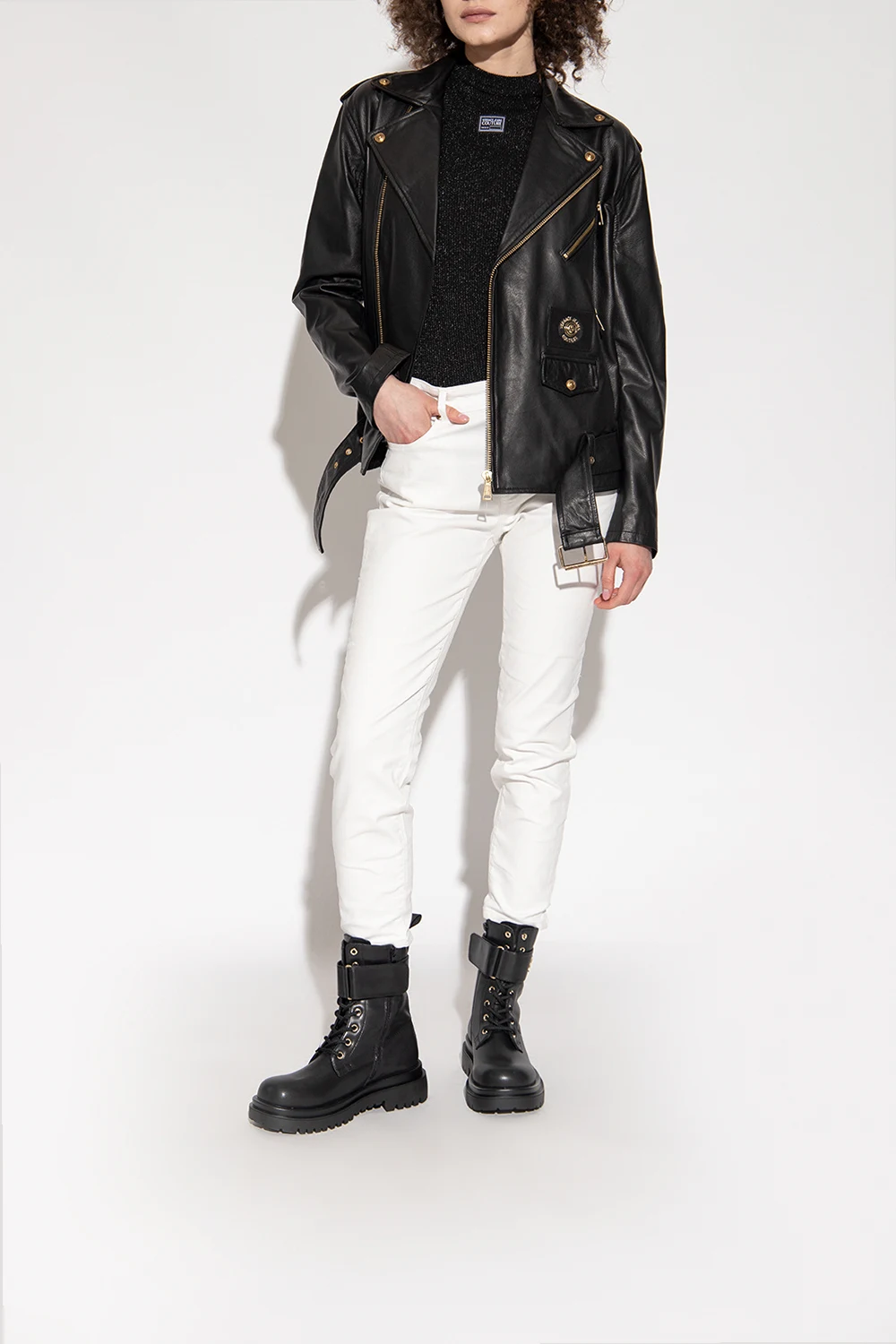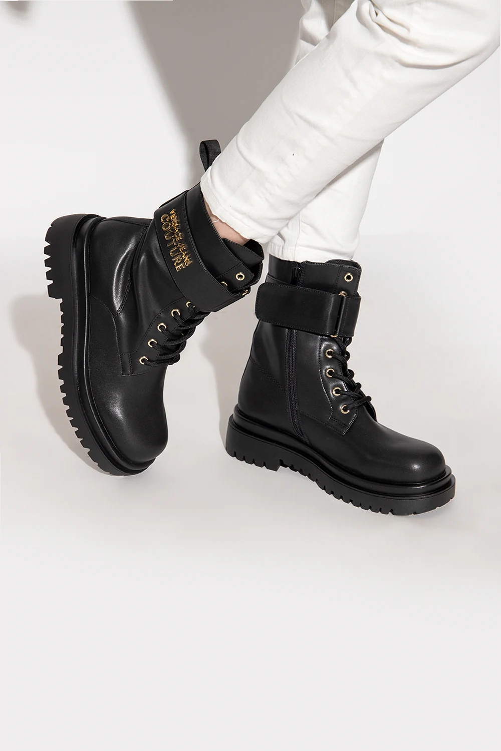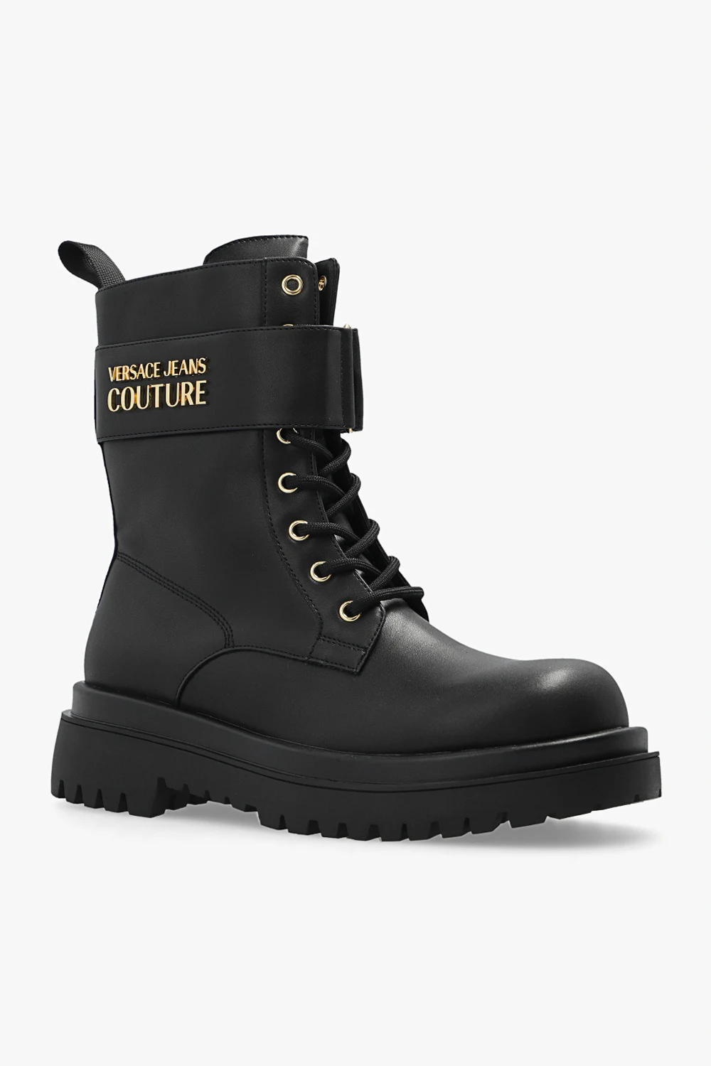 Czarne buty typu ‘combat’ Versace Jeans Couture. Wykonane z materiału imitującego skórę. Sznurowane i z boku zapinane na zamek. Wokół kostki dekoracyjny pasek zapinany na rzep, ozdobiony metalowym logo w kolorze złotym. Czarna, gumowa podeszwa.