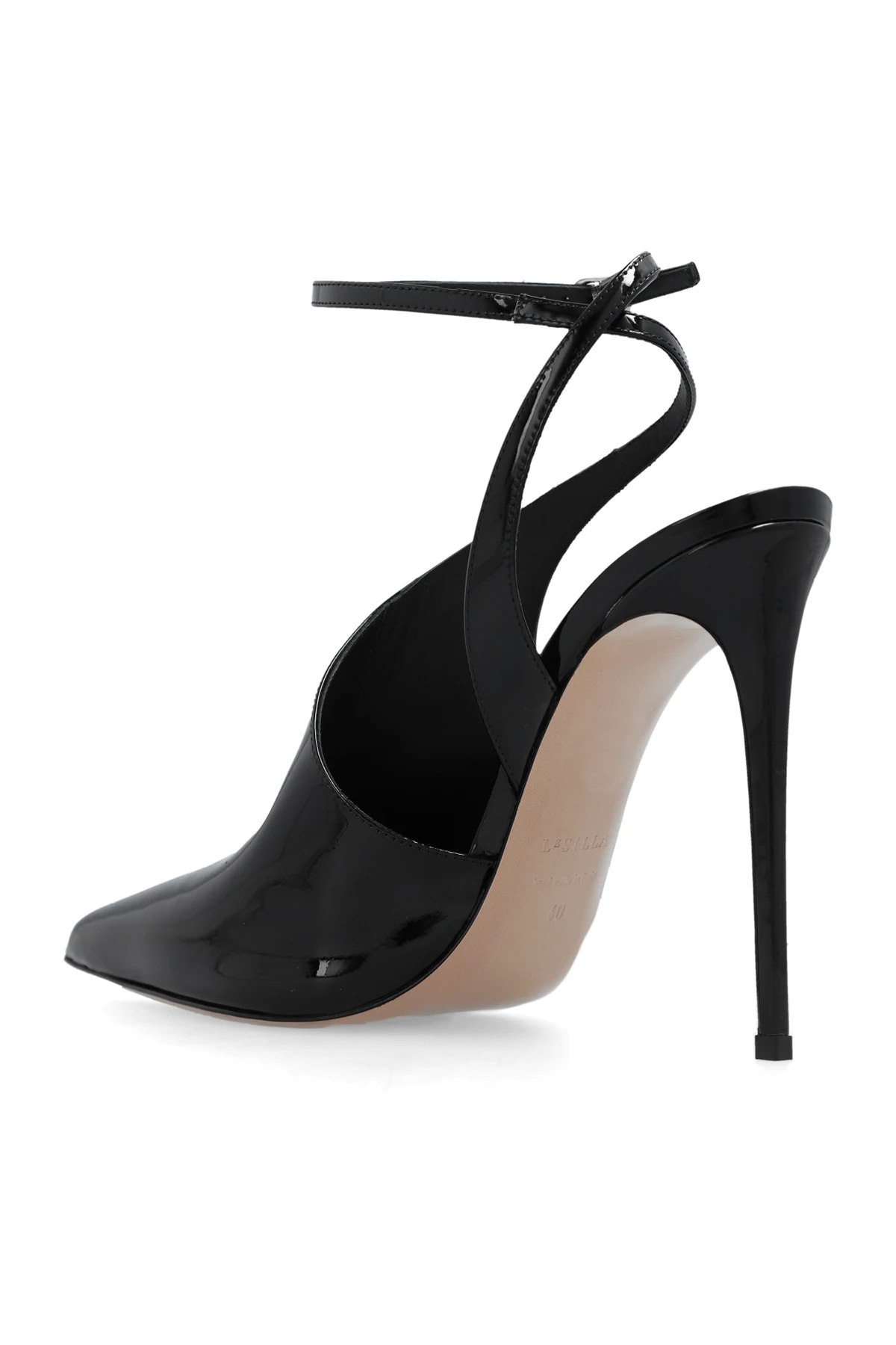Czarne buty na obcasie, model ‘Futura’ Le Silla. Wykonane z lakierowanej skóry. Nosek w szpic. Wokół kostki zapinane na regulowany pasek z klamrą. Podeszwa wykonana ze skóry oraz gumy w kolorze jasnobeżowym.