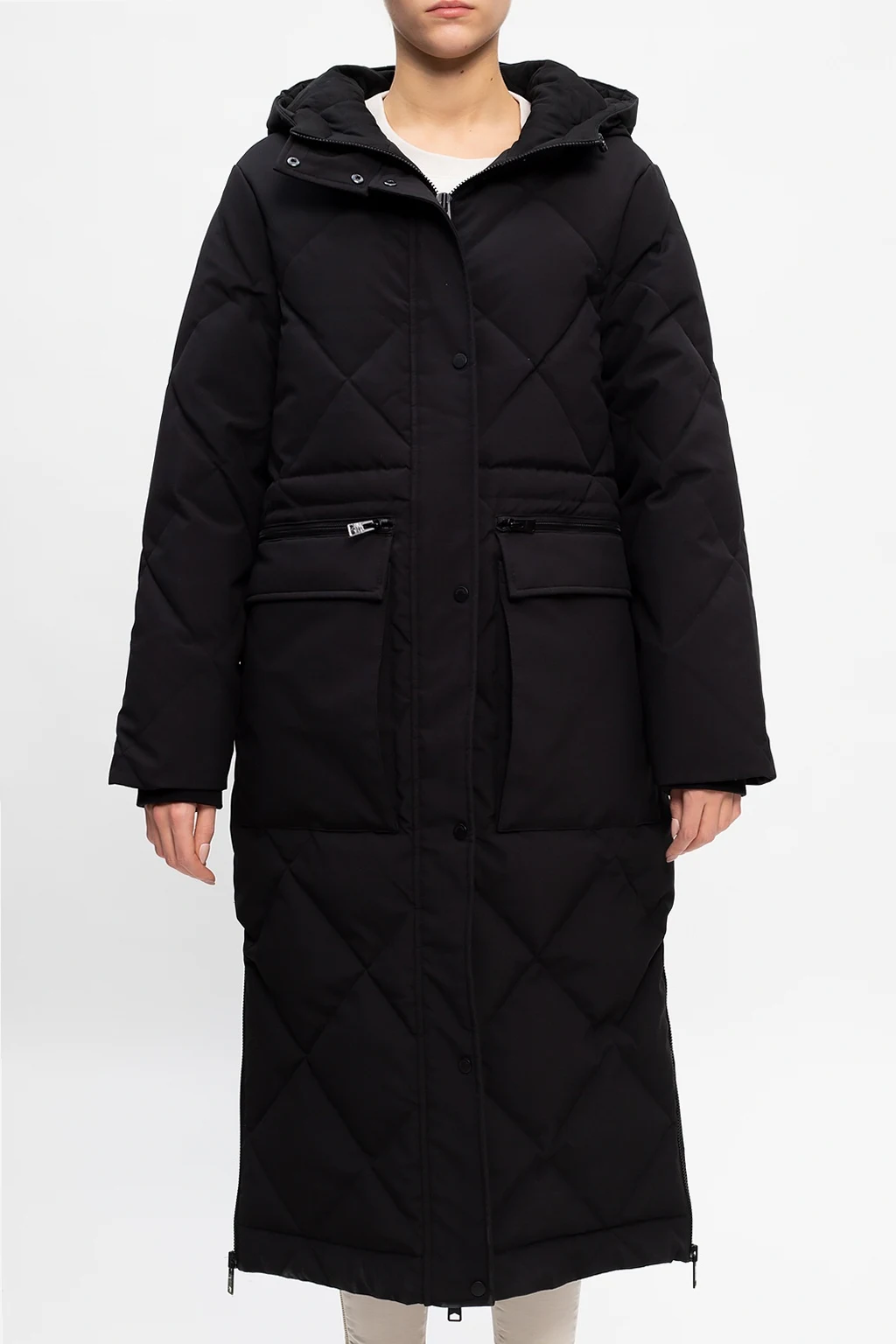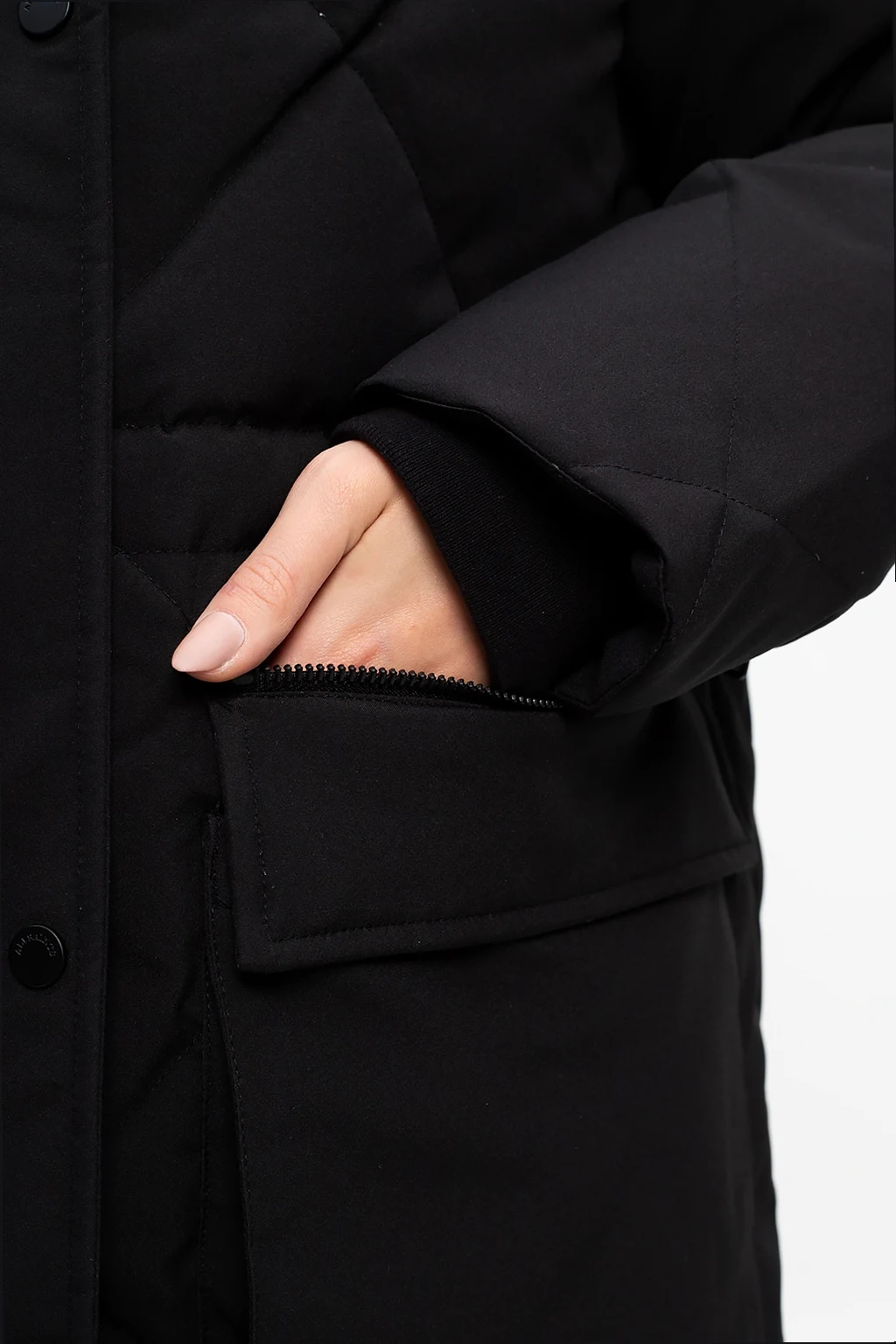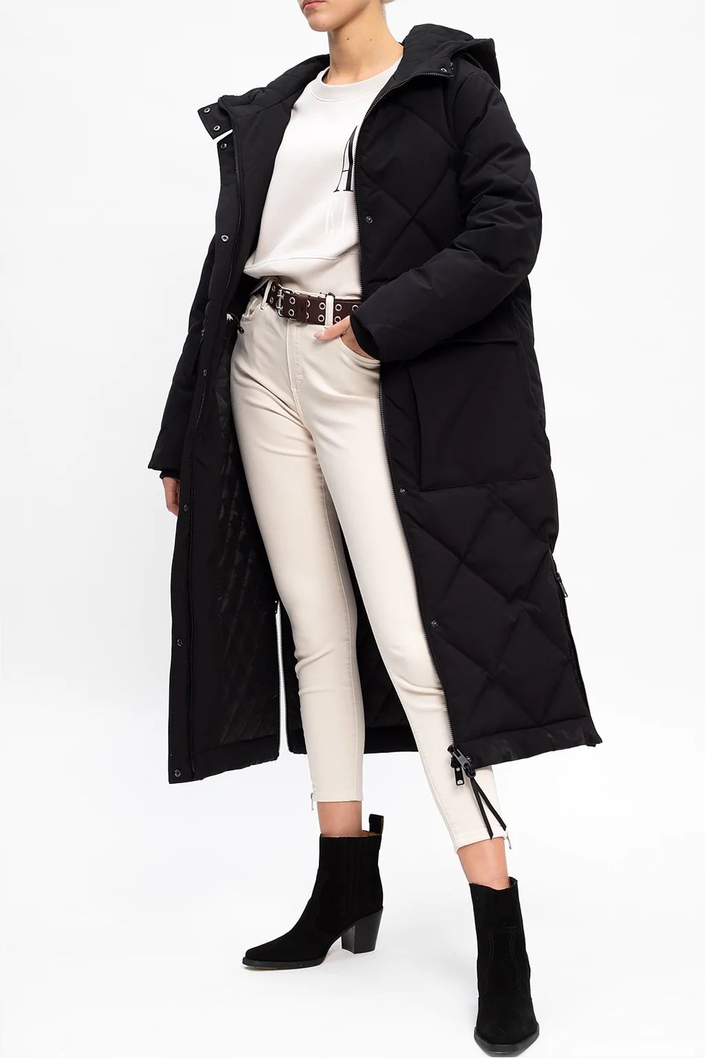 Czarny, puchowy płaszcz z kapturem, model 'Lucie' AllSaints. Zapinany na dwubiegunowy zamek oraz na zatrzaski. Kaptur ściągany trokami. Z przodu dwie kieszenie z patką zapinane na zatrzaski oraz dwie kieszenie zapinane na zamek. Rękawy zakończone ściągaczami. Po bokach wszyte zamki.
