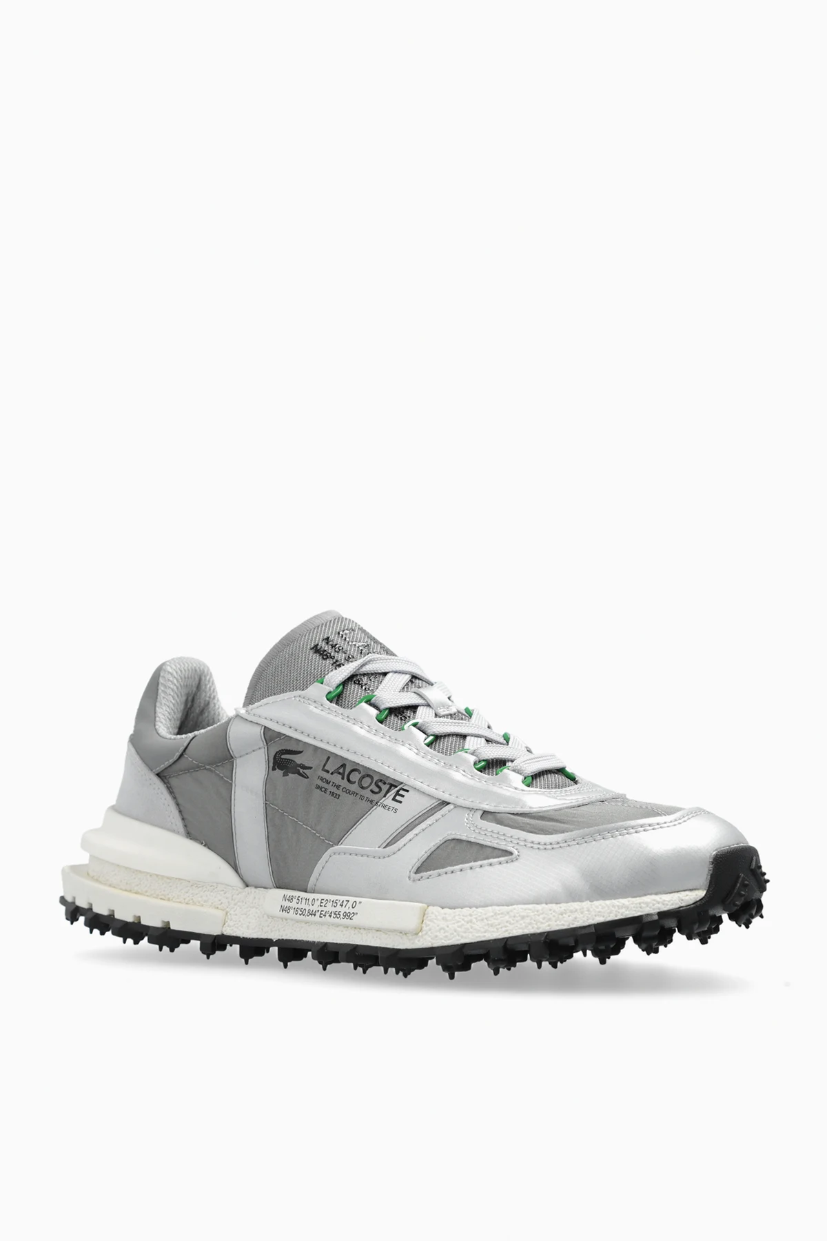 Sznurowane buty sportowe w kolorze srebrnym, model ‘Elite Active’ Lacoste. Wykonane z materiału i wykończone skórą. Ozdobione nadrukami z logo w kolorze czarnym. Biało-czarna, gumowa podeszwa z bieżnikiem.