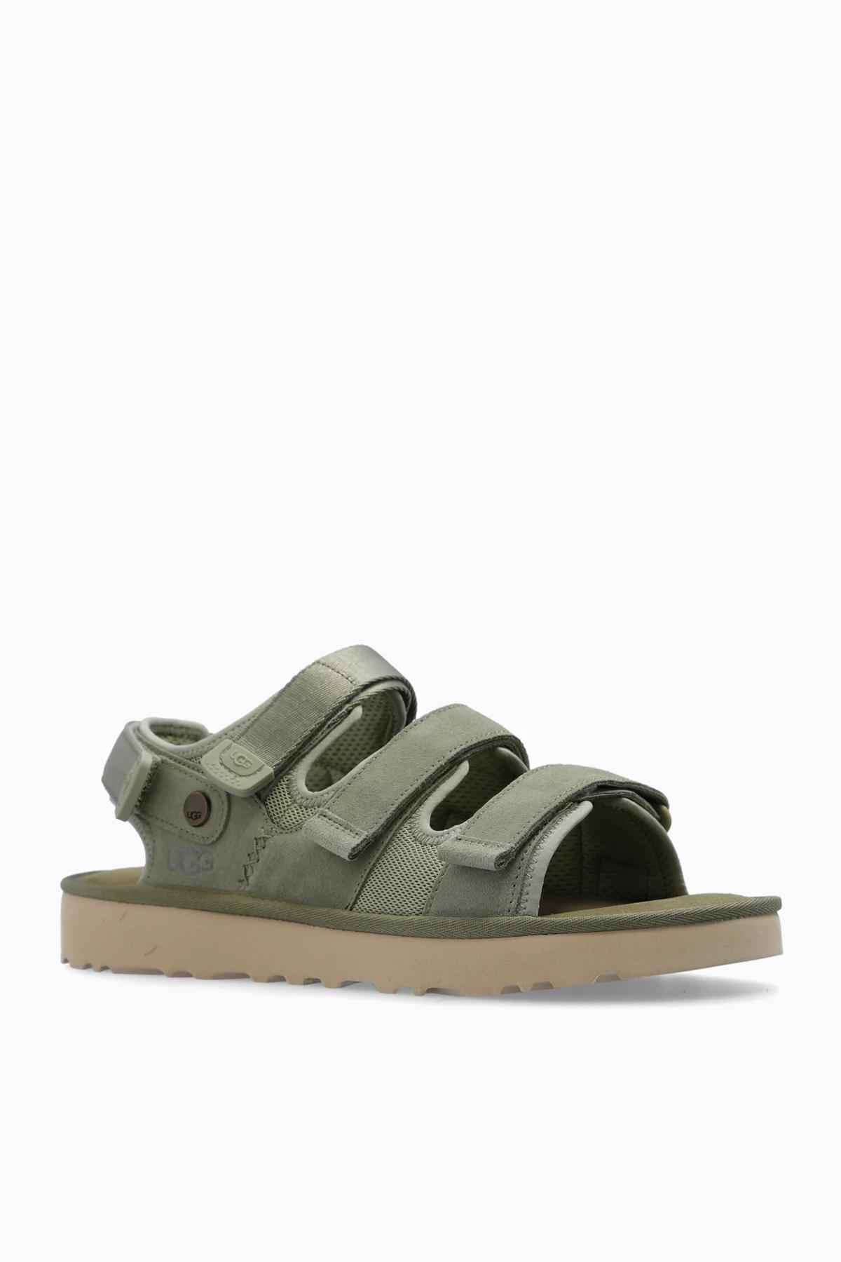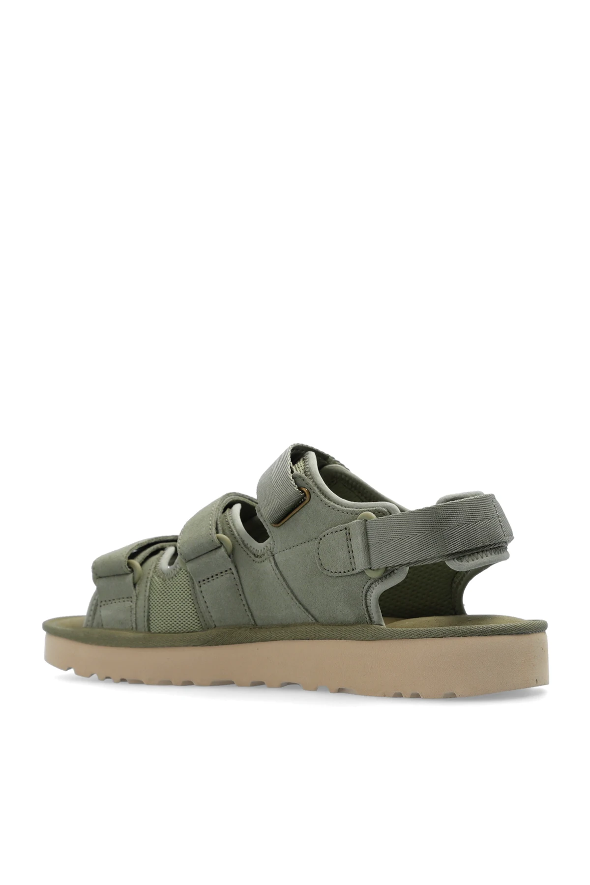 Zielone sandały, model ‘Goldencoast’ UGG. Wykonane z zamszu i materiału. Zapinane na rzepy. Z boku wytłoczone logo. Czarna, gumowa podeszwa.