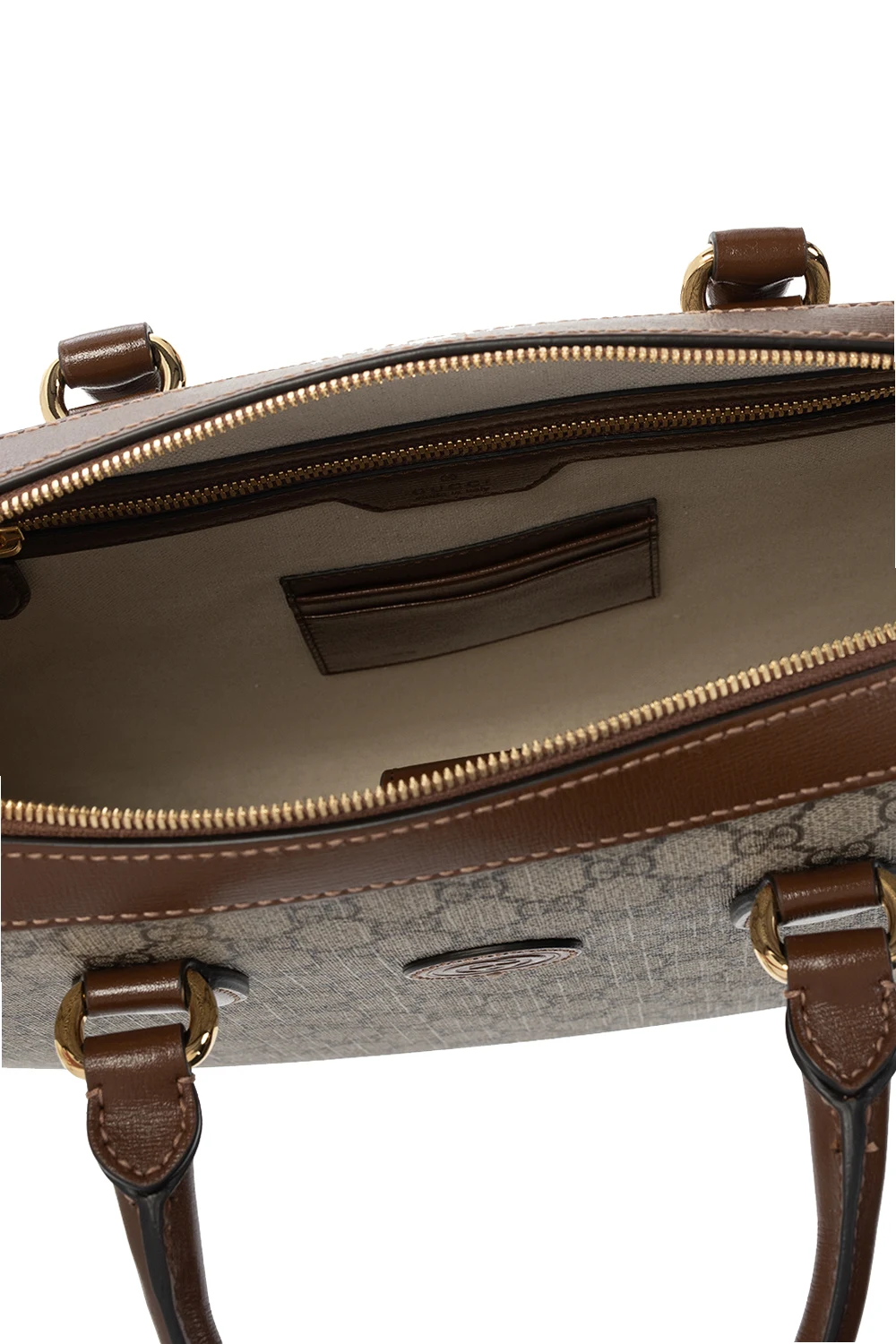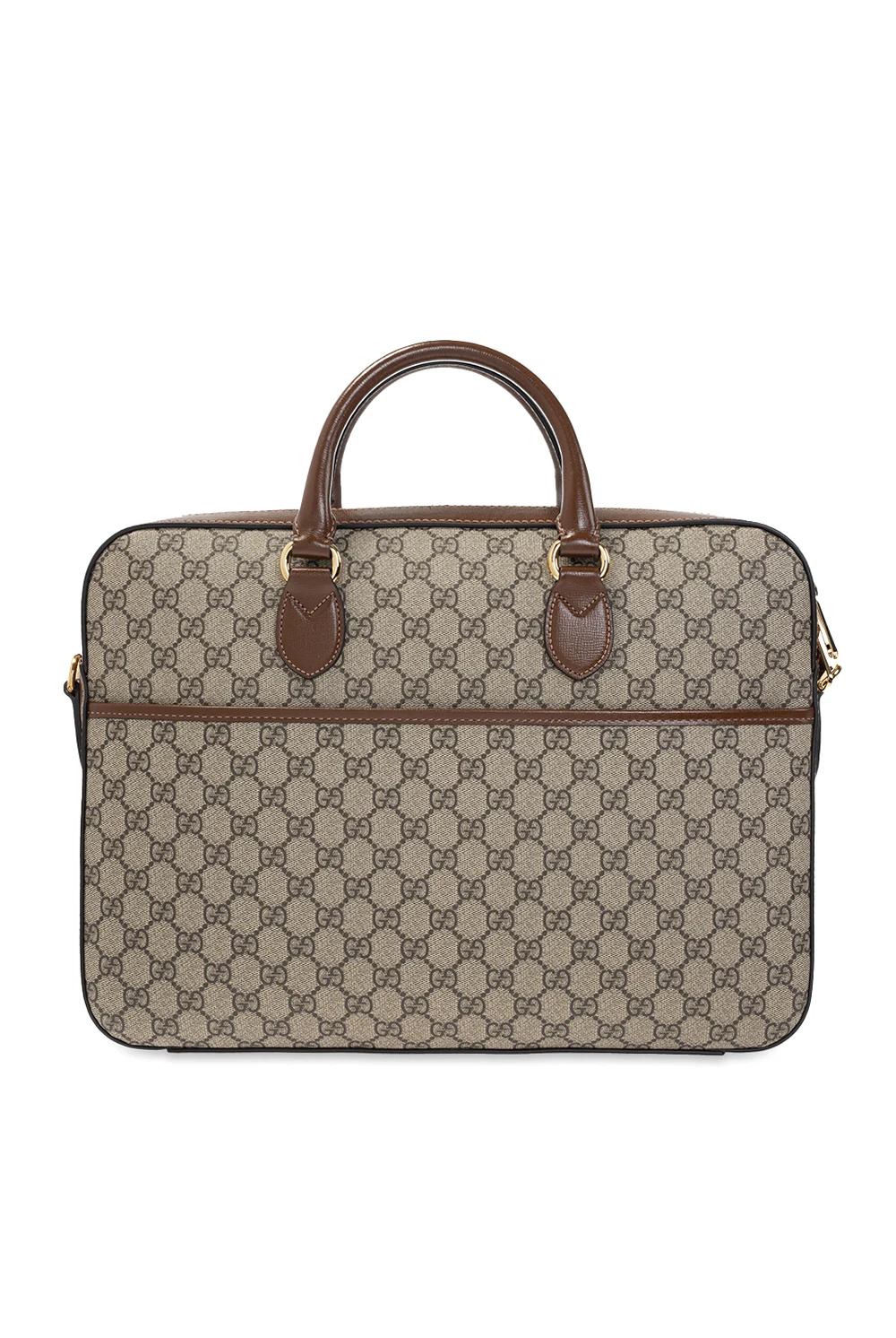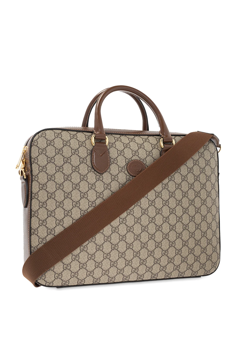 Beżowo-brązowa aktówka, model ‘GG Retro’ Gucci. Wykonana ze skóry cielęcej oraz płótna ‘GG Supreme’. Zamykana na zamek. Ozdobiona skórzaną naszywką z logo. Z tyłu kieszeń zamykana na magnetyczny zatrzask. Odpinany pasek na ramię z możliwością regulacji długości. Warstwa wewnętrzna w kolorze beżowym. Wewnątrz komora, przegroda na laptopa, dwa miejsca na karty oraz kieszeń zamykana na zamek. Metalowe elementy w kolorze złotym.