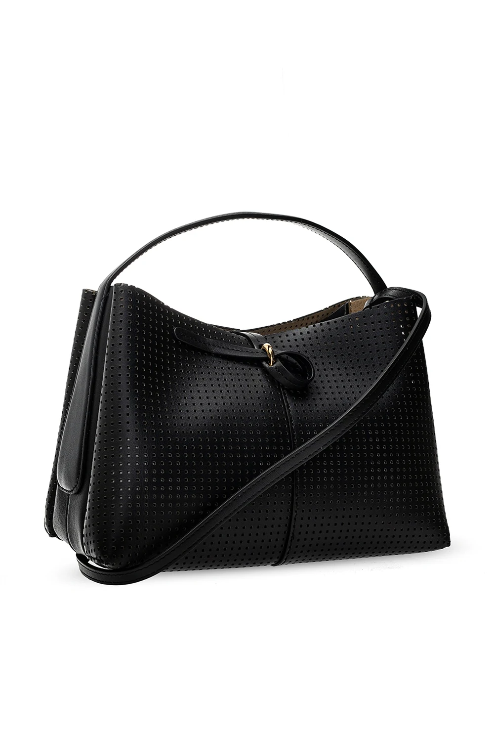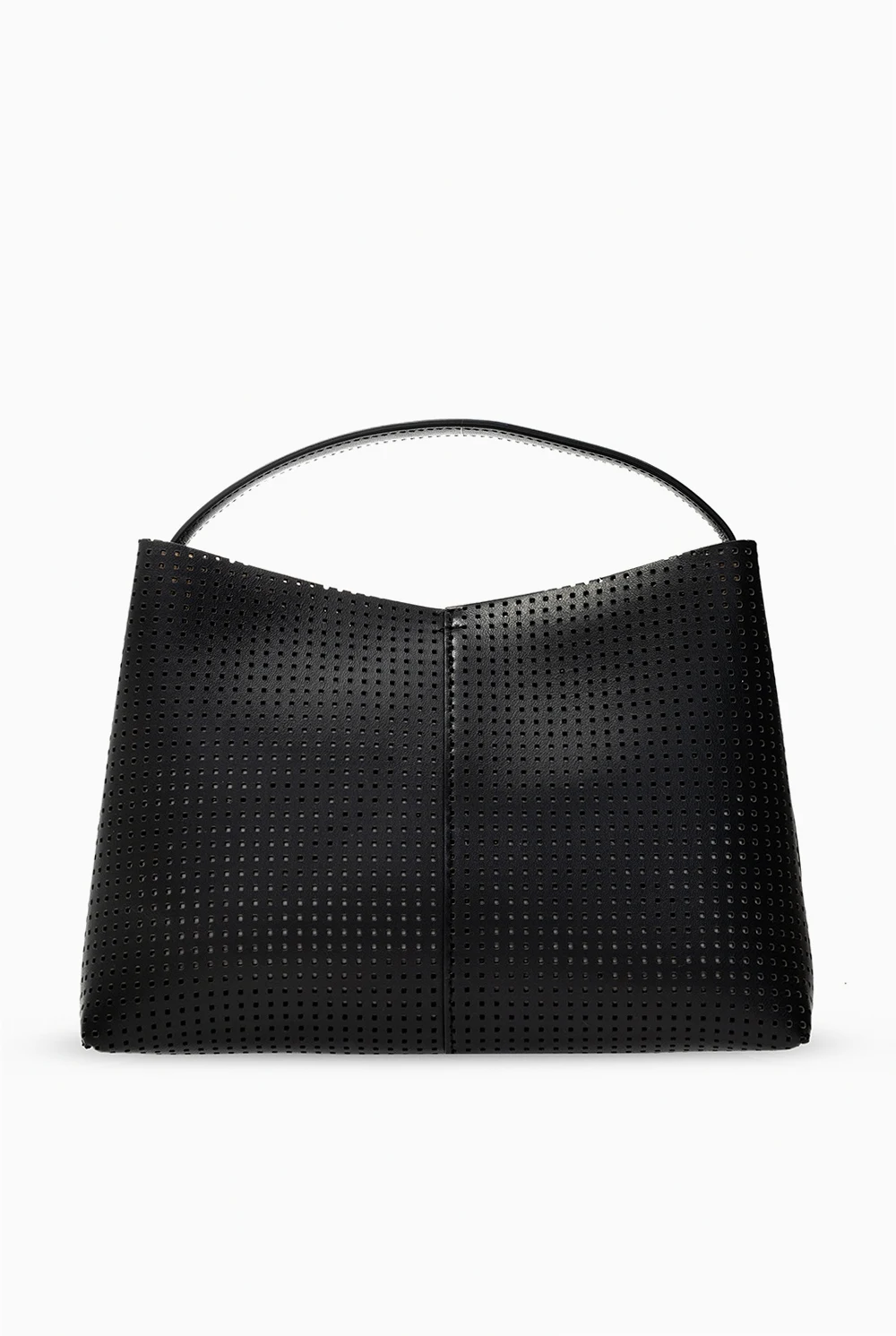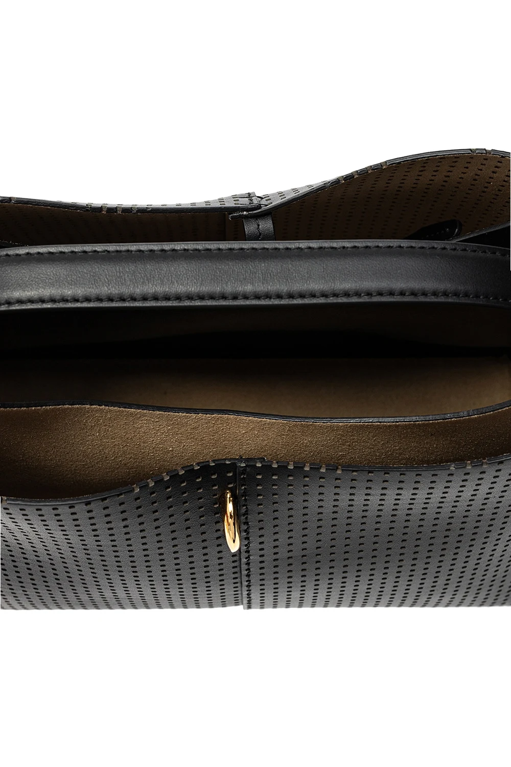 Czarna, perforowana torba na ramię typu ’tote’, model ‘Ava’ Wandler. Wykonana ze skóry bydlęcej. Regulowany pasek. Zamszowe wnętrze. Wewnątrz trzy oddzielne komory. Metalowe elementy w kolorze złotym.