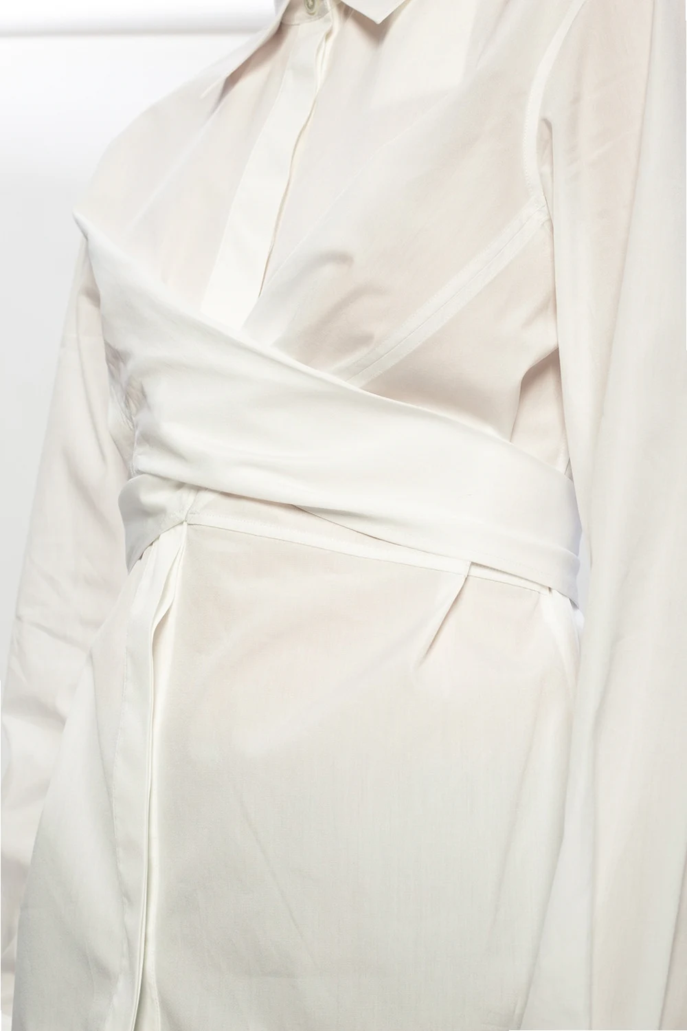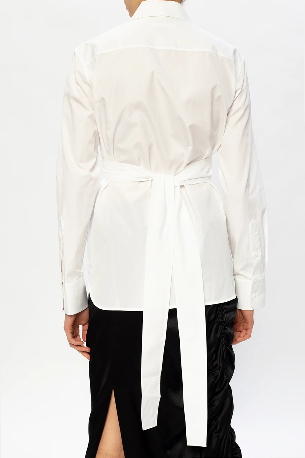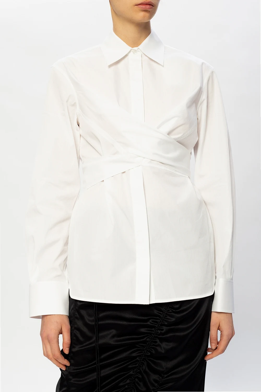 Biała koszula Helmut Lang. Wykonana z bawełny. Zapinana na guziki z krytą plisą. Z przodu wiązanie. Rękawy zakończone mankietami.