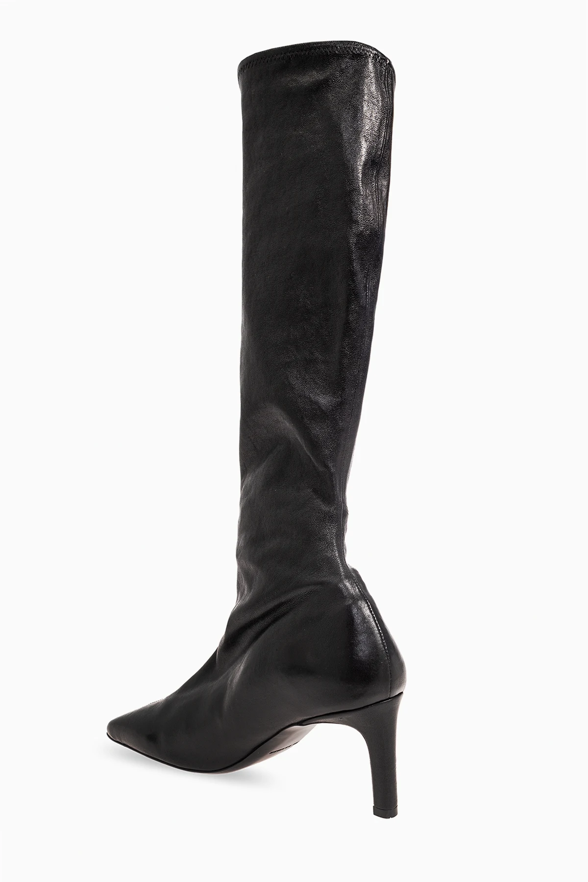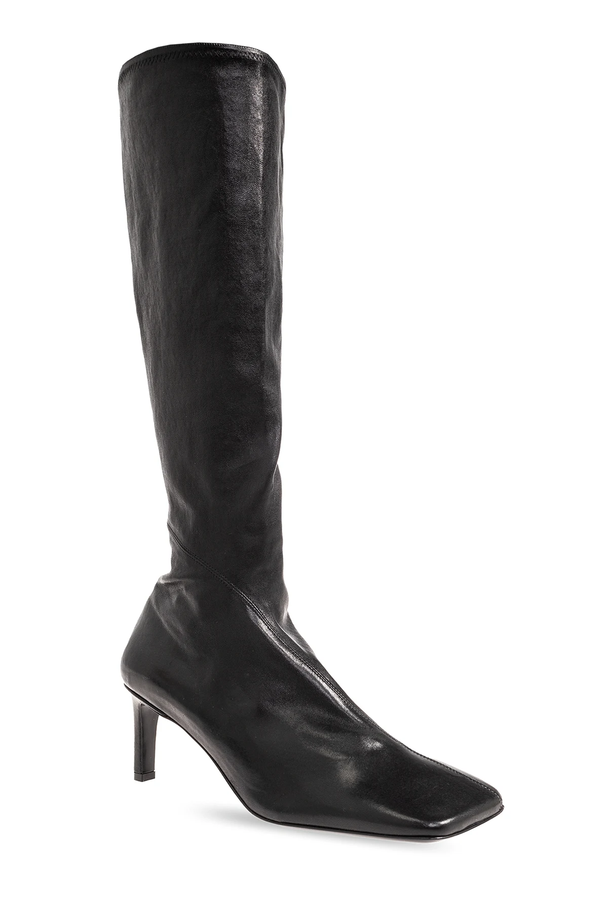 Czarne, wsuwane kozaki na obcasie JIL SANDER. Wykonane ze skóry o lekko połyskującym wykończeniu. Kwadratowy, ścięty nosek. Czarna, skórzana podeszwa.