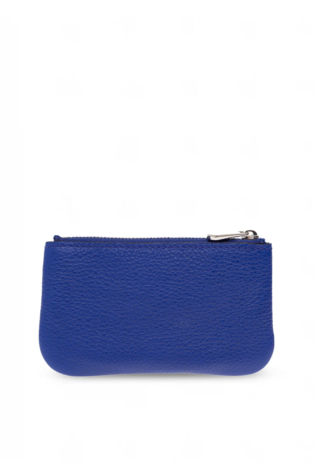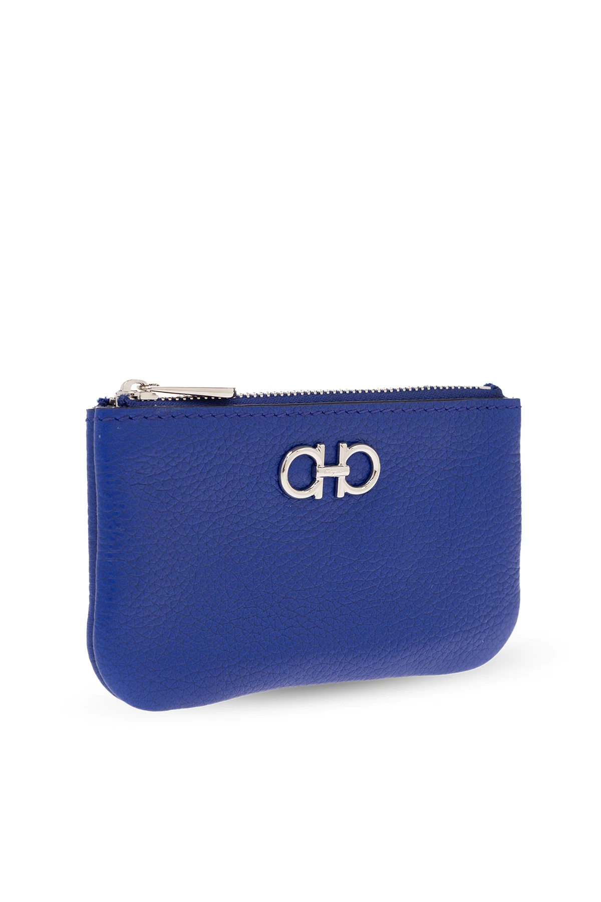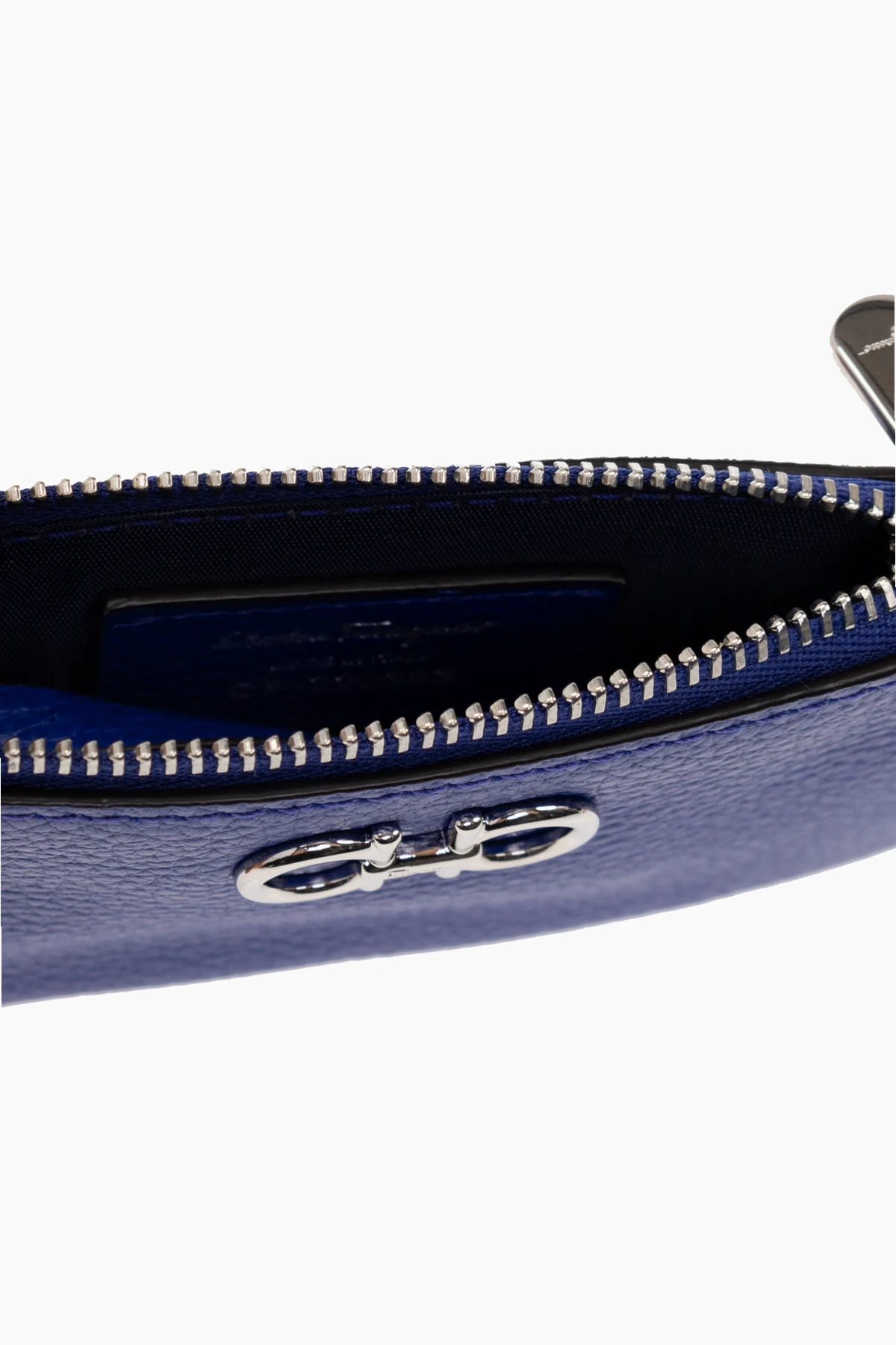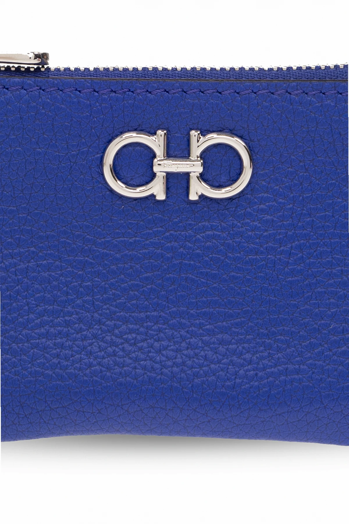 Ciemnoniebieskie etui na klucze FERRAGAMO. Wykonane z cielęcej skóry. Zamykane na zamek. Z przodu aplikacja w kształcie logo. Wewnątrz komora i brelok na pasek. Metalowe elementy w kolorze srebrnym.