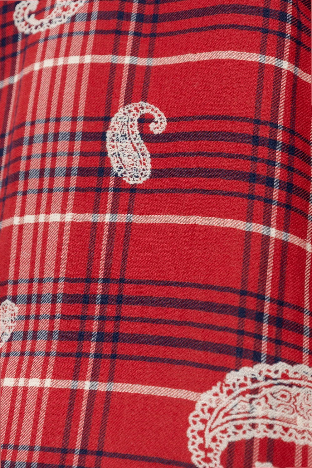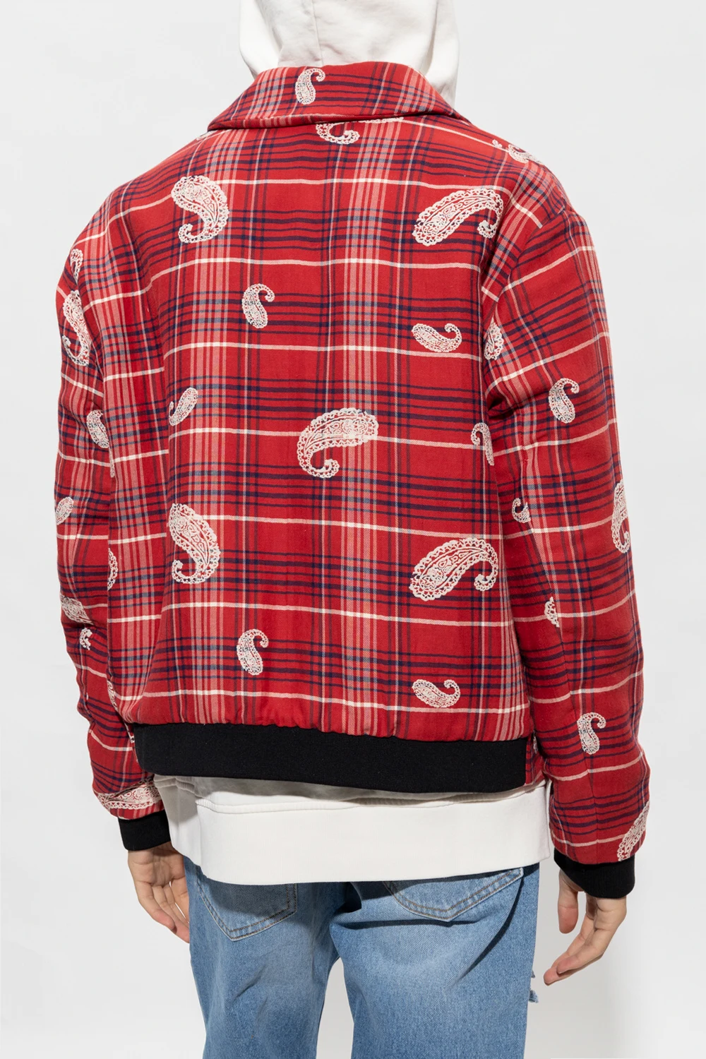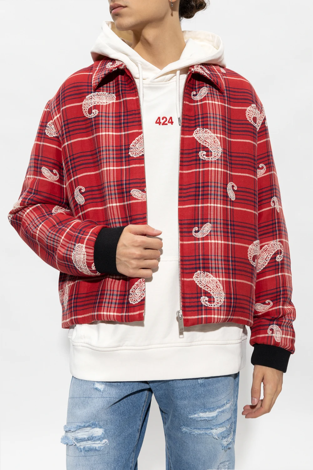 Czerwona kurtka 424. Wykonana z bawełny i lnu. Zapinana na zamek. Ozdobiona wzorem w granatowo-białą kratę i motywem 'paisley’. Z przodu dwie kieszenie. Długie rękawy zakończone czarnym ściągaczem.
