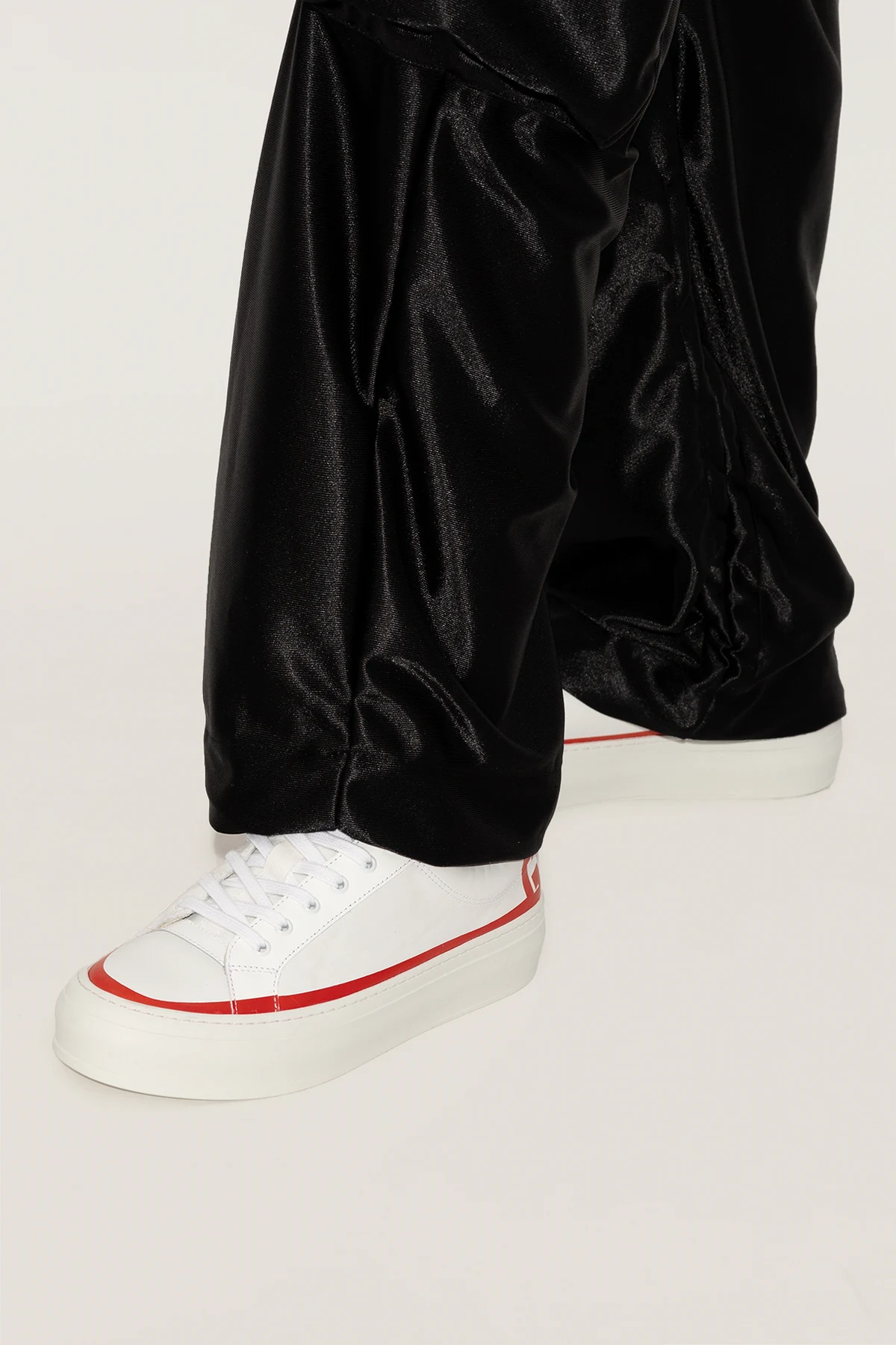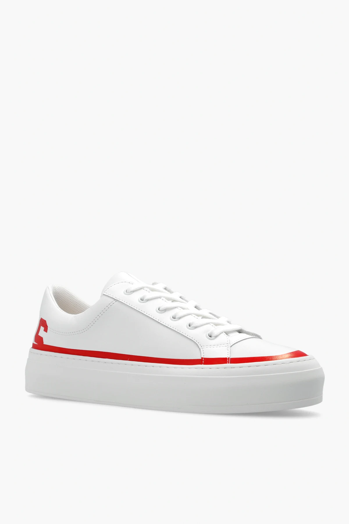 Białe, sznurowane buty sportowe GCDS. Wykonane ze skóry. Ozdobione czerwonym wzorem z logo. Biała, gumowa podeszwa.
