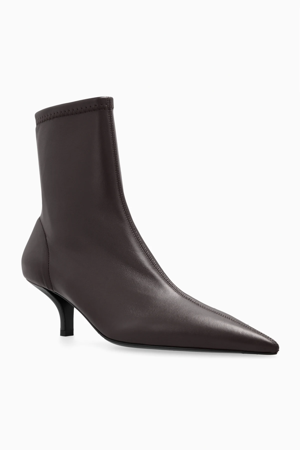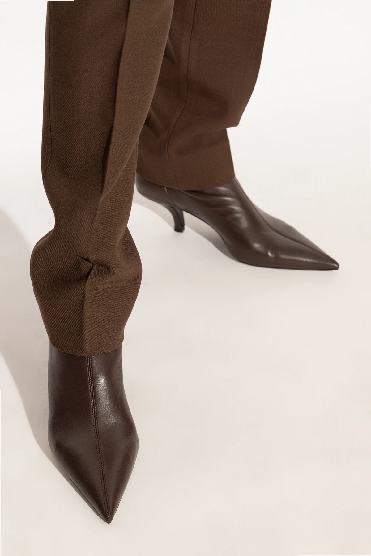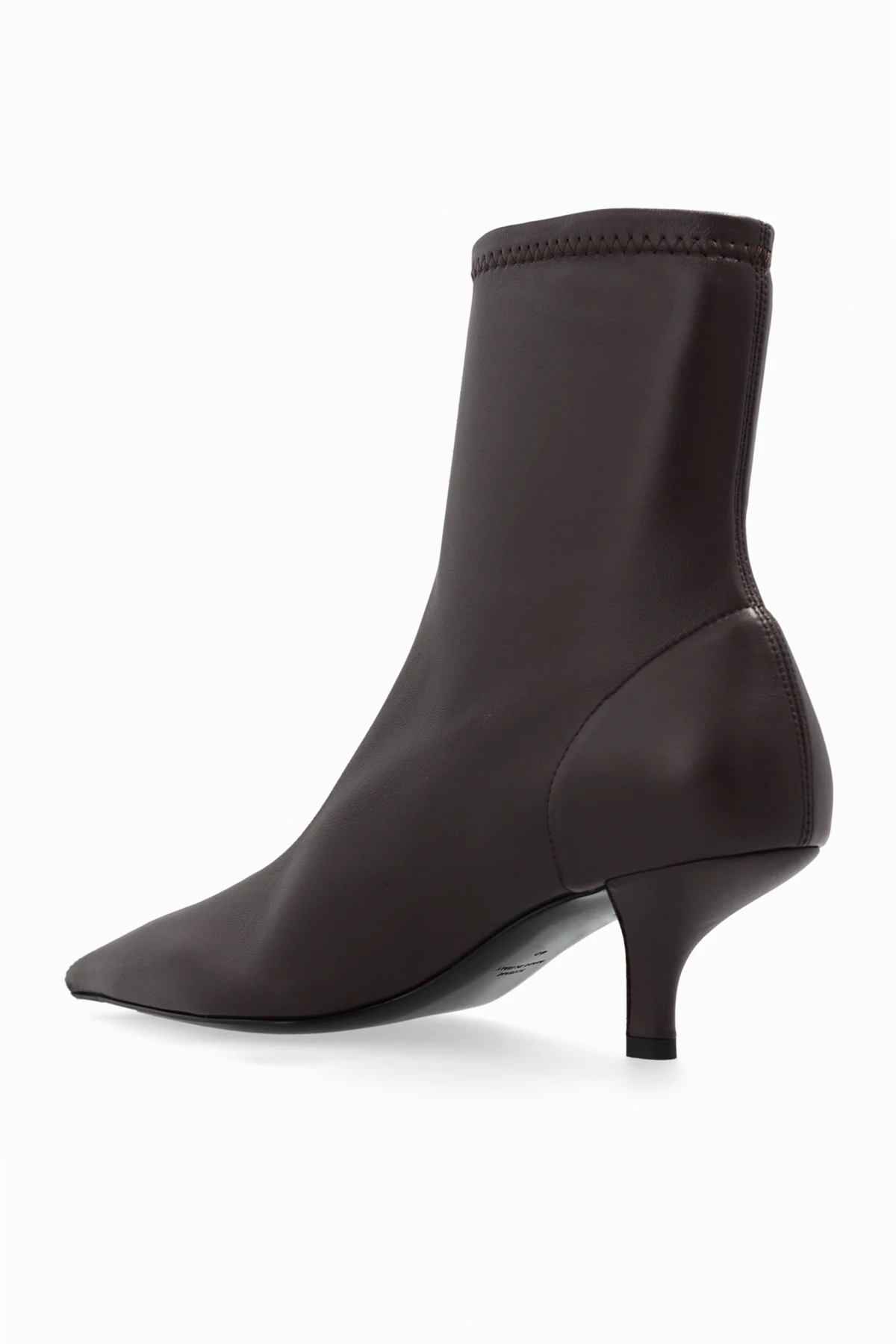 Prezentujemy skórzane botki od ekskluzywnej marki modowej TOTEME, które urzekają swoim minimalistycznym i klasycznym designem. Botki wyróżniają się smukłym, eleganckim kształtem z wąską, spiczastą końcówką oraz cholewką sięgającą ponad kostkę. Średniej wysokości, subtelnie zakrzywiony obcas dodaje im wyrafinowanego charakteru.