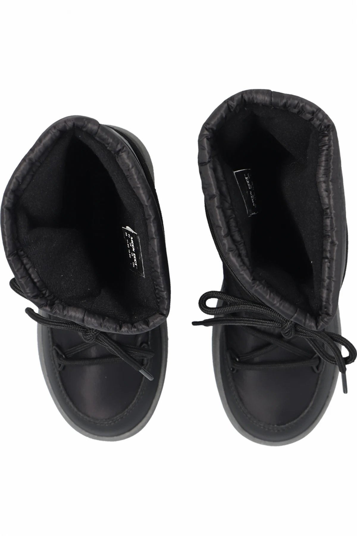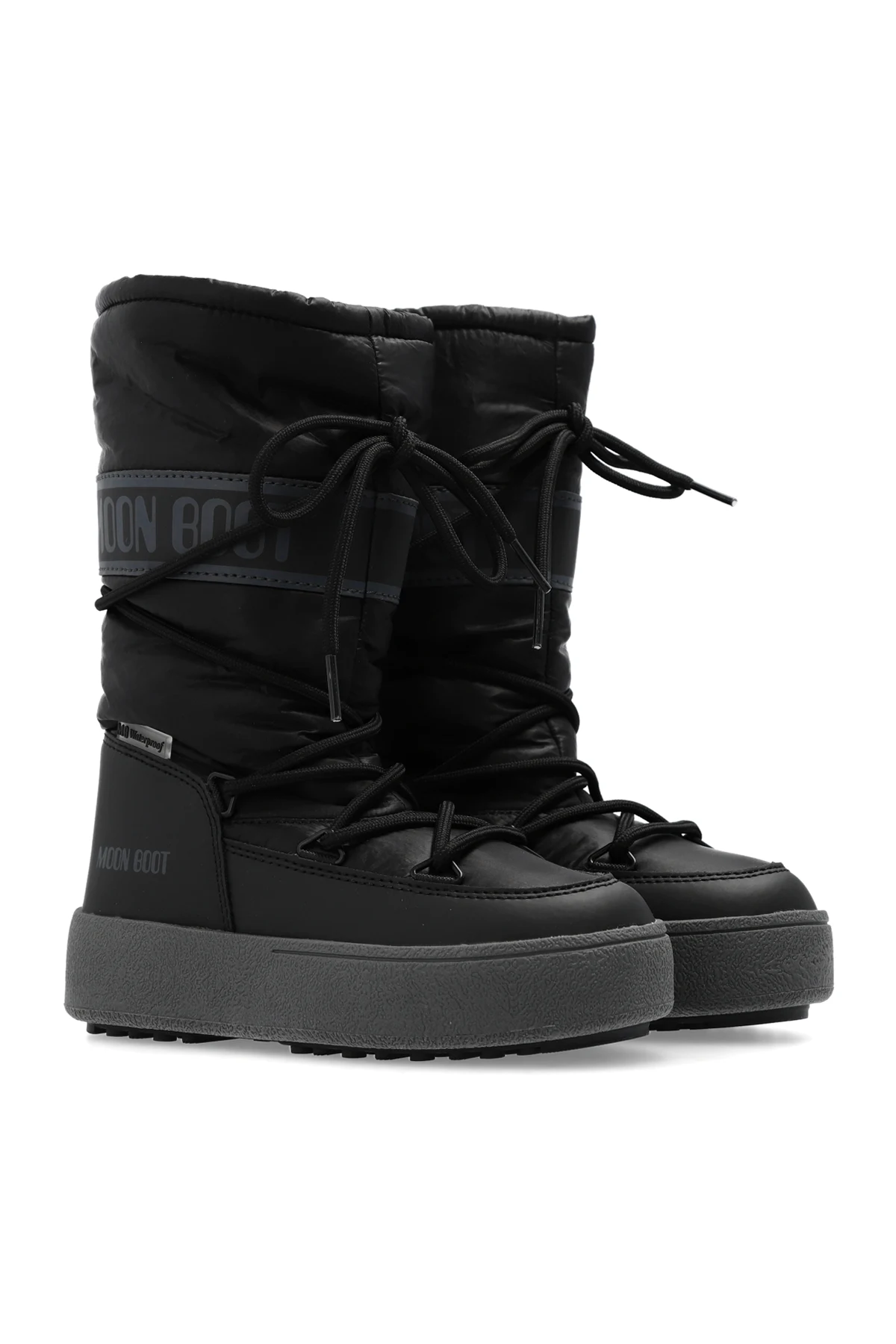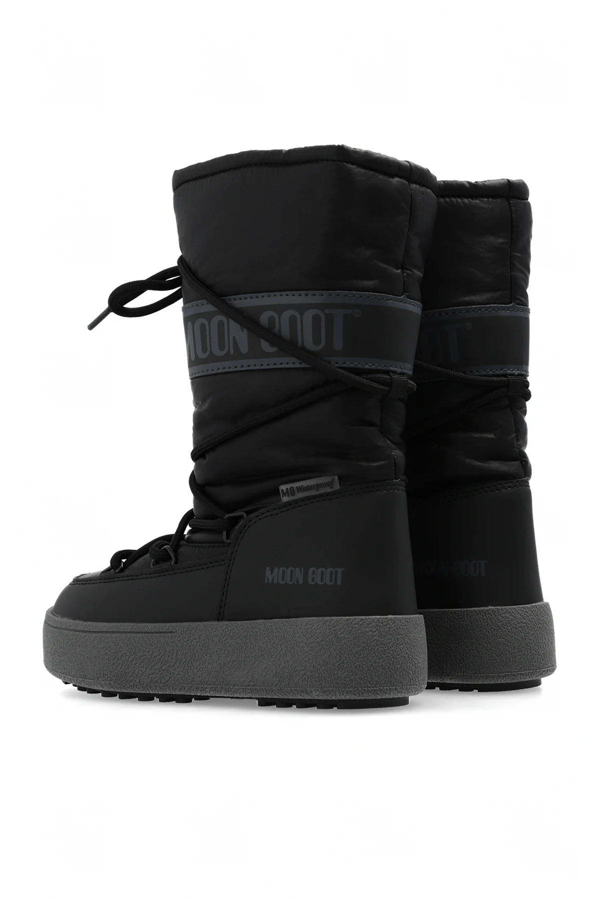 Czarne śniegowce, model ‘Jtrack Nylon High’ Moon Boot. Wykonane z wodoodpornego materiału. Krzyżowe sznurowadła rurkowe. Ozdobione logo. Przyssawki na czarno-szarej, gumowej podeszwie bieżnika zapewniają przyczepność w każdym terenie. Metalowe elementy w kolorze srebrnym.