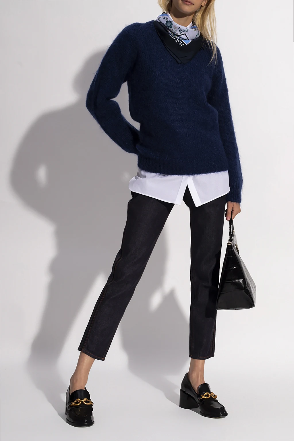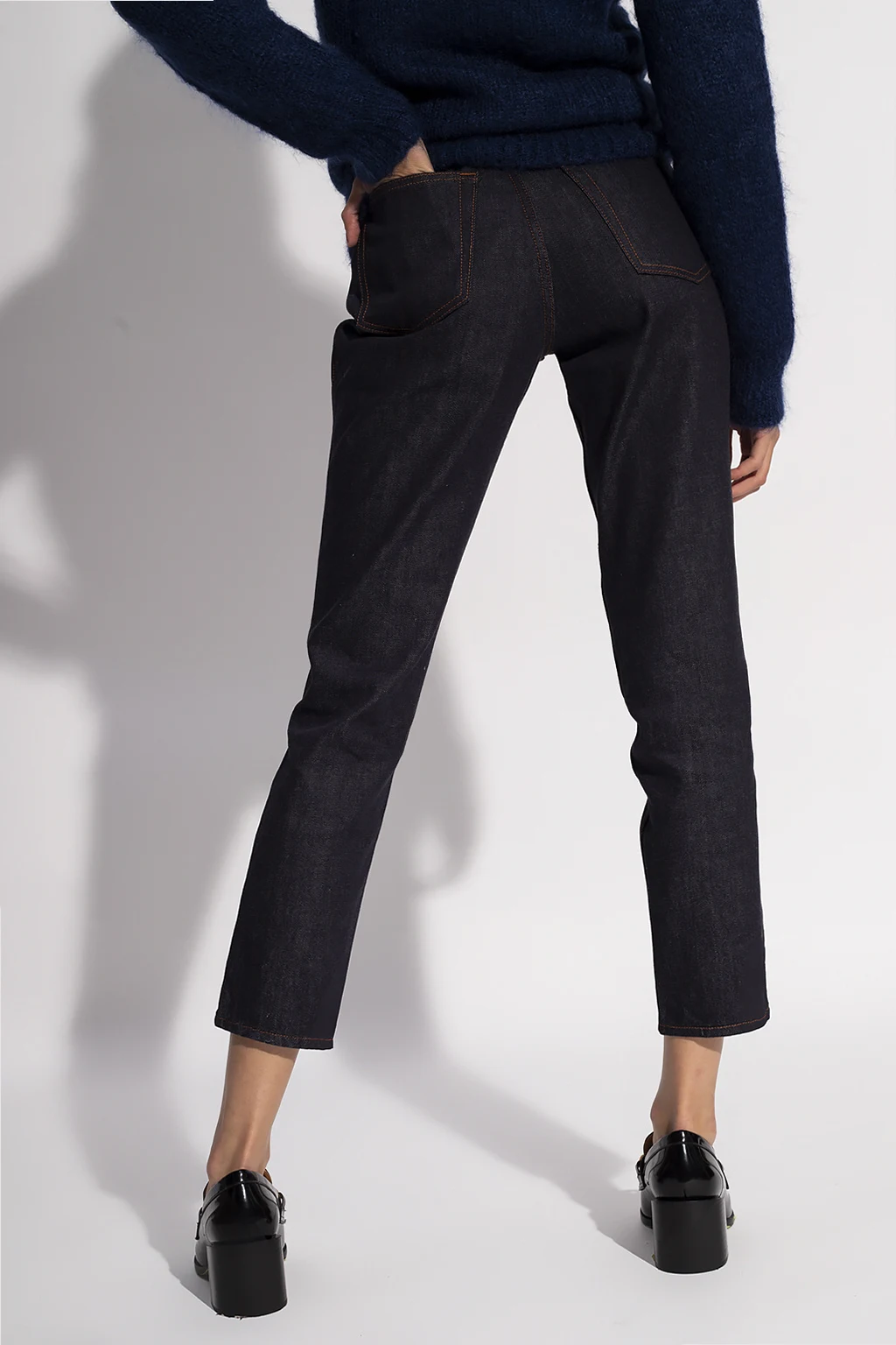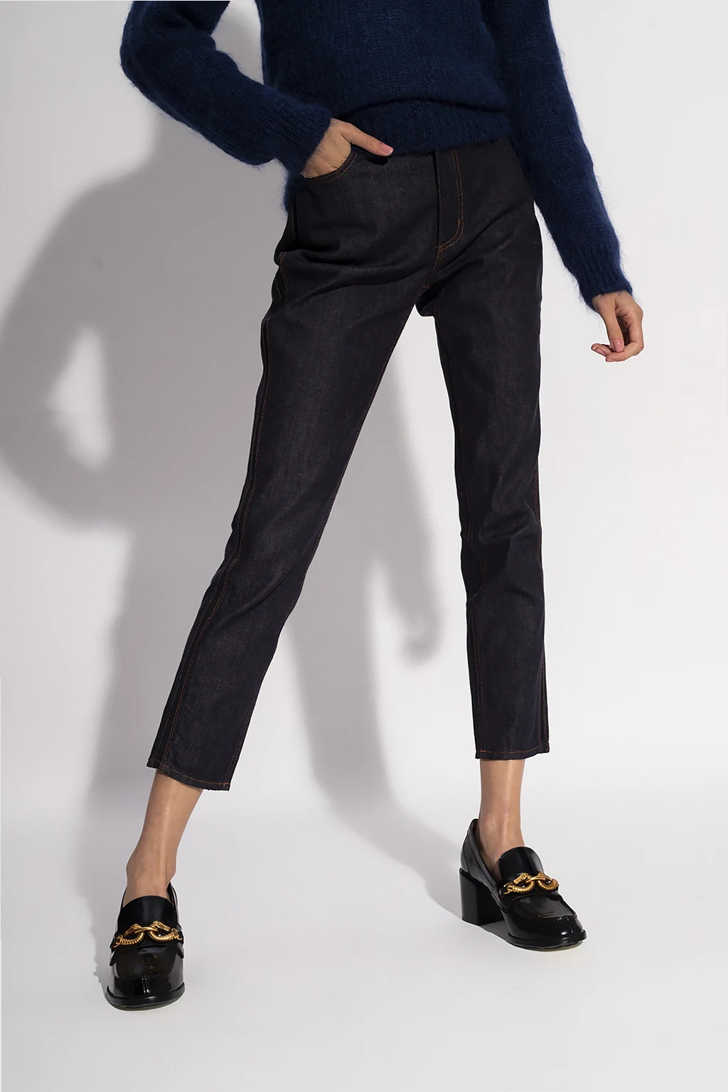 Granatowe jeansy Erdem. Zapinane na zamek oraz guzik. Pięć wsuwanych kieszeni. Z tyłu naszywka z wytłoczonym logo w kolorze czarnym. Po bokach przeszycia. Nogawki zwężane ku dołowi.