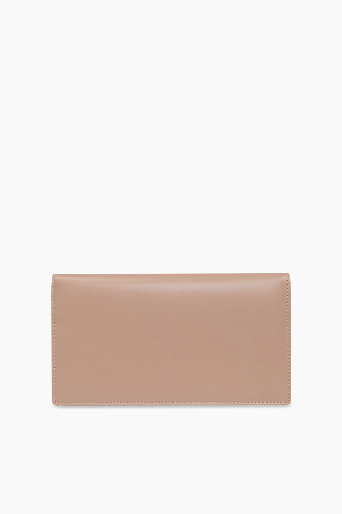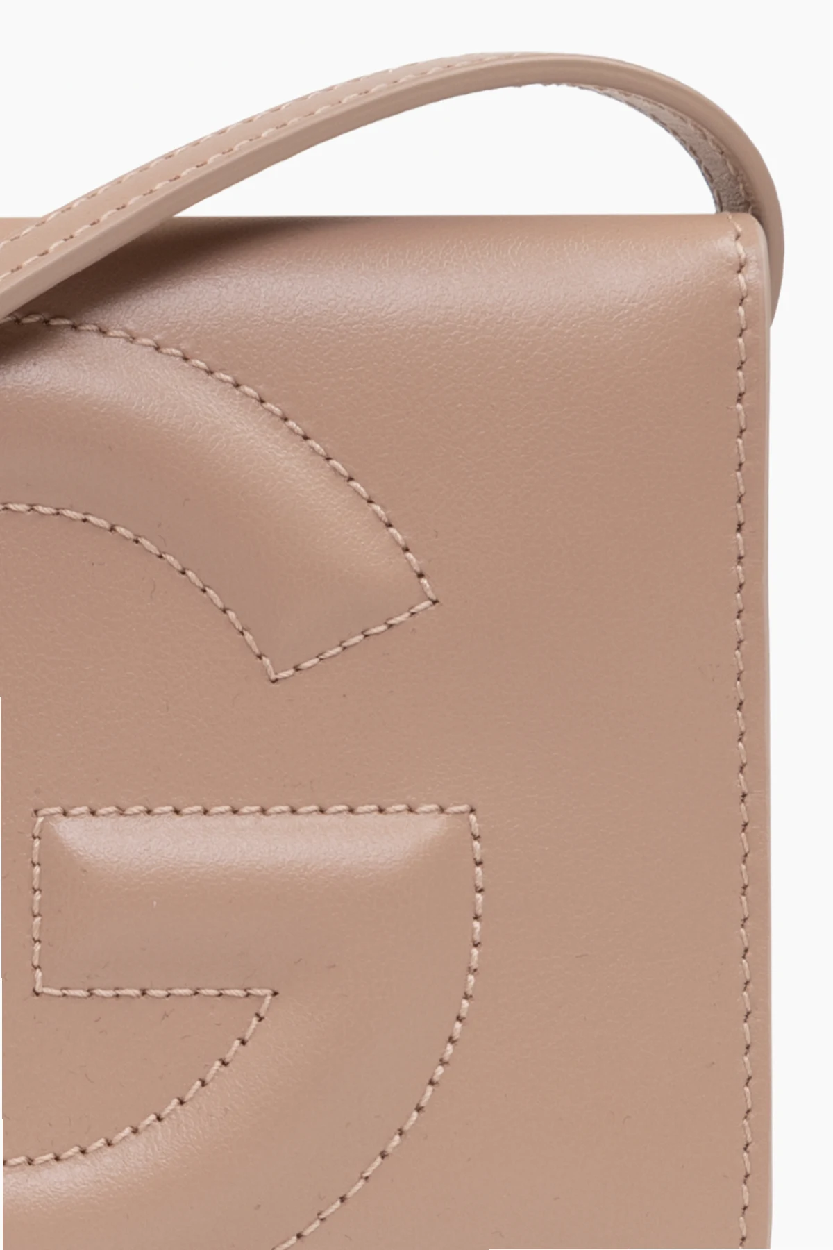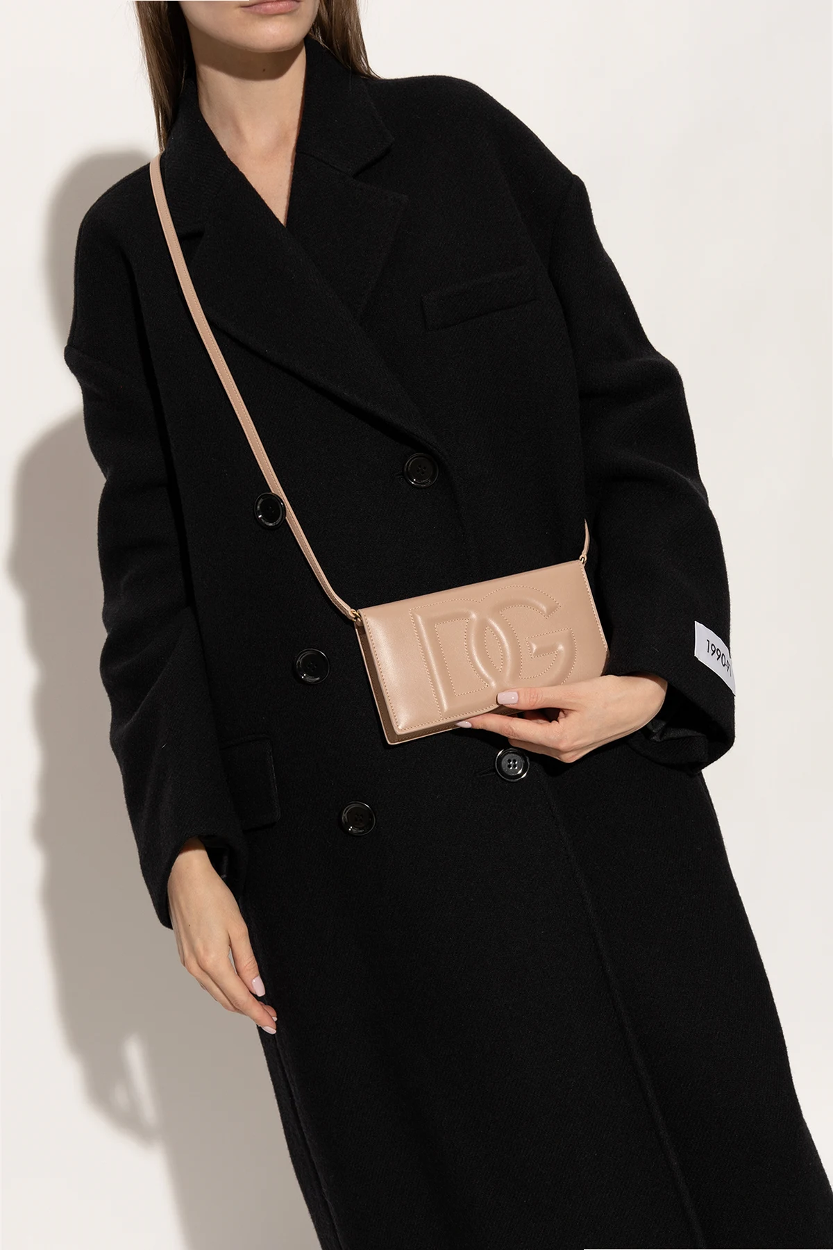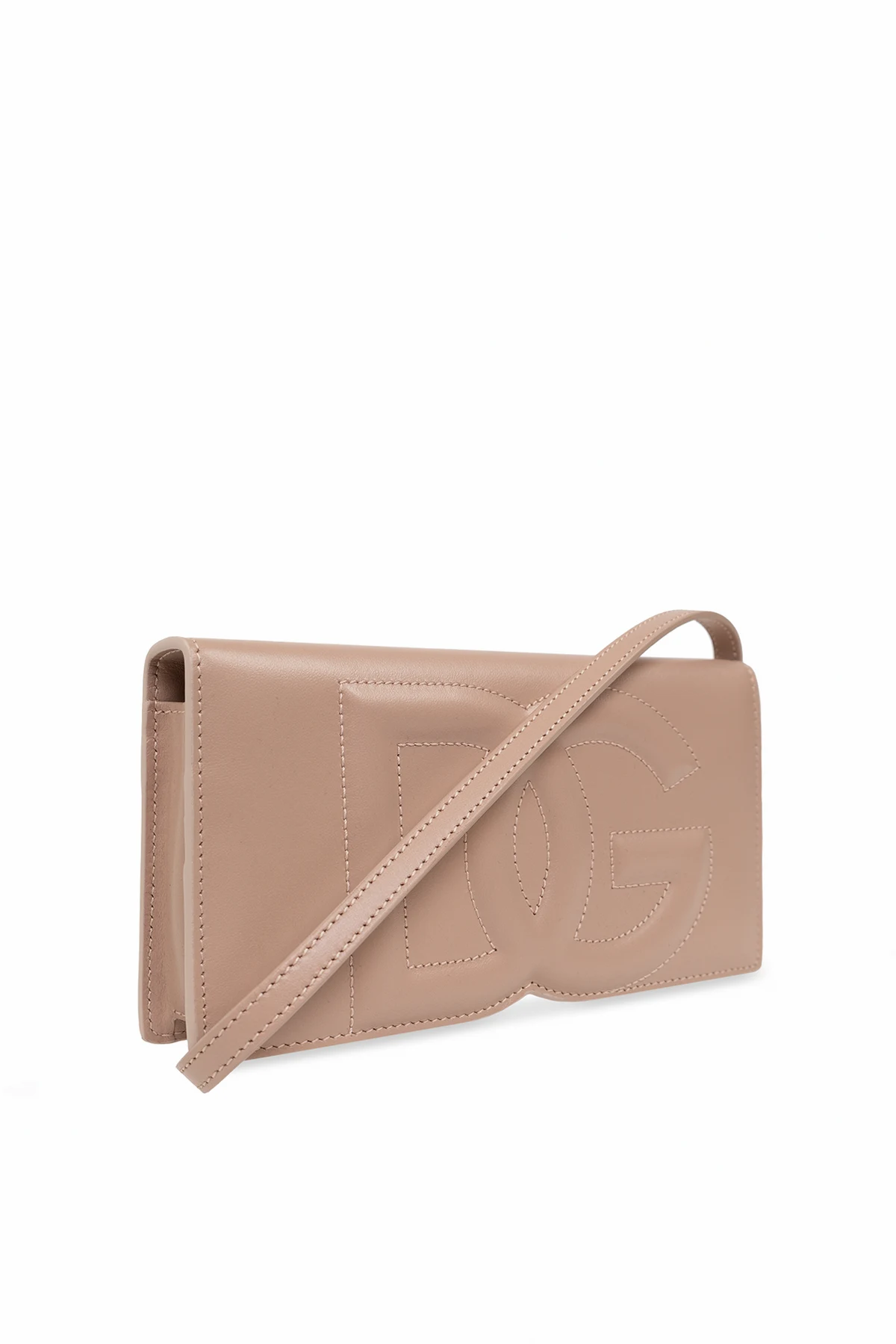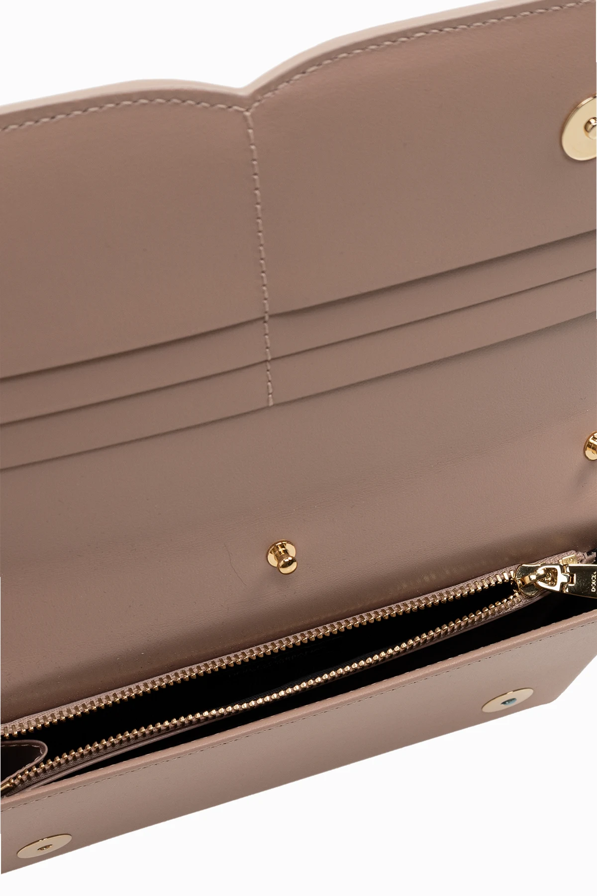 Beżowy portfel na pasku Dolce & Gabbana. Wykonany ze skóry. Zamykany na magnetyczne zatrzaski. Z przodu ozdobiony logo. Odpinany, regulowany pasek. Wewnątrz komora, kieszeń na monety zamykana na zamek i sześć miejsc na karty. Metalowe elementy w kolorze złotym.