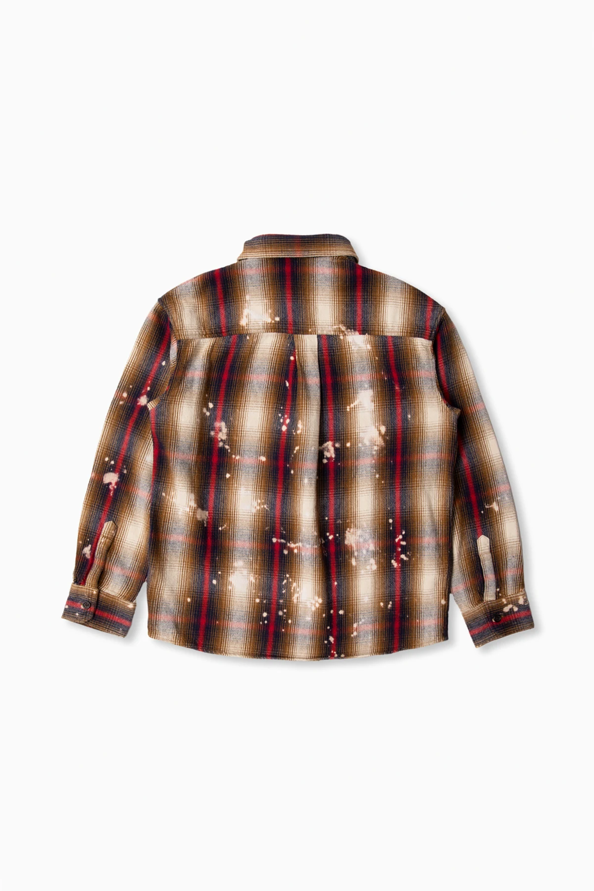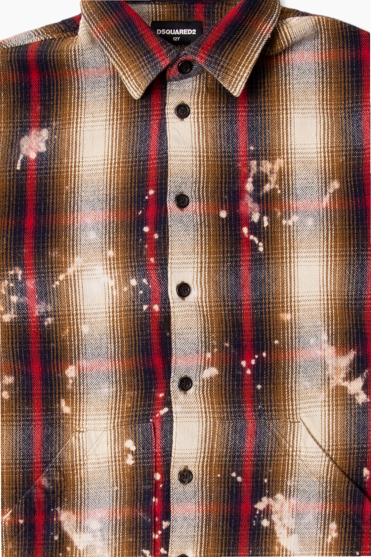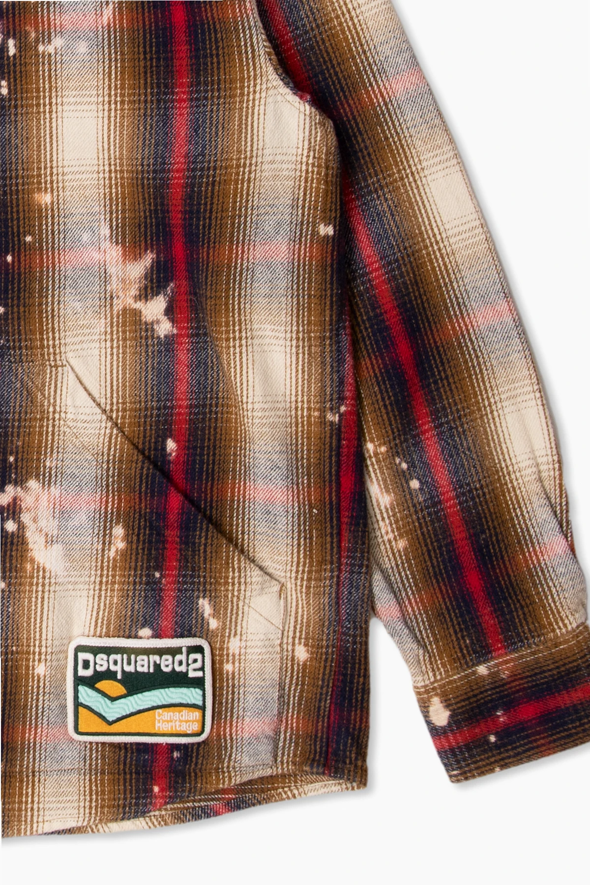 Kolorowa, bawełniana koszula Dsquared2 Kids. Zapinana na guziki. Ozdobiona wzorem w kratę i kolorową naszywką z logo. Z przodu dwie kieszenie. Długie rękawy, mankiety zapinane na guzik. Efekt ‘vintage’.
