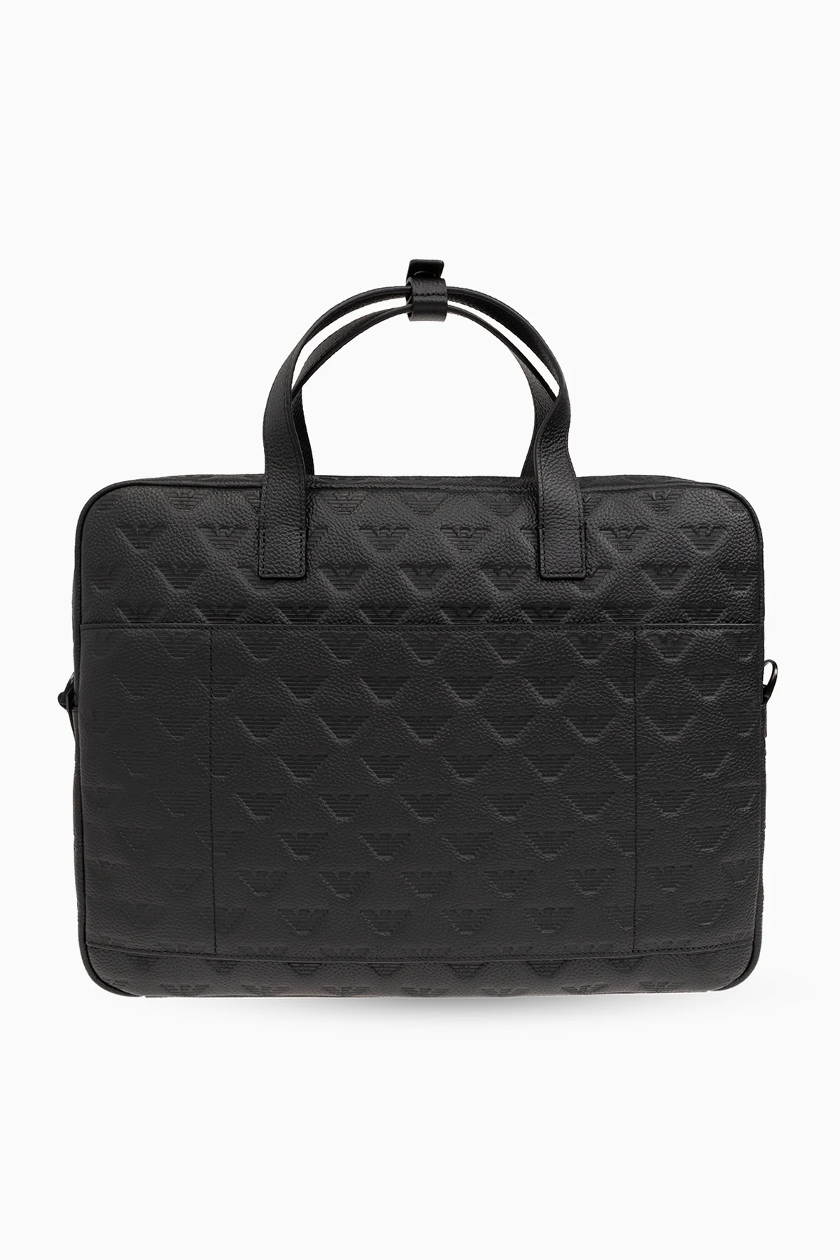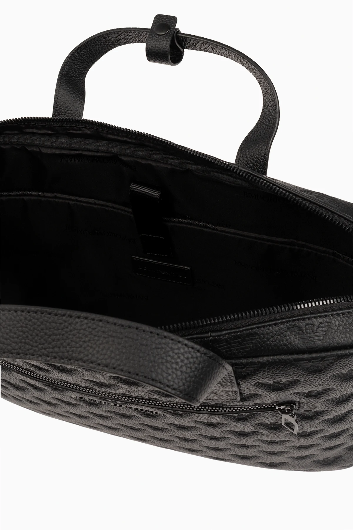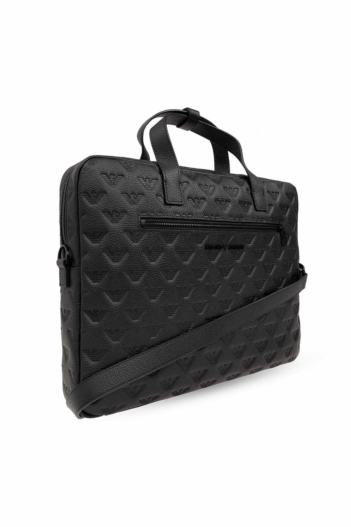 Czarna torba na dokumenty Emporio Armani. Wykonana ze skóry ozdobionej wytłoczonym monogramem. Zamykana na zamek. Z przodu kieszeń zamykana na zamek i aplikacja w kształcie logo. Z tyłu wsuwana kieszeń. Dwie półokrągłe rączki. Odpinany, regulowany pasek. Wewnątrz komora, kieszeń na laptop zapinana na rzep, kieszeń zamykana na zamek i dwie wsuwane kieszenie. Metalowe elementy w kolorze czarnym.