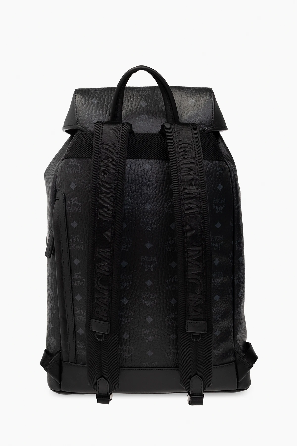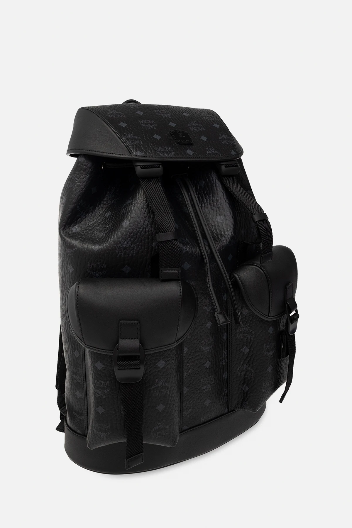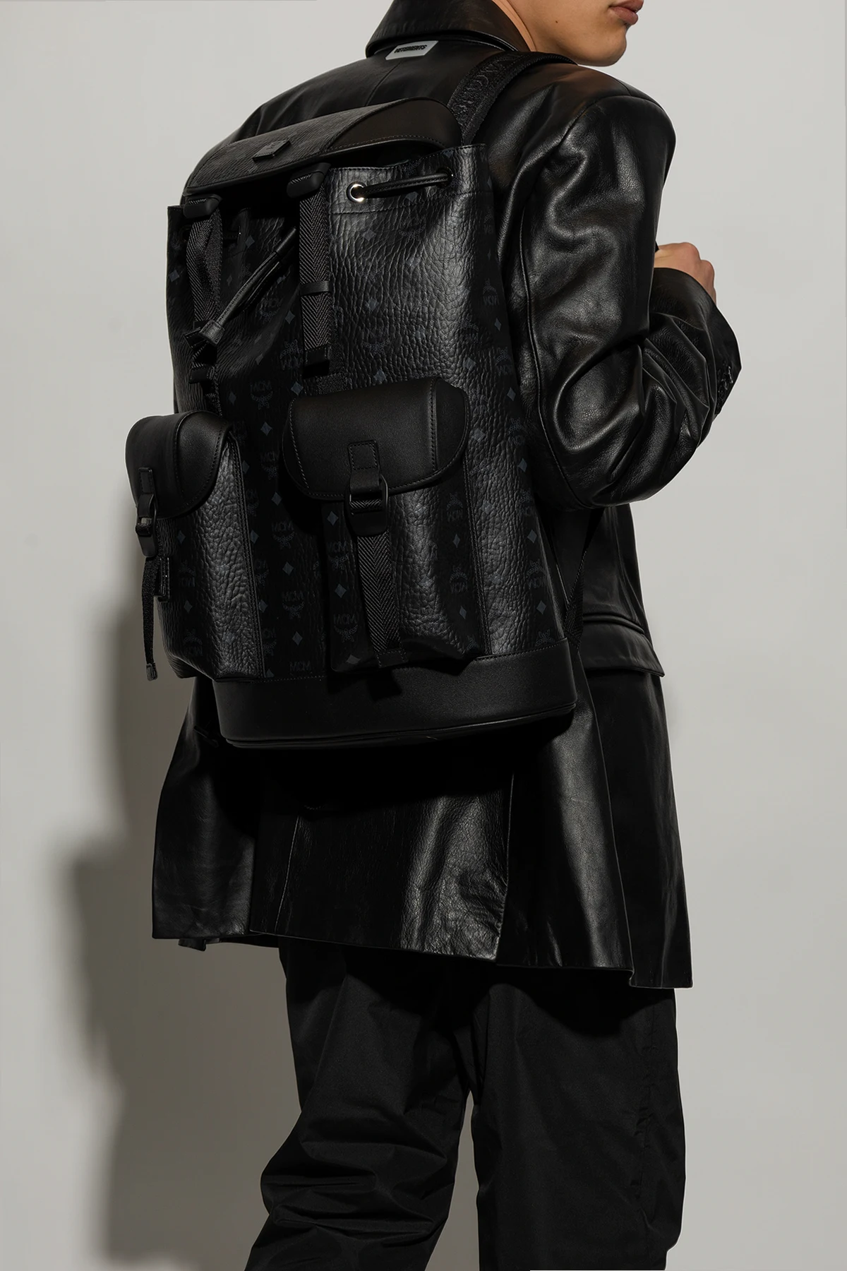 Czarny plecak, model ‘Brandenburg’ MCM. Wykonany z płótna powlekanego ‘Visetos’. Wykończony skórą. Klapa zamykana na regulowane paski z zatrzaskiem. Ozdobiony wzorem z monogramem. Z przodu dwie kieszenie z patką zapinaną na magnetyczny zatrzask. Z tyłu zamek do wnętrza komory. Półokrągła rączka. Szelki z możliwością regulacji długości. Wewnątrz komora ściągana trokami i zamykana na karabińczyk, a w niej kieszeń zamykana na zamek. Metalowe elementy w kolorze złotym.
