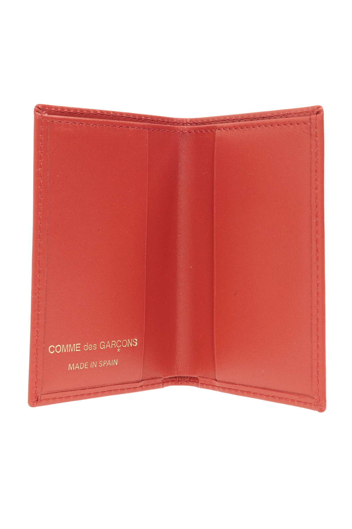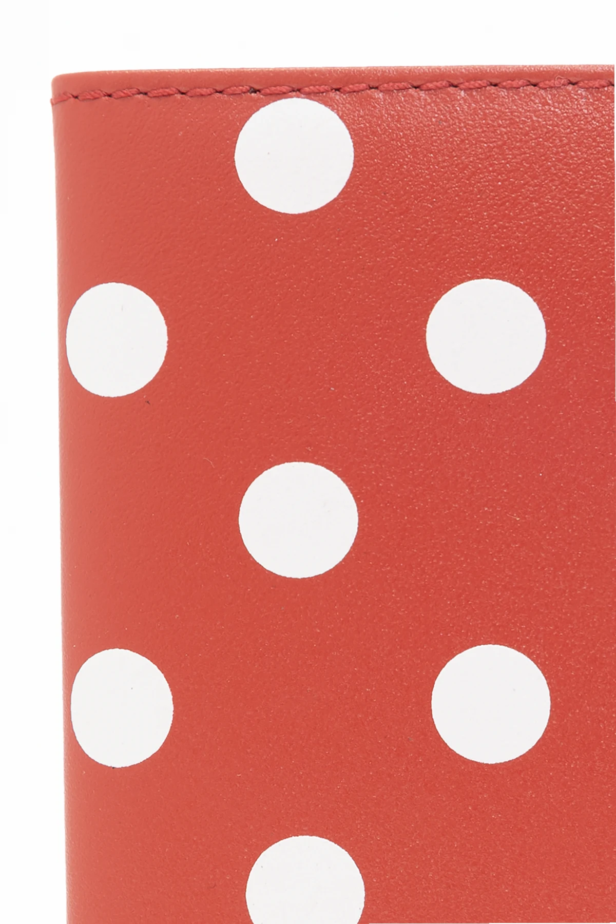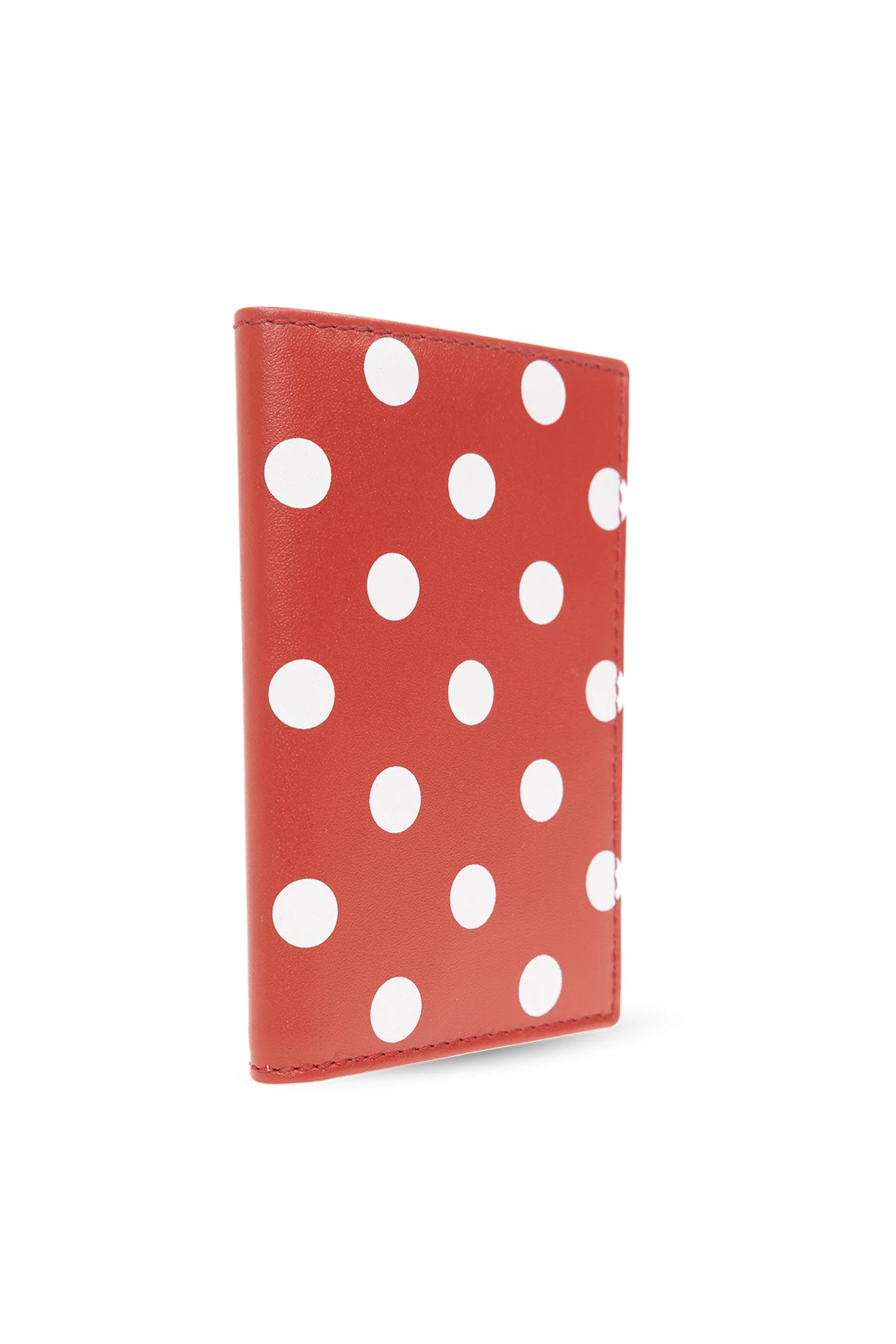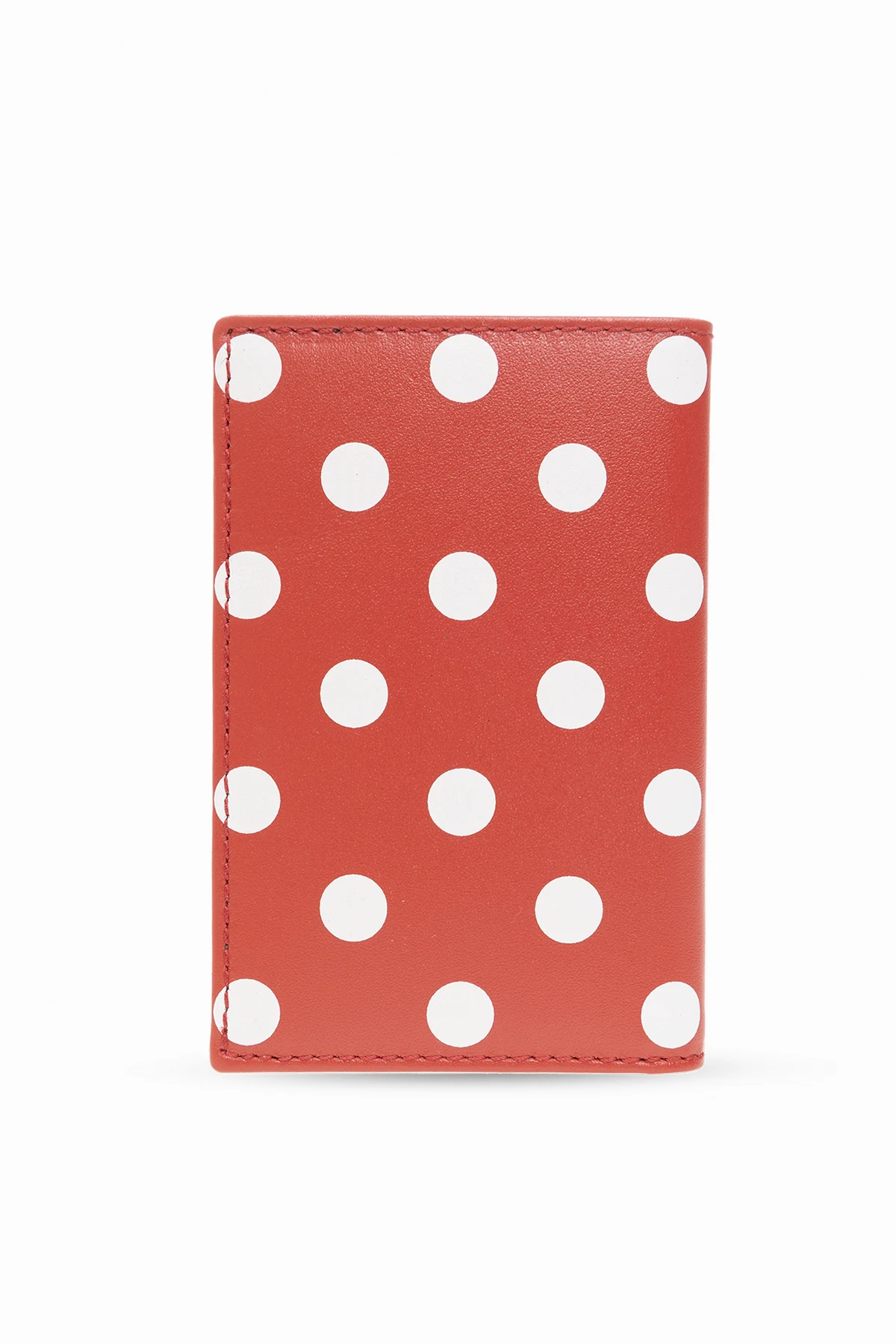 Czerwony portfel Comme des Garcons. Wykonany ze skóry krowiej. Ozdobiony wzorem w białe kropki. Wewnątrz dwie wsuwane kieszenie oraz miejsce na banknoty.