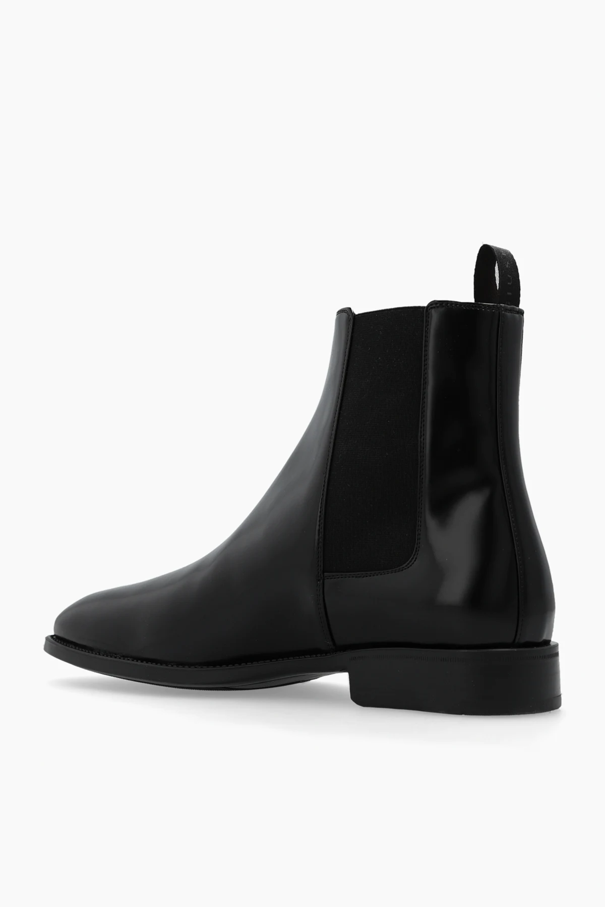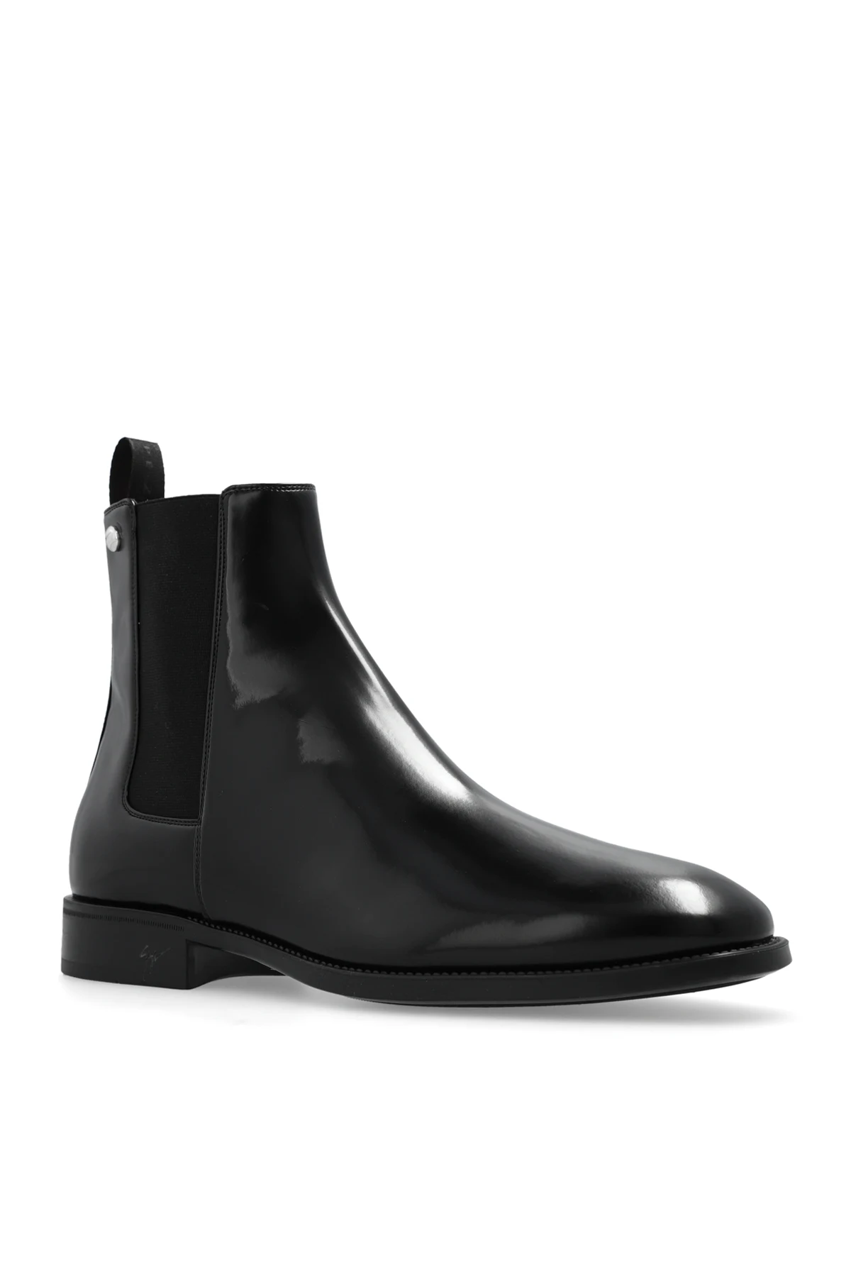 Czarne, wsuwane botki, model ‘Ryim’ Giuseppe Zanotti. Wykonane z imitacji skóry. Ozdobione metalową aplikacją z logo w kolorze srebrnym. Po bokach wszyta guma. Z tyłu uchwyt z wyszytym logo. Czarna, gumowa podeszwa.
