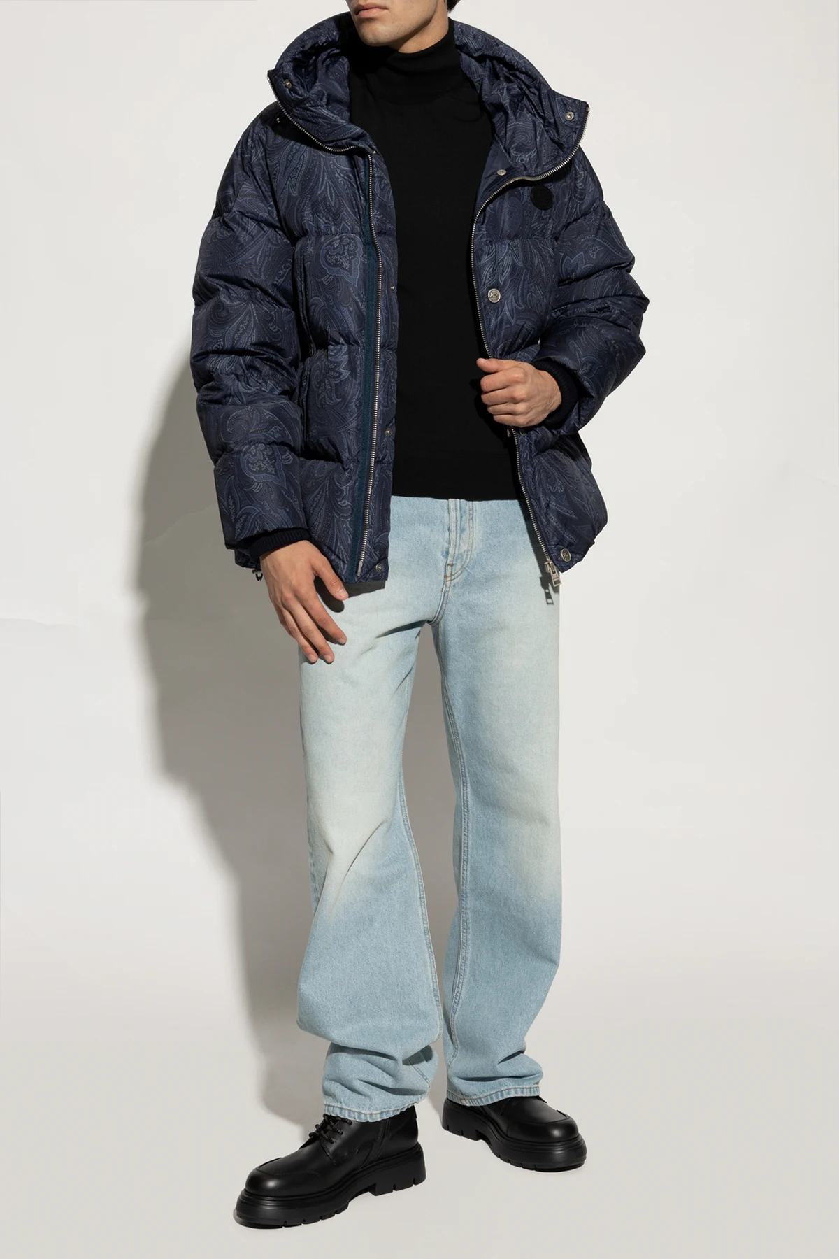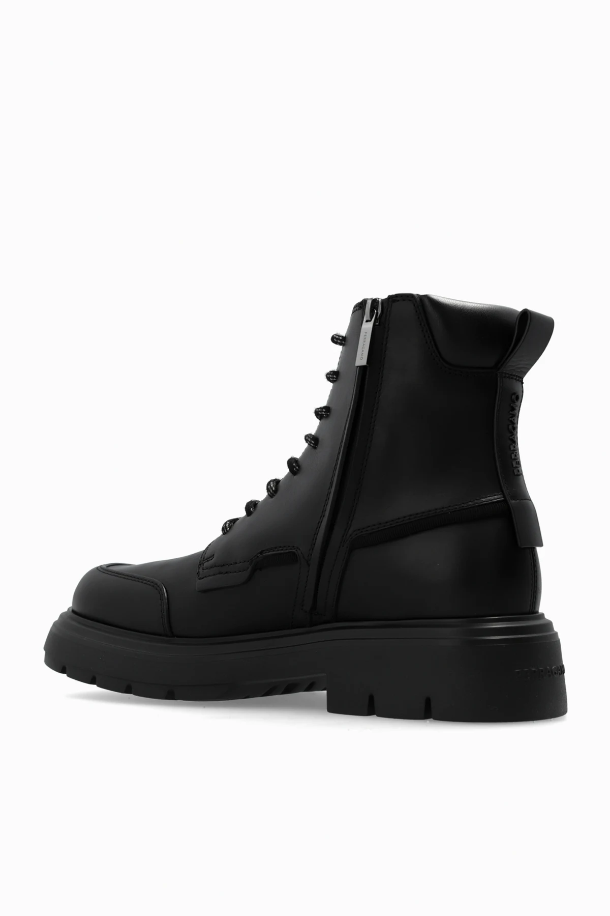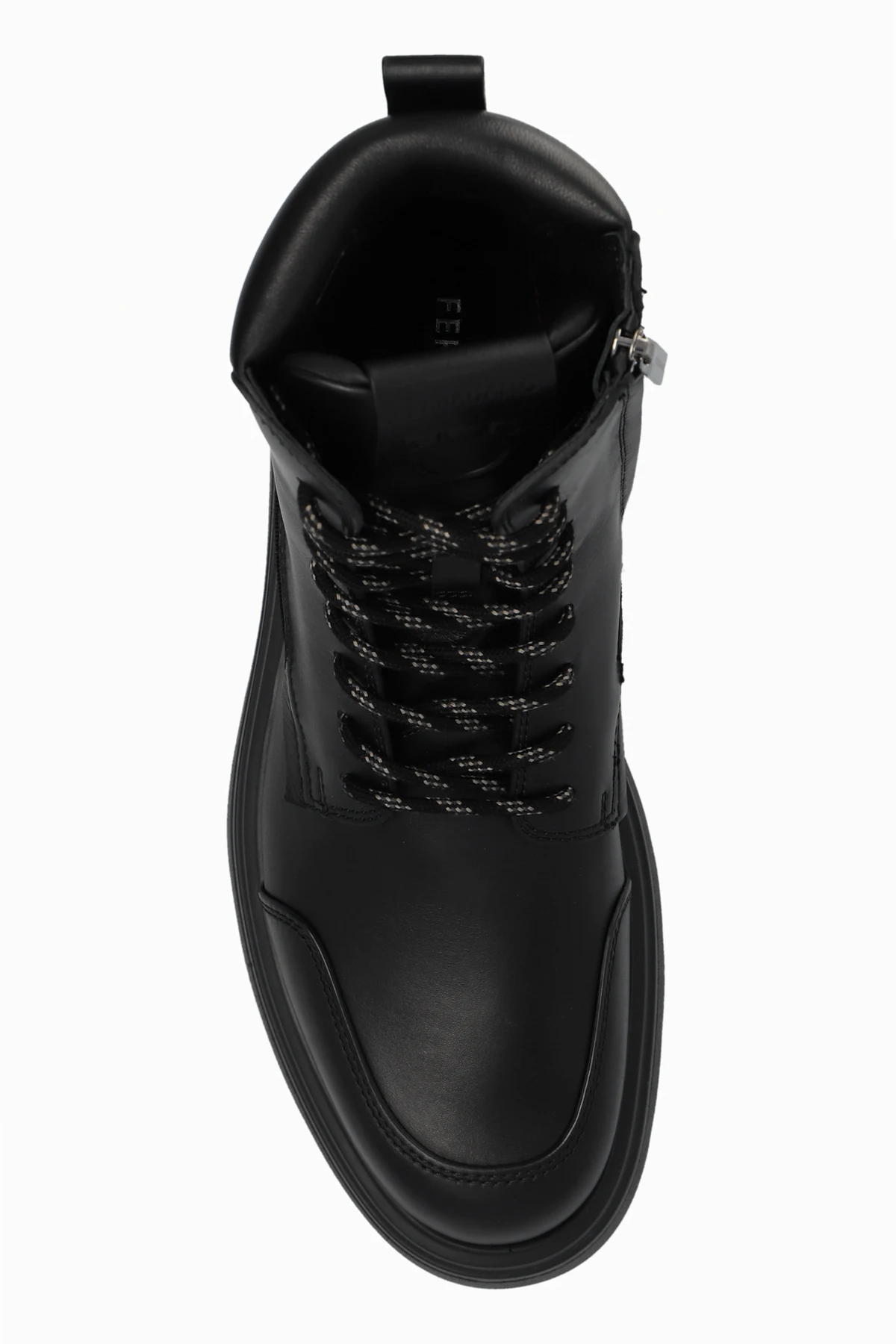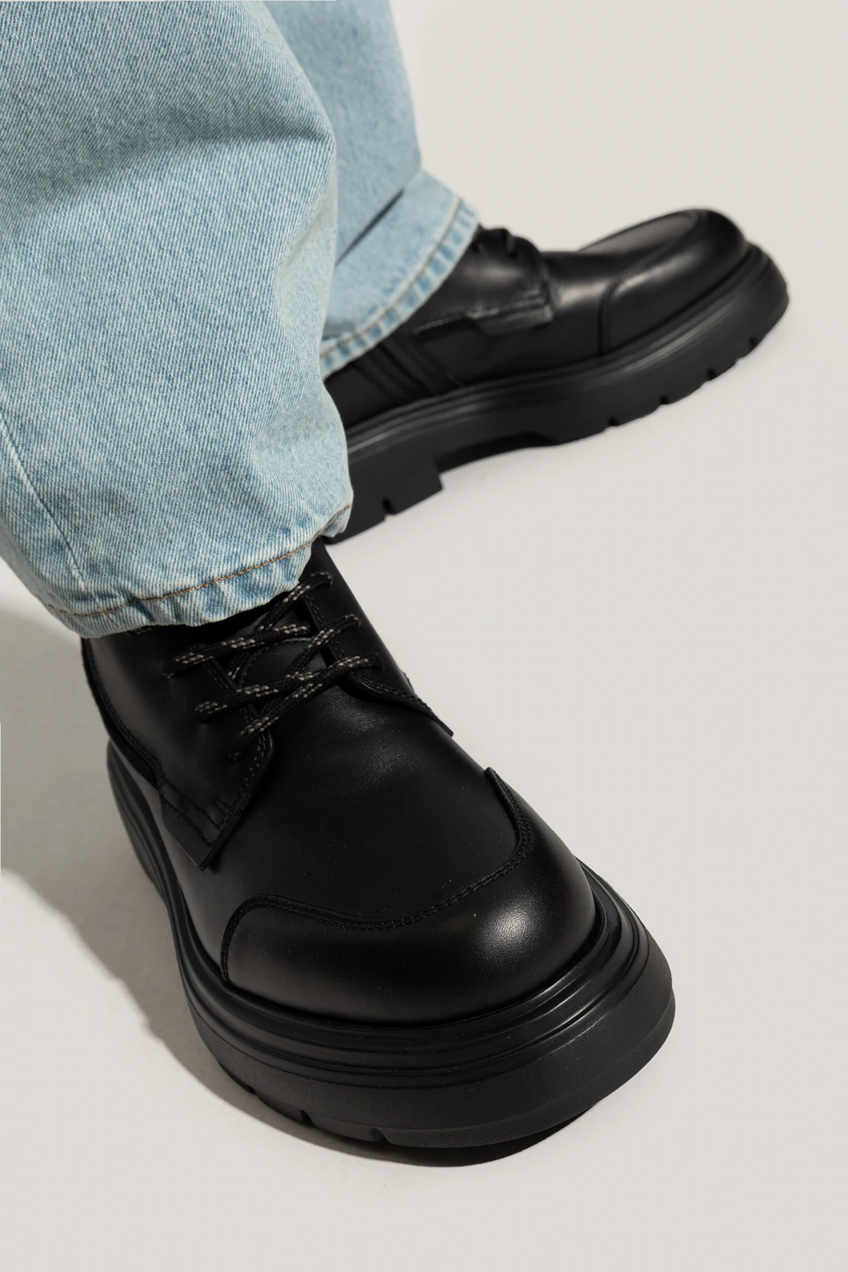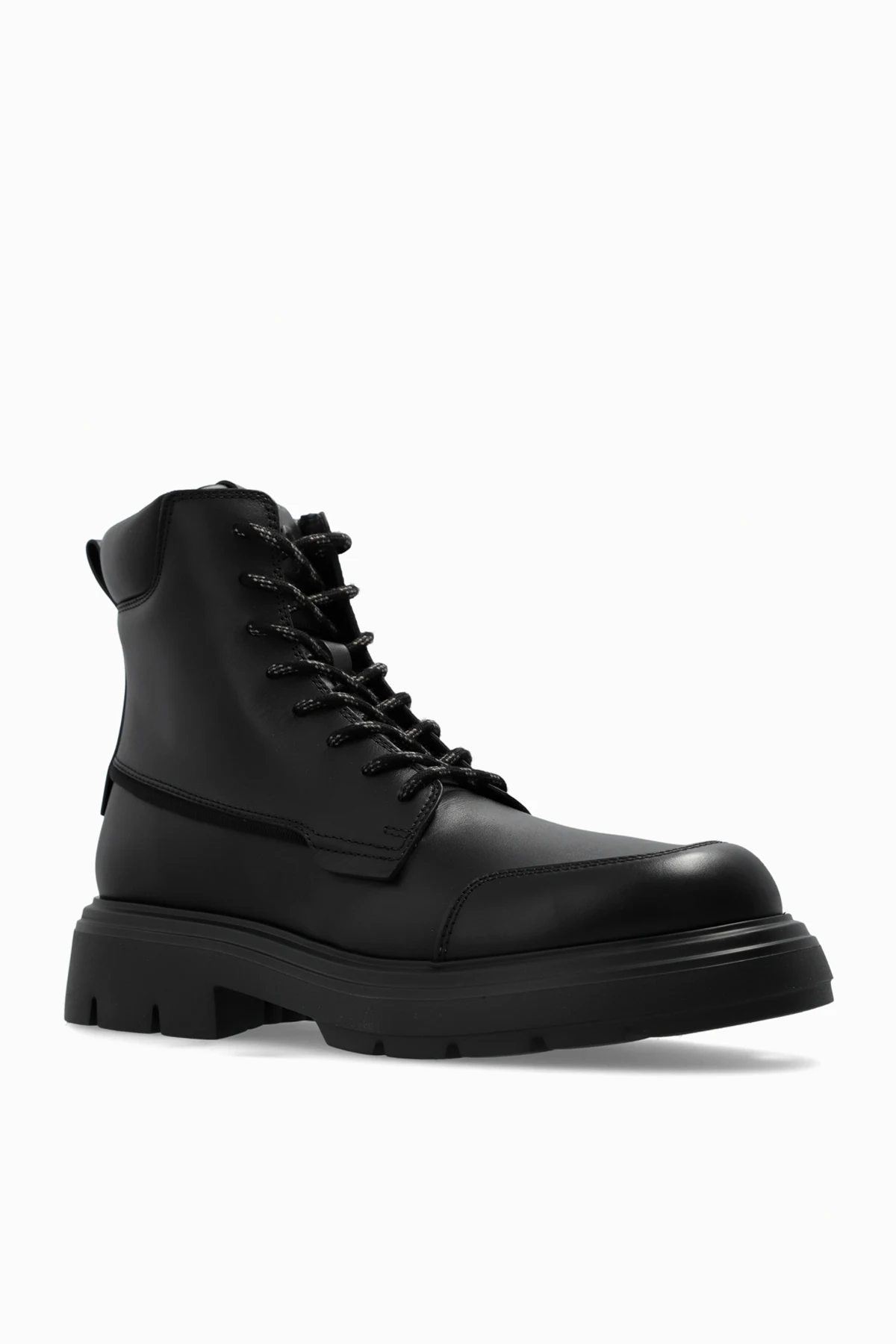 Buty te charakteryzują się klasycznym kształtem bootów z wysoką cholewką, sięgającą powyżej kostki. Masywna, antypoślizgowa podeszwa zapewnia solidność i wygodę, a jednokolorowy, czarny odcień dodaje im wyrafinowanego stylu. Centralne sznurowanie z czarnymi sznurówkami ozdobionymi białymi akcentami oraz boczny zamek błyskawiczny ułatwiają zakładanie i zdejmowanie obuwia.