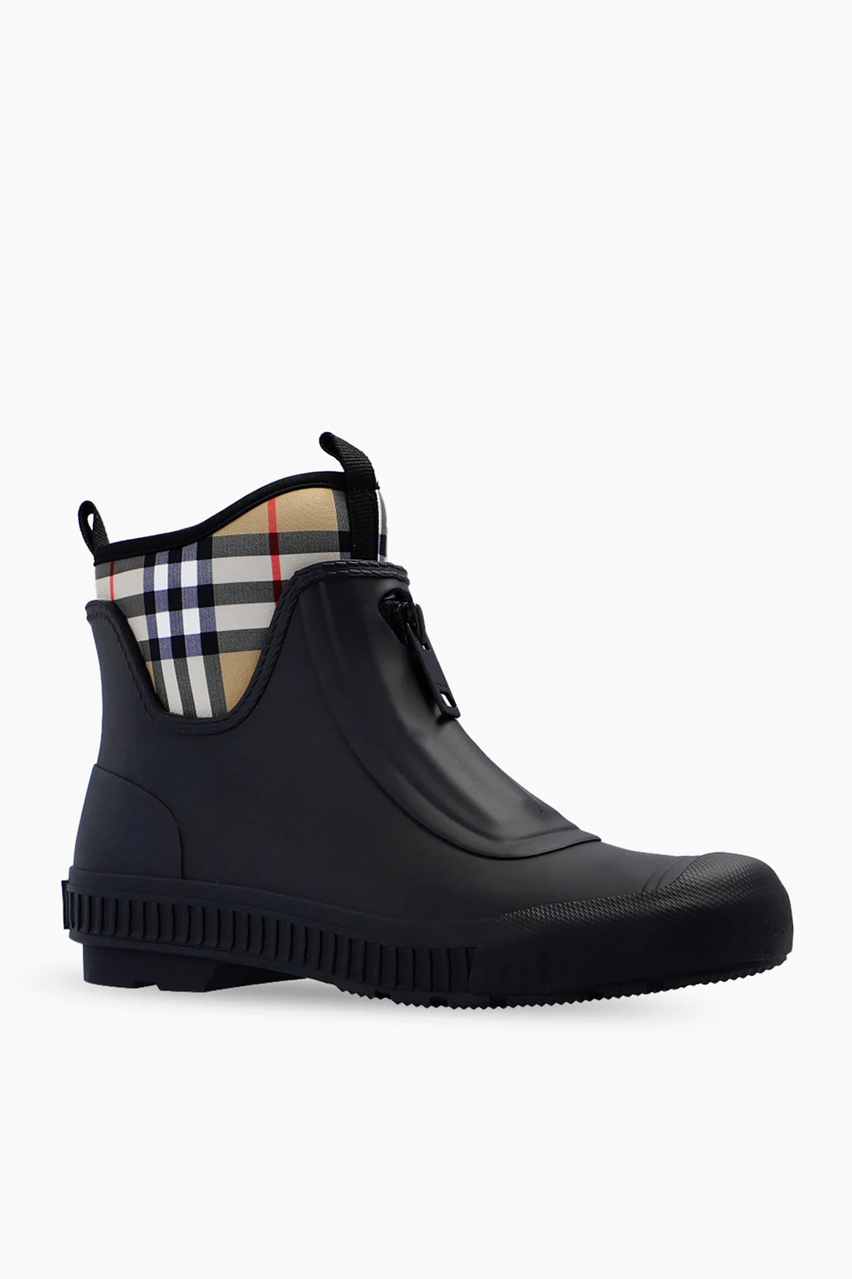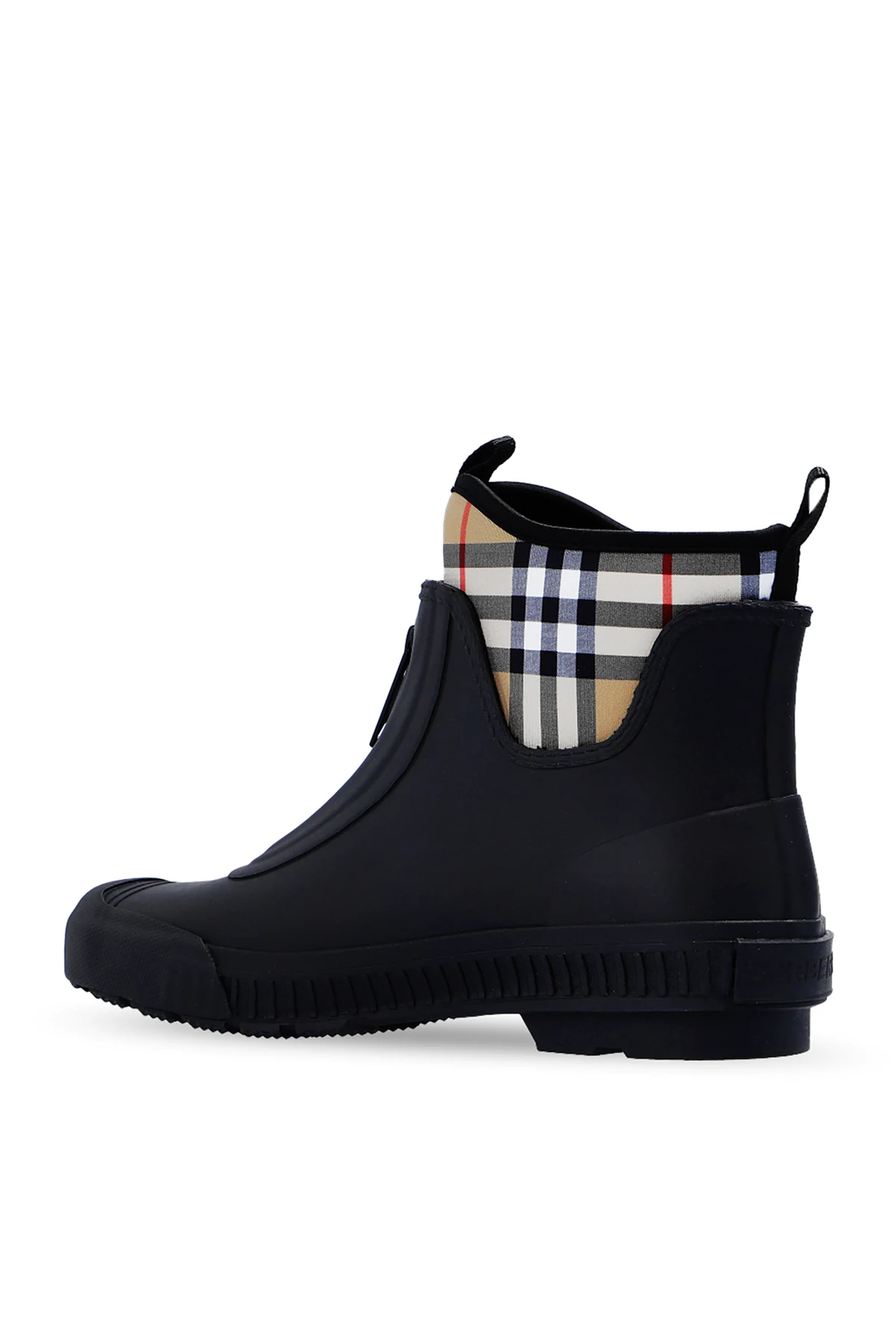 Czarne kalosze z neoprenową wkładką, model ‘Flinton’ Burberry. Ozdobione charakterystycznym dla marki wzorem w kratę ‘Vintage’. Z przodu zapinane na kryty zamek. Czarna, gumowa podeszwa.
