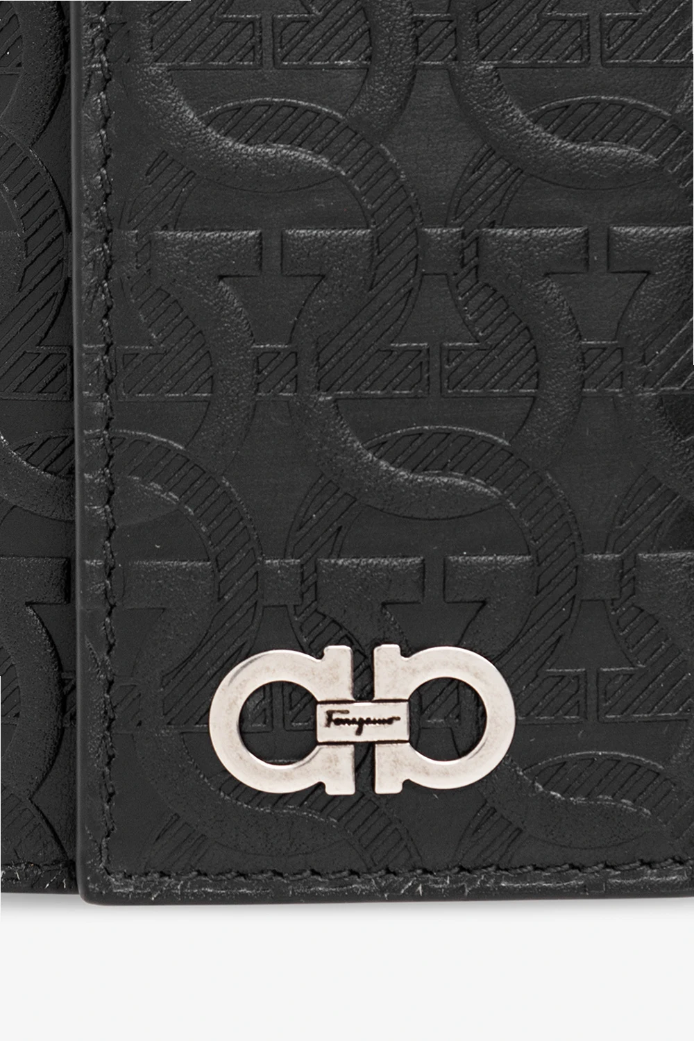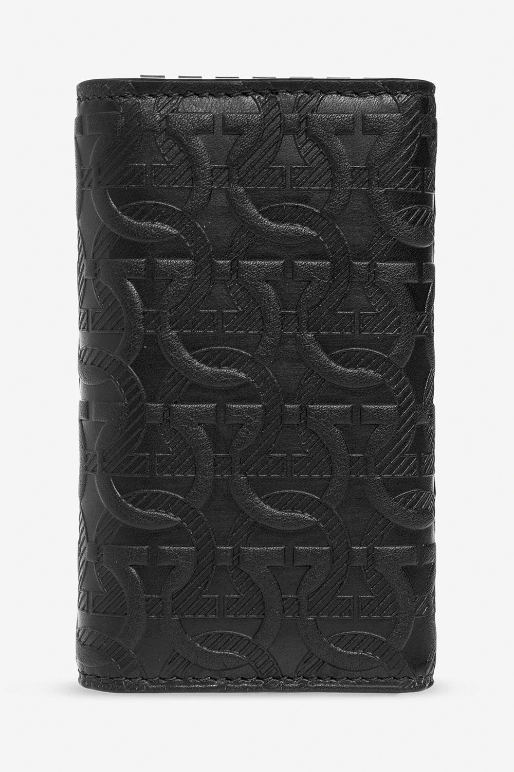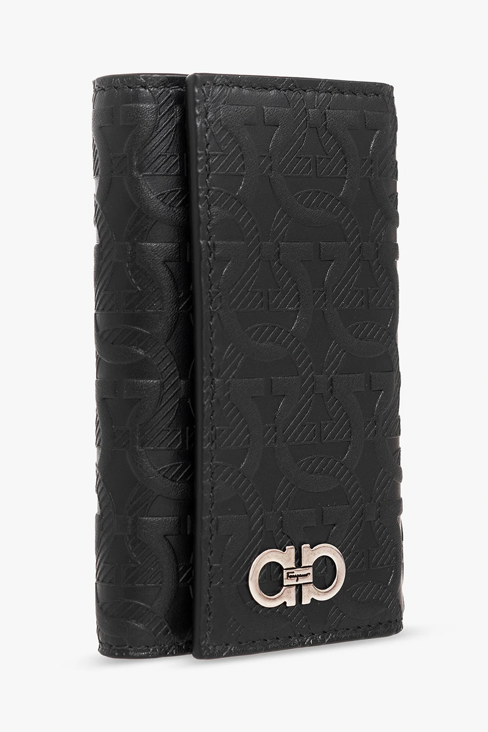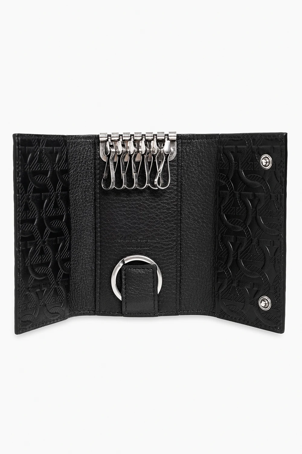 Czarne, składane etui na klucze Salvatore Ferragamo. Wykonane ze skóry zdobionej tłoczonym, charakterystycznym wzorem ‘Gancini’. Zamykane na zatrzaski. Z przodu aplikacja w kolorze srebrnym z logo. Wewnątrz dwie wsuwane kieszenie i breloki na klucze.