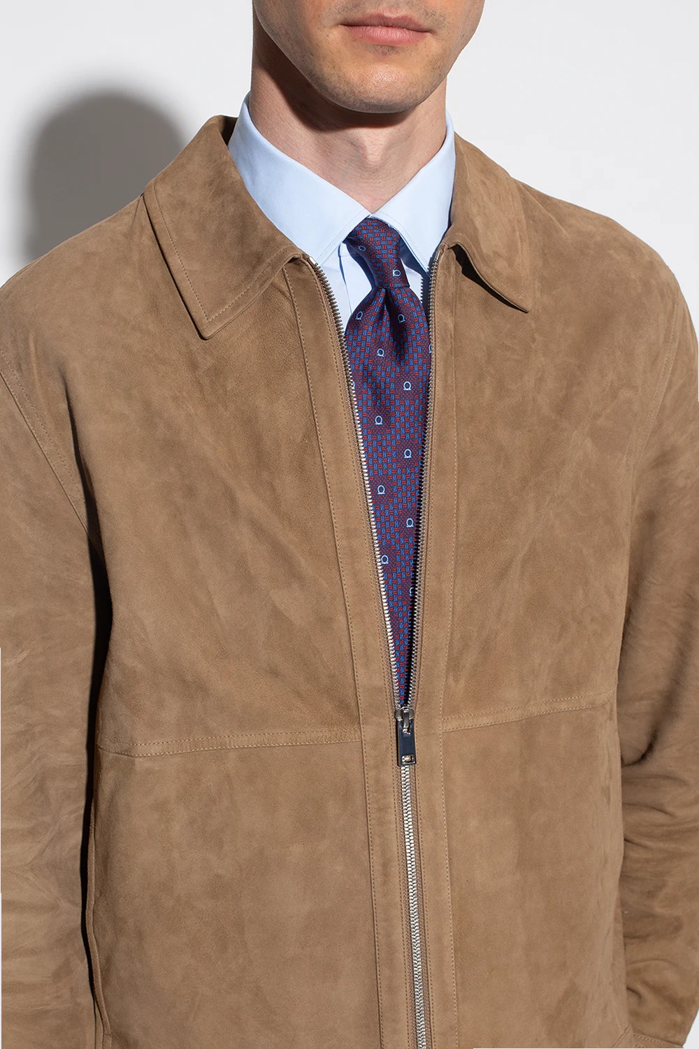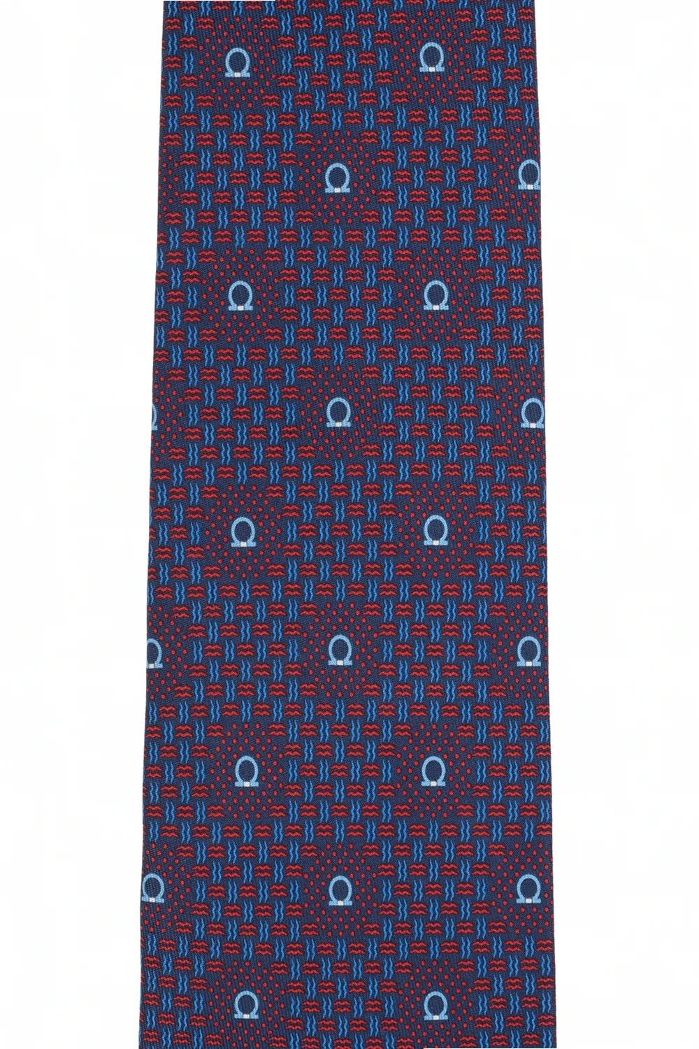 Granatowy, jedwabny krawat Salvatore Ferragamo. Ozdobiony niebiesko-czerwono wzorem z logo.