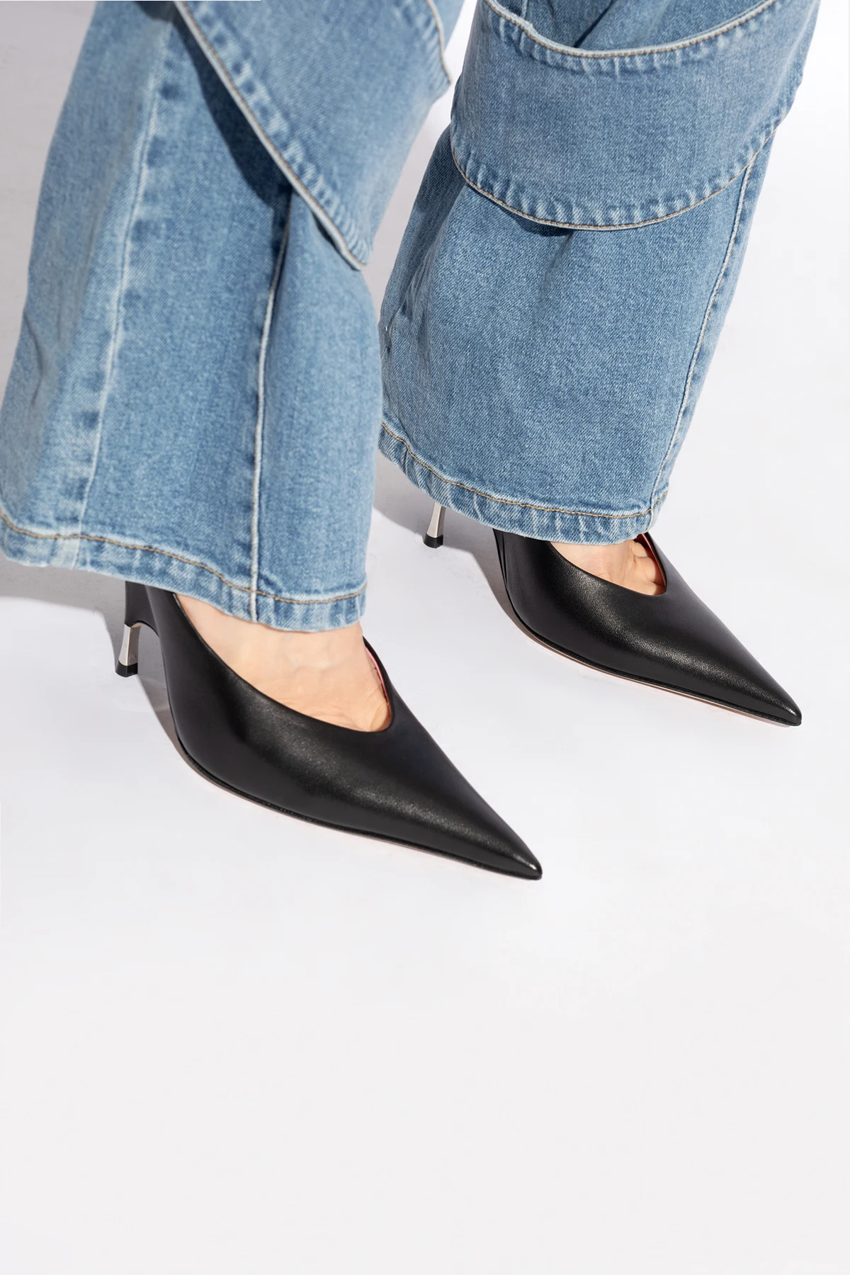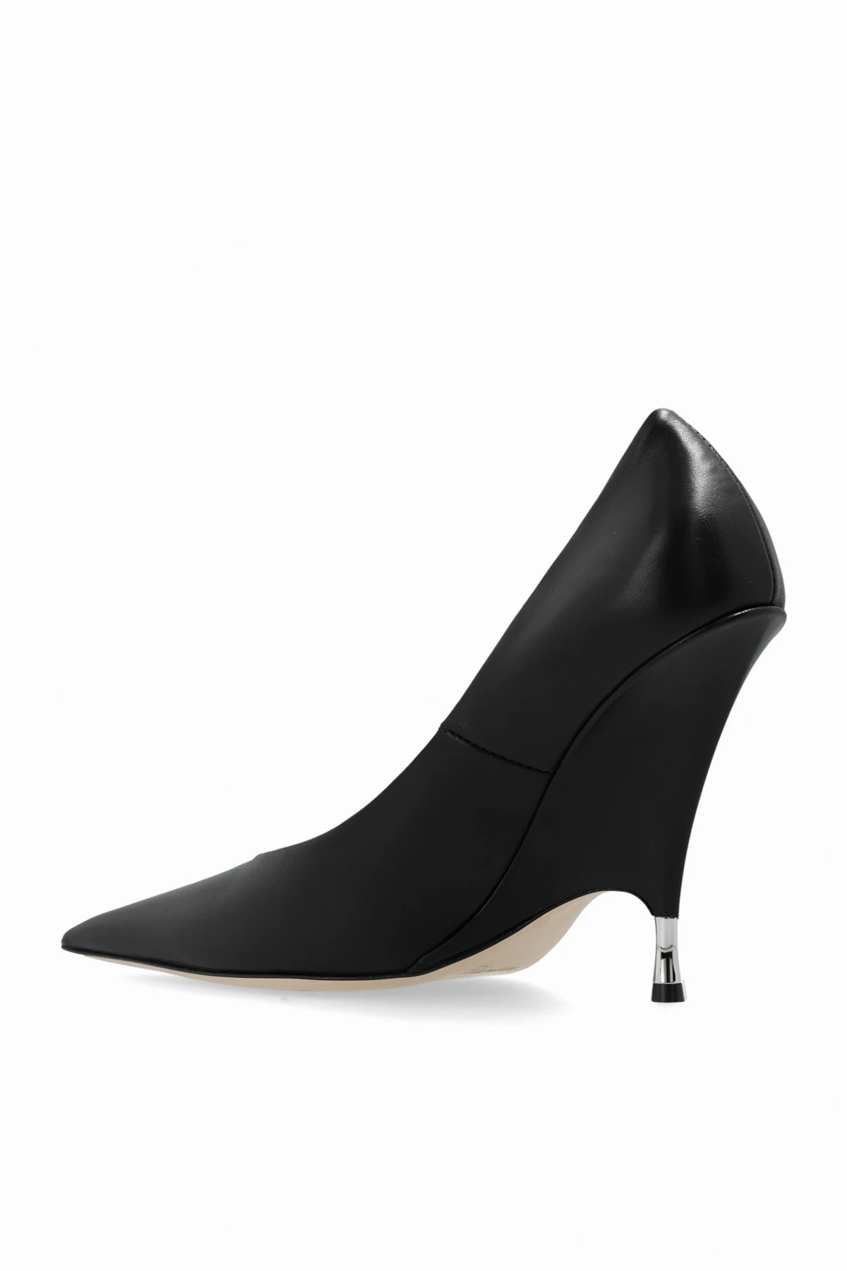 Przed Państwem buty na obcasie ‘Godiva’ od Blumarine , prawdziwe uosobienie klasyki i elegancji. Wykonane z najwyższej jakości skóry, te czarne obuwie zachwyca swoją gładkością oraz wyrafinowanym designem. Szpiczasty przód oraz smukły, stosunkowo wysoki obcas, którego dolna część prezentuje się w metalicznym blasku, dodają im nie tylko elegancji, ale i niezwykłej lekkości. Kontrastujące czerwone wnętrze stanowi subtelną niespodziankę, która w połączeniu z zewnętrzną powłoką tworzy dzieło sztuki użytkowej.