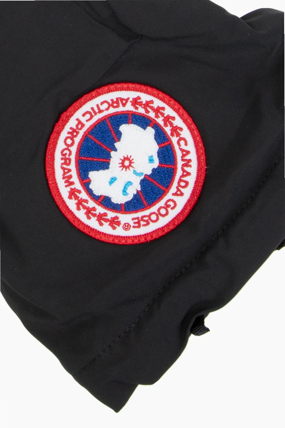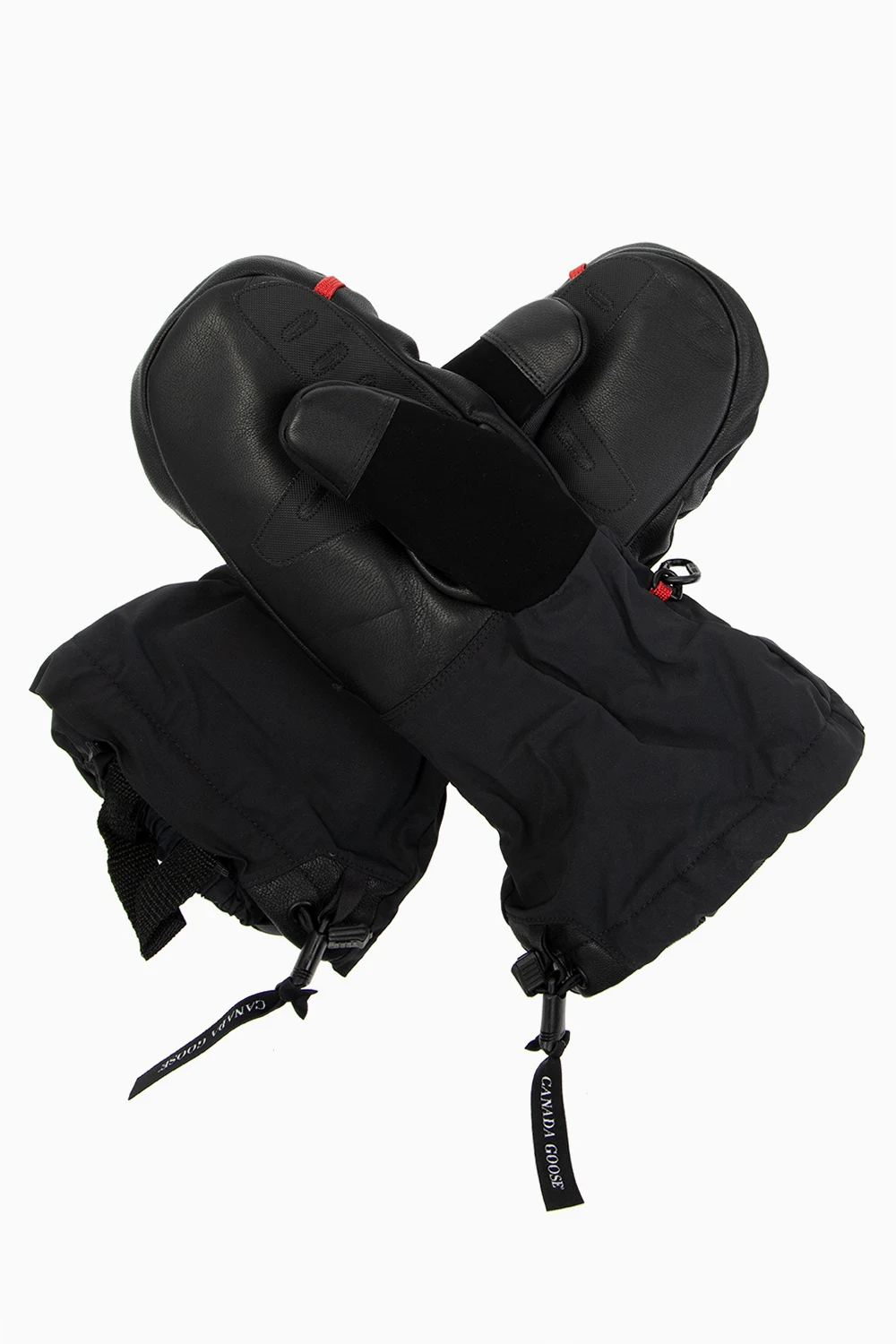 Czarne rękawice Canada Goose. Wykonane z tkaniny Tri-Durance HS® z wodoodporną i oddychającą wyściółką Hipora®. Ozdobione naszywką z logo w kolorze czerwono-biało-granatowym. Wyjmowana warstwa wewnętrzna w kolorze czarnym. Czarne, skórzane wykończenie.