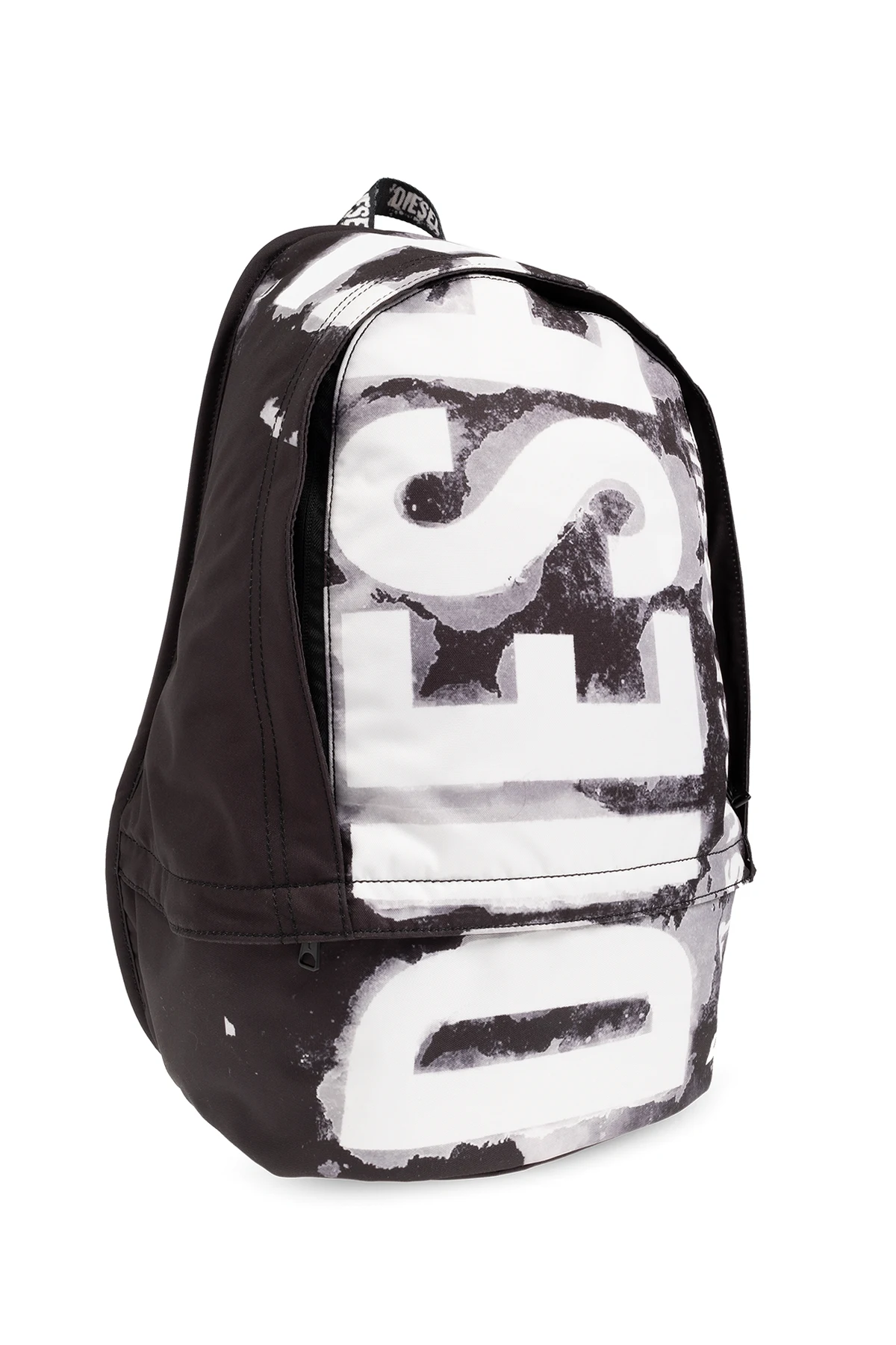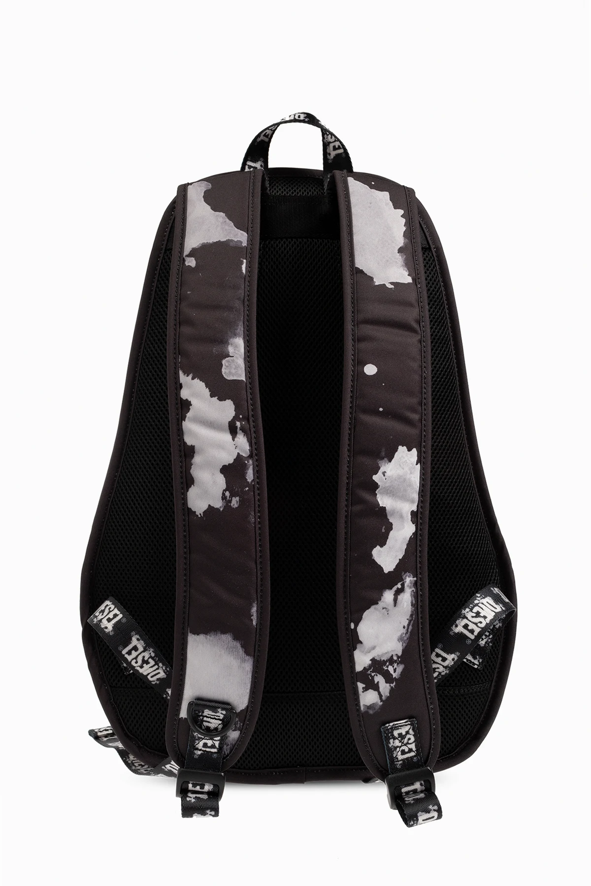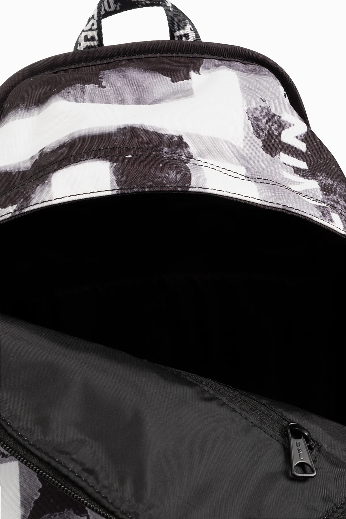 Czarny plecak, model 'RAVE’ Diesel. Wykonany z materiału. Zamykany na dwubiegunowy zamek. Ozdobiony szaro-czarnym nadrukiem z logo. Z przodu kieszeń zamykana na zamek. Półokrągła rączka. Regulowane szelki. Wewnątrz komora, kieszeń zamykana na zamek i wsuwana kieszeń.