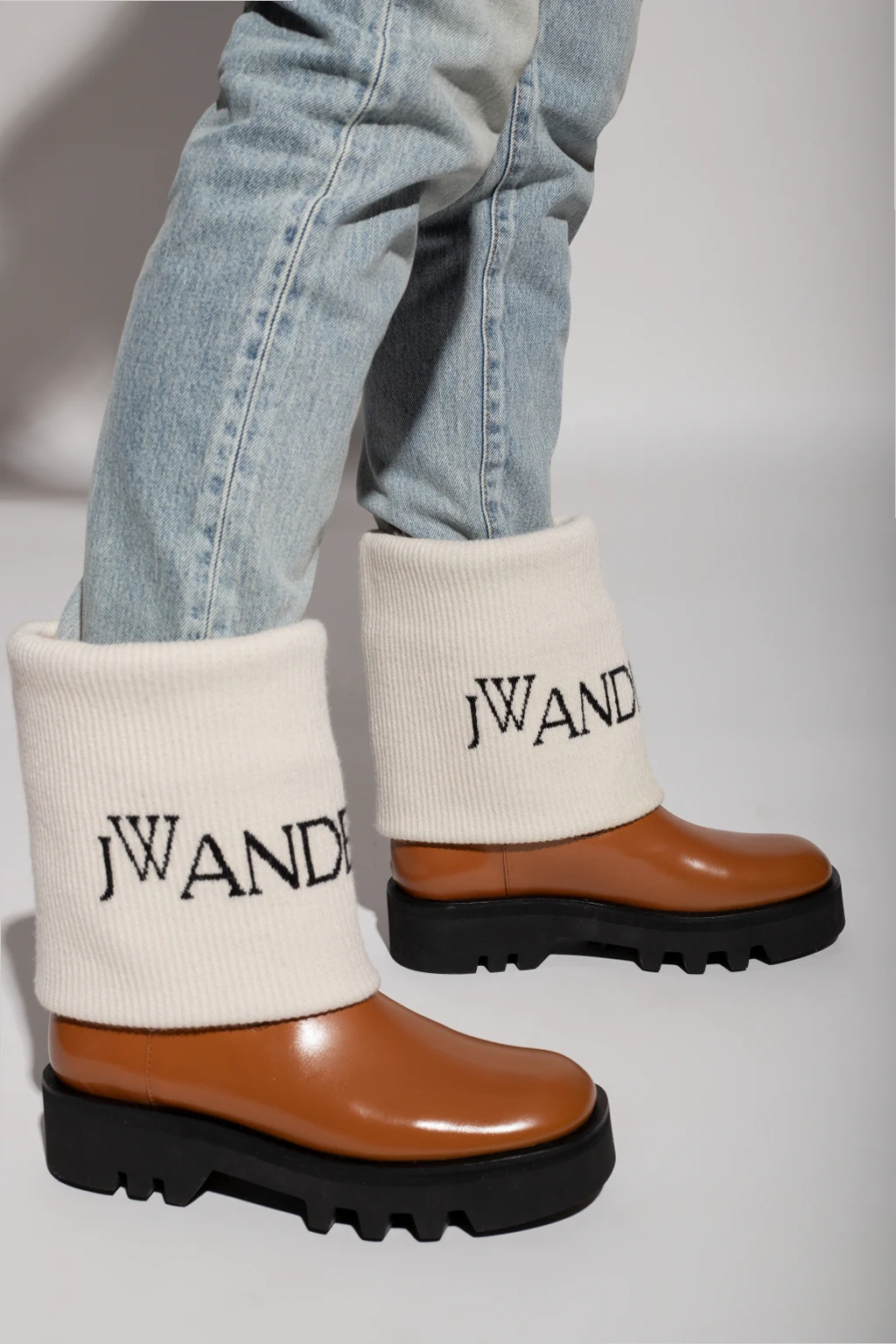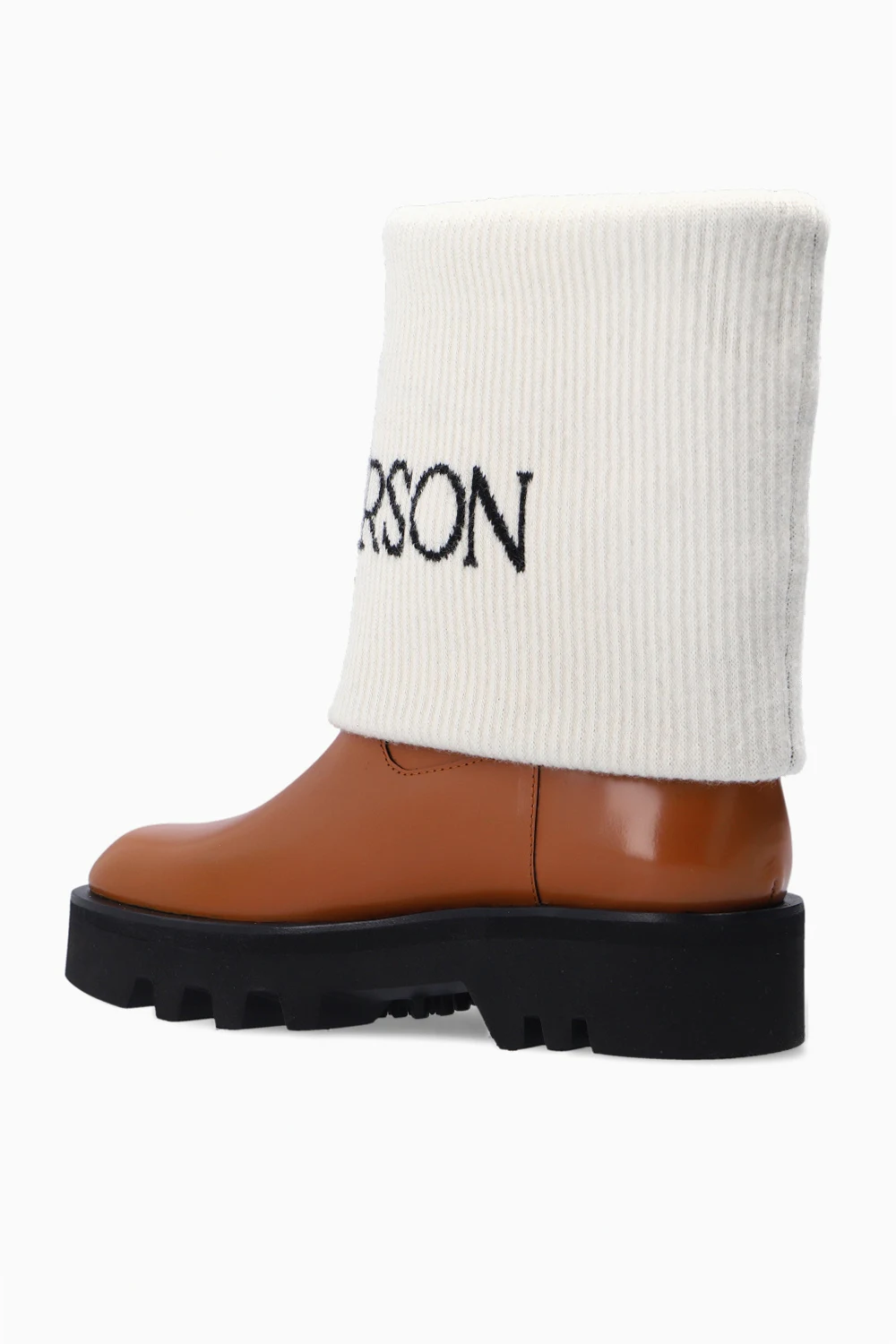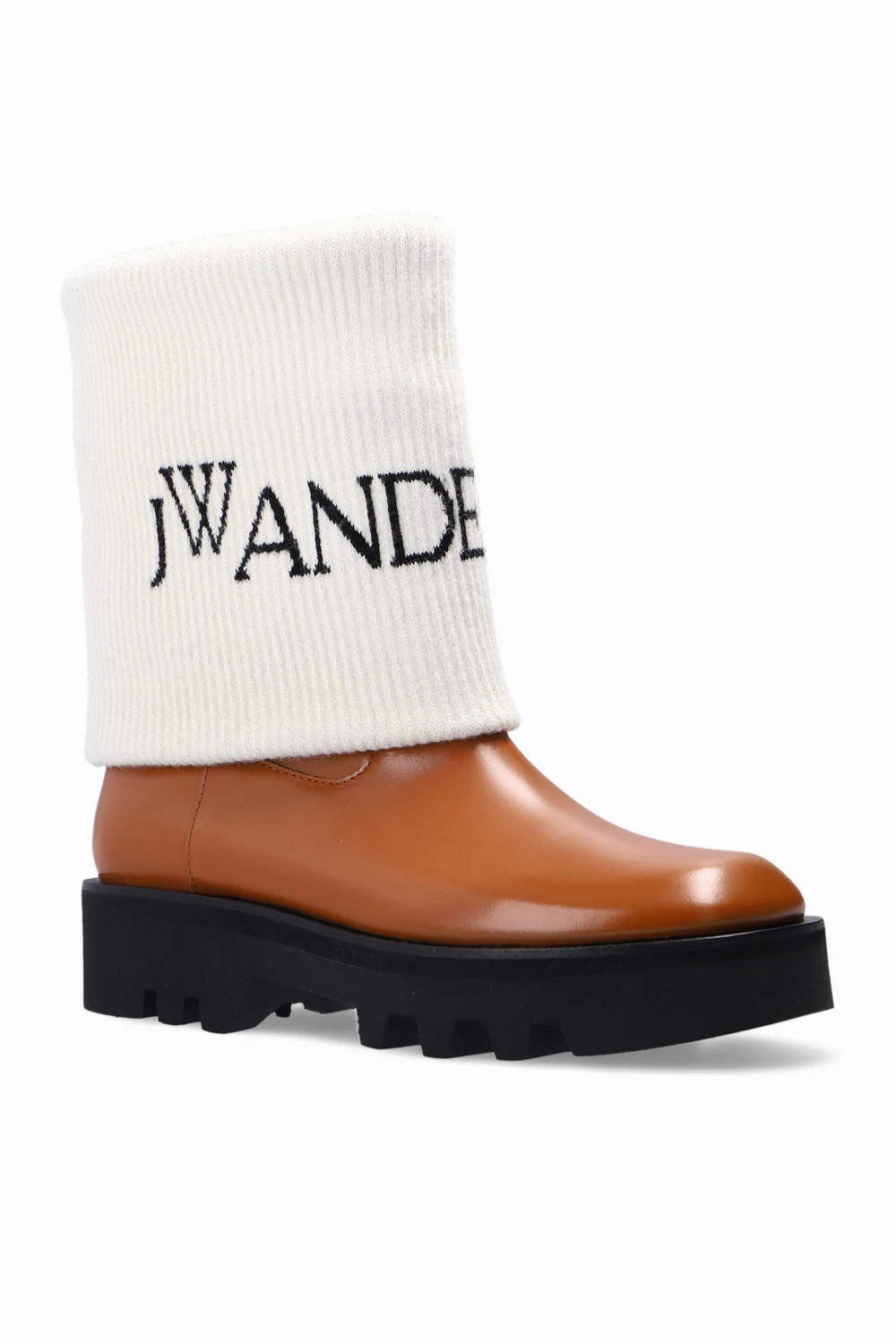 Brązowo-białe buty JW Anderson. Wykonane ze skóry. Wykończone zawijanym ściągaczem. Ozdobione wyszytym logo w kolorze czarnym. Czarna, gumowa podeszwa.