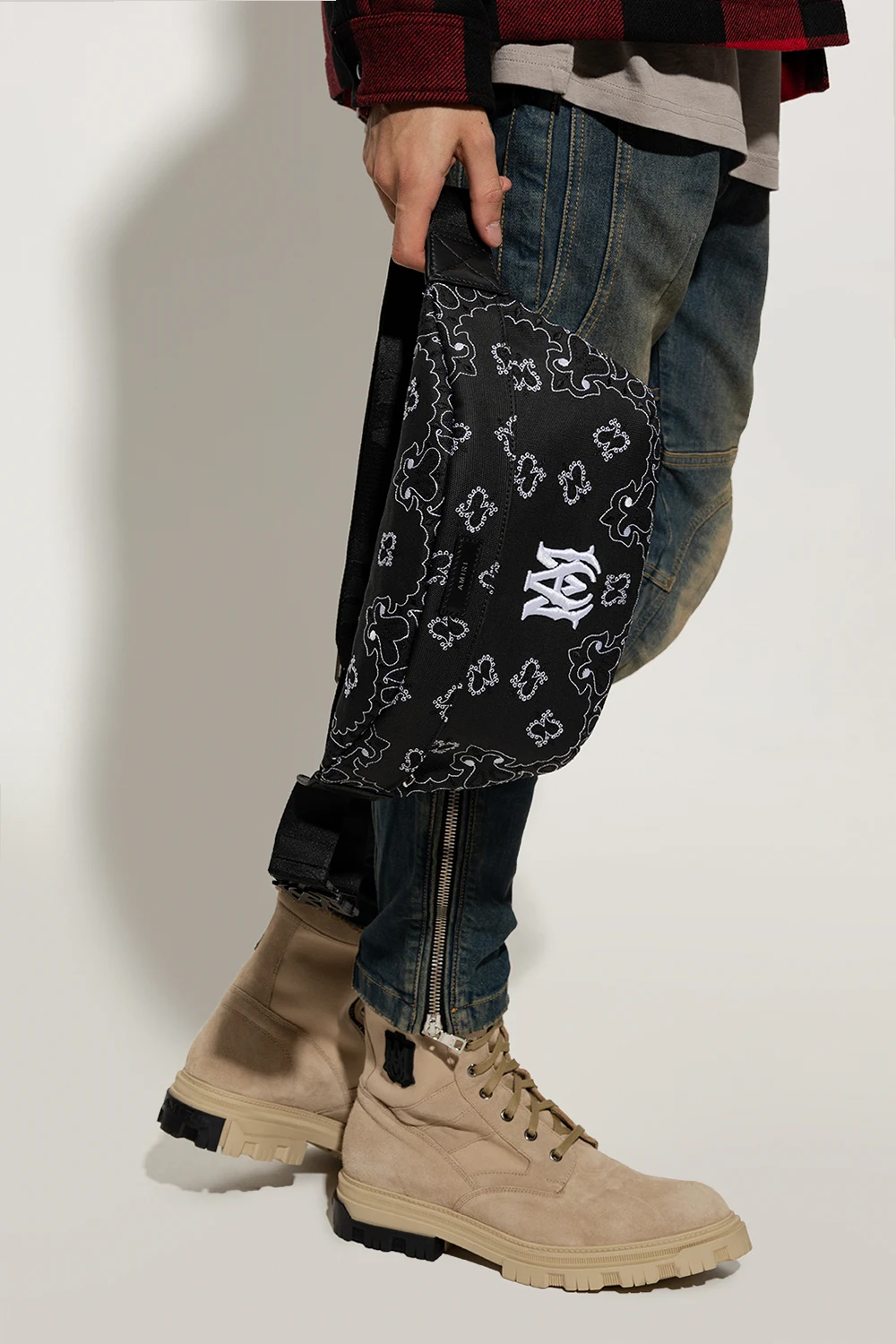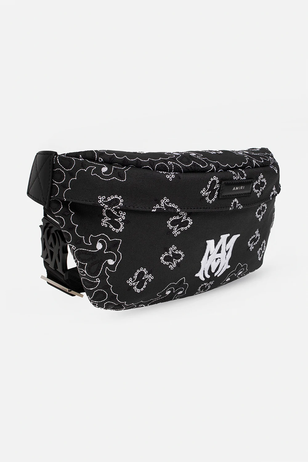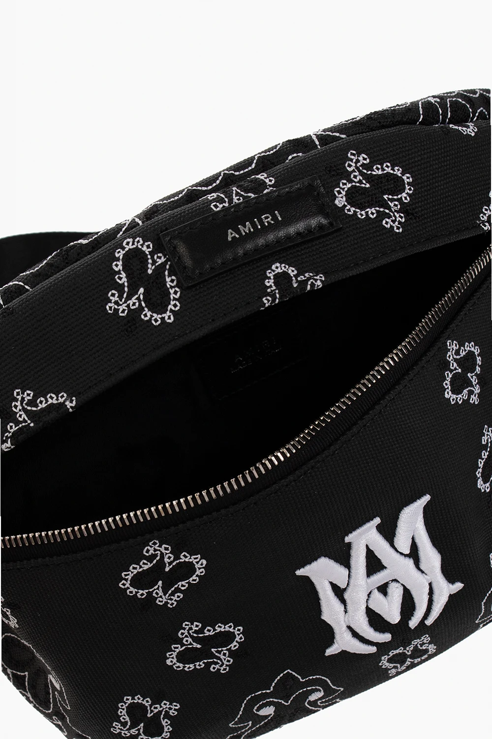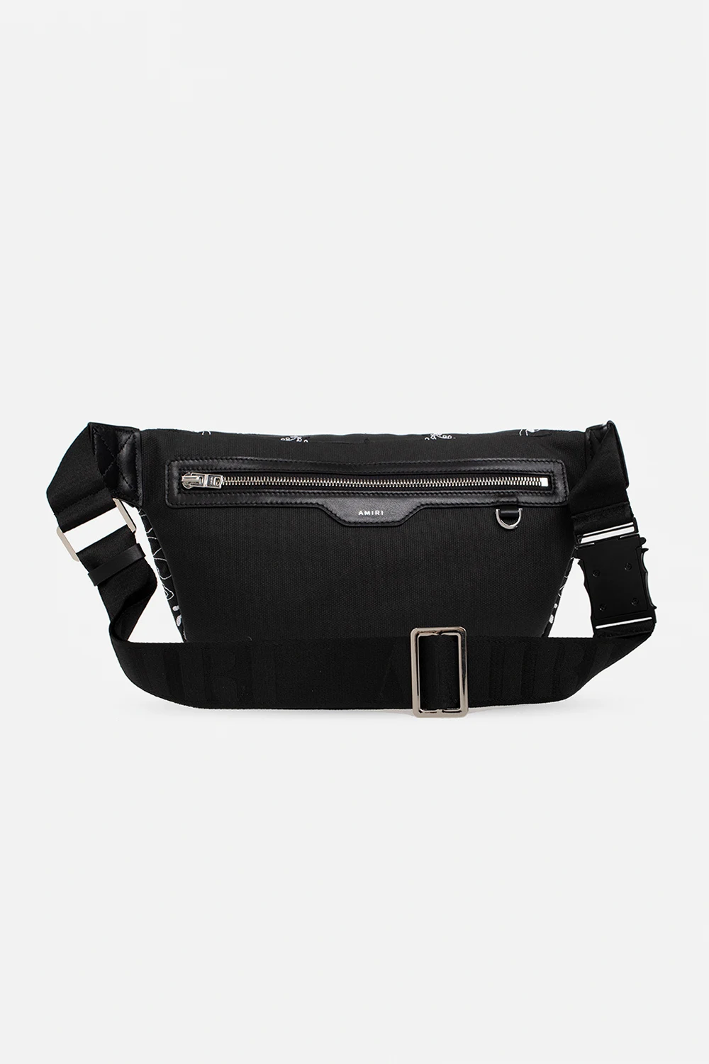 Czarna torba na pas Amiri. Wykonana z bawełny. Zamykana na zamek. Ozdobiona wyszytym, białym wzorem oraz logo. Z tyłu kieszeń zamykana na zamek. Pas biodrowy z możliwością regulacji długości. Wewnątrz komora. Metalowe wykończenie w kolorze srebrnym.