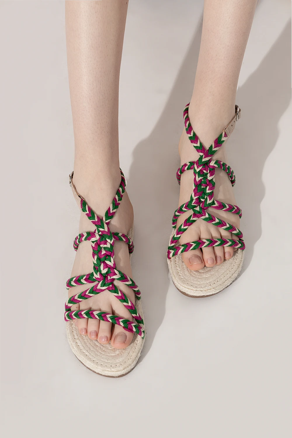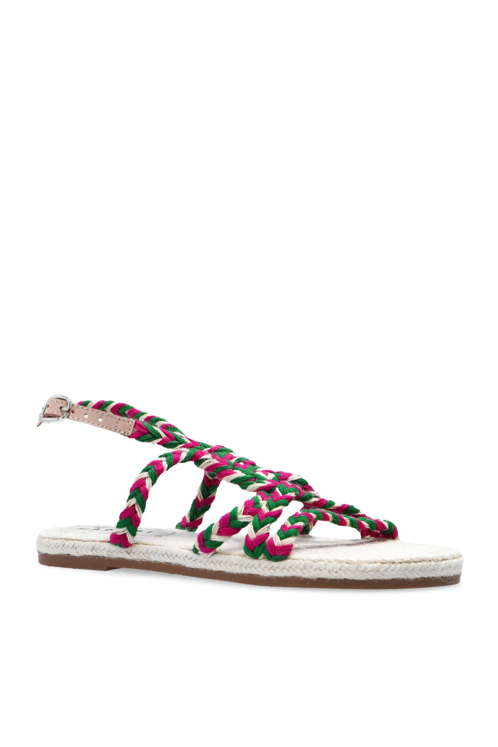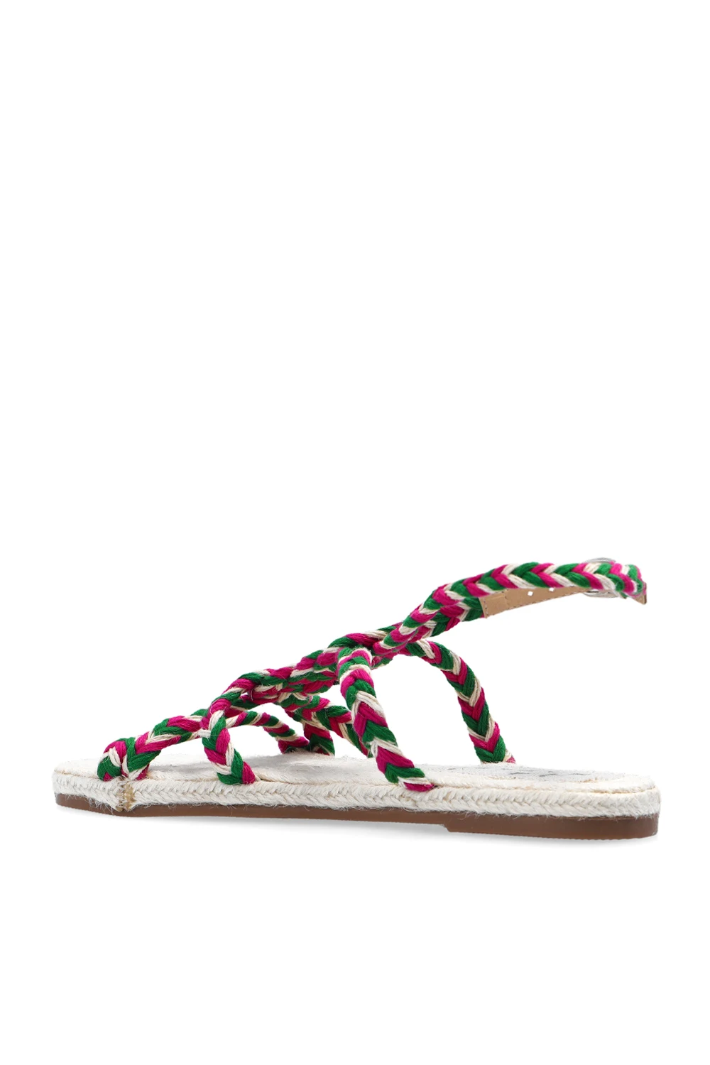 Zielono-różowo-kremowe sandały, model ‘Yukatan’ Manebi. Wykonane z juty. Wokół kostki zapięcie na regulowany pasek z klamrą. Podeszwa wykonana z naturalnej juty wykończonej cienką warstwą kauczuku w kolorze brązowym.