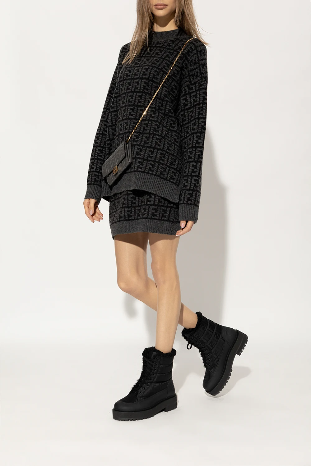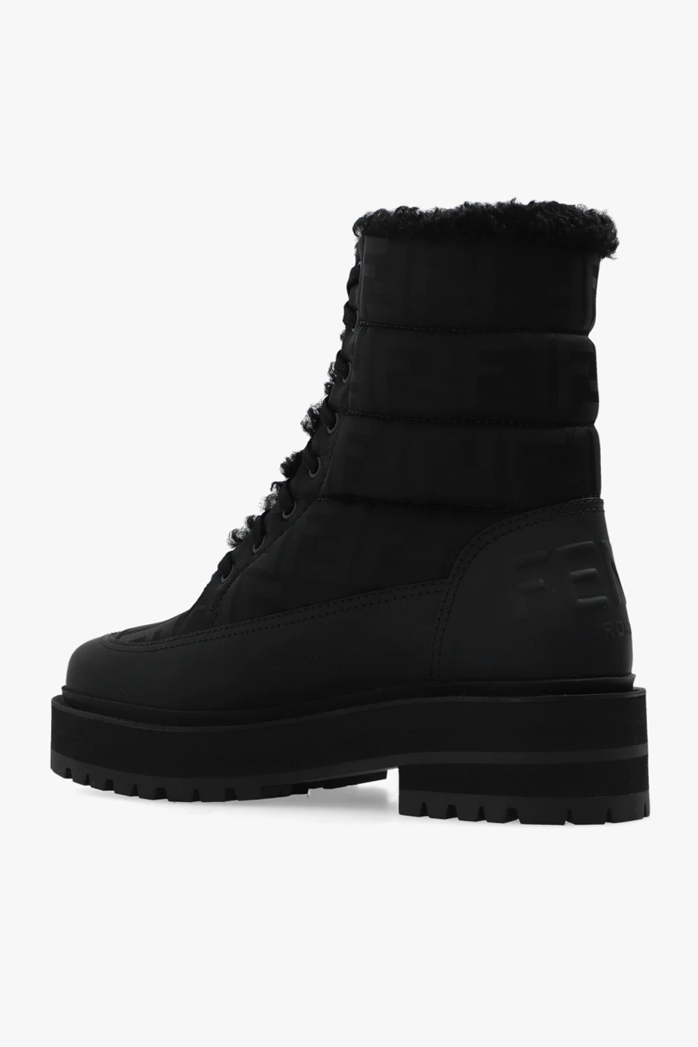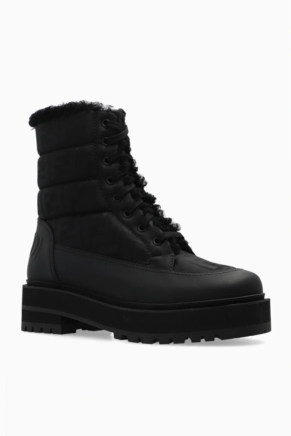 Czarne, sznurowane, pikowane buty za kostkę, model ‘Biker’ Fendi. Ozdobione wzorem z monogramem i logo. Warstwa wewnętrzna wykończona futrem. Czarna, gumowa podeszwa.