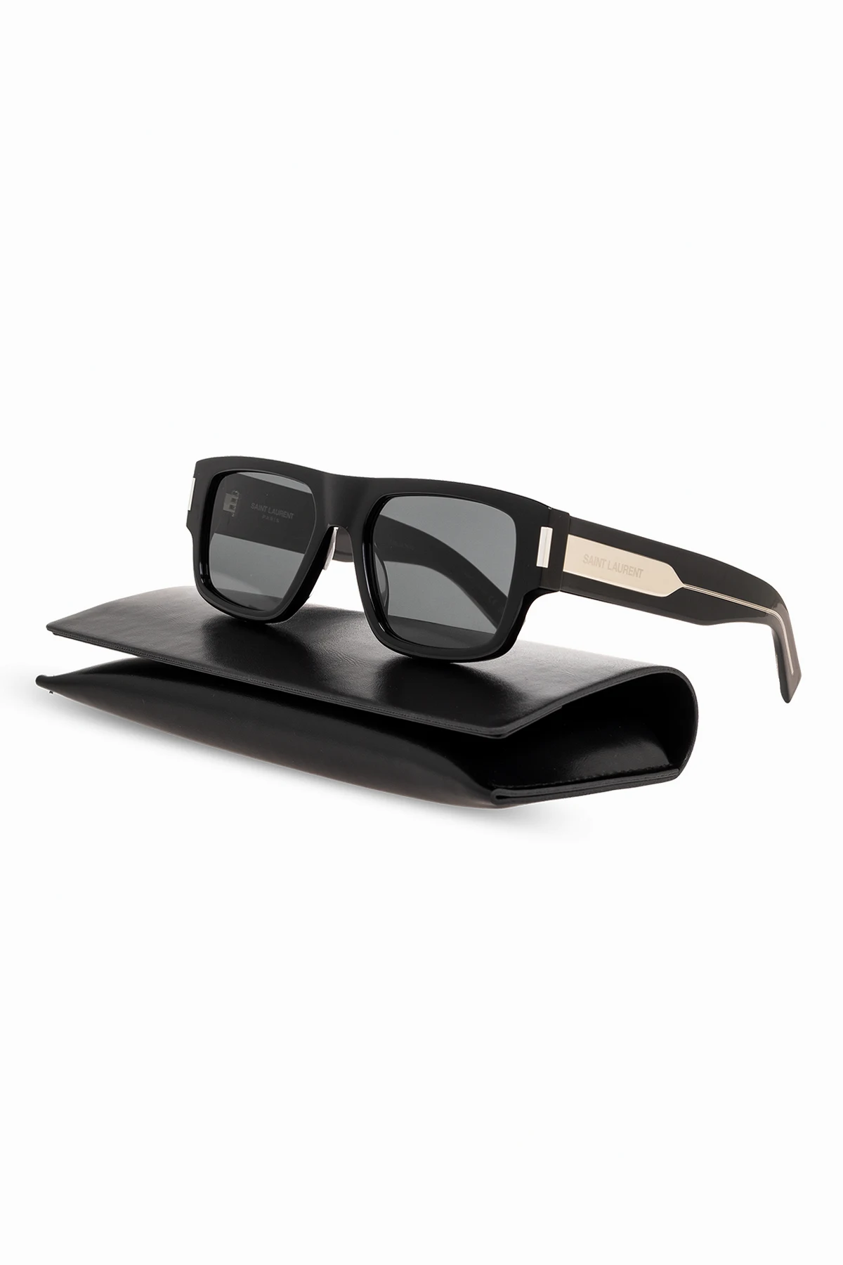 Czarne okulary przeciwsłoneczne, model ‘SL 659’ Saint Laurent. Prostokątne oprawki. Szerokie zauszniki ozdobione logo. Szare soczewki ze 100% ochroną przed promieniowaniem UVA/UVB. Metalowe elementy w kolorze srebrnym. Dołączone etui.