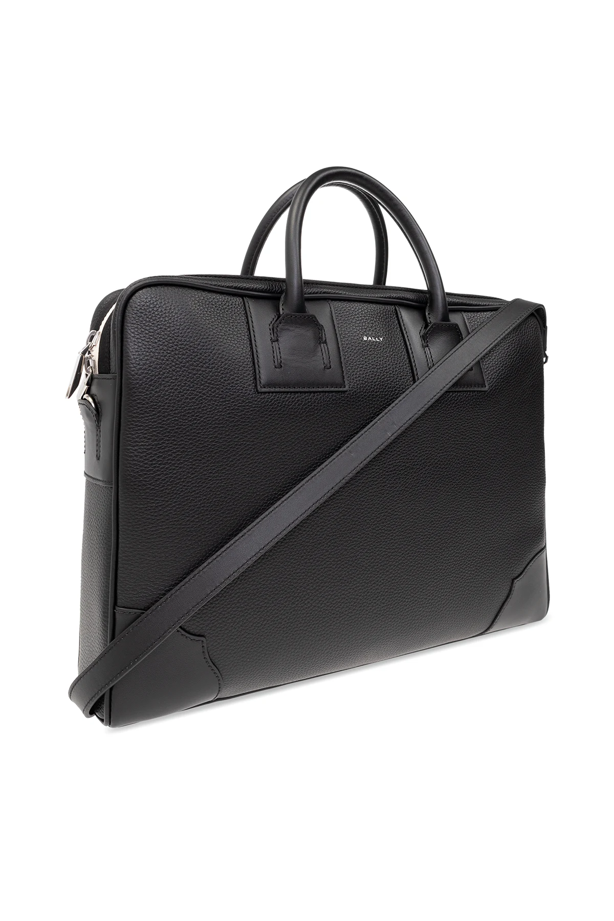Czarna aktówka, model ‘Bord Brief’ Bally. Wykonana ze skóry. Zamykana na dwubiegunowy zamek w kolorze kremowym. Z przodu logo w kolorze srebrnym. Dwie półokrągłe rączki. Odpinany, regulowany pasek na ramię. Wewnątrz komora, trzy wsuwane kieszenie i zamykana na zamek. Metalowe elementy w kolorze srebrnym.