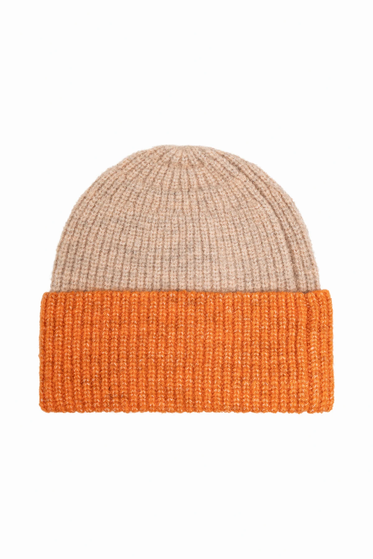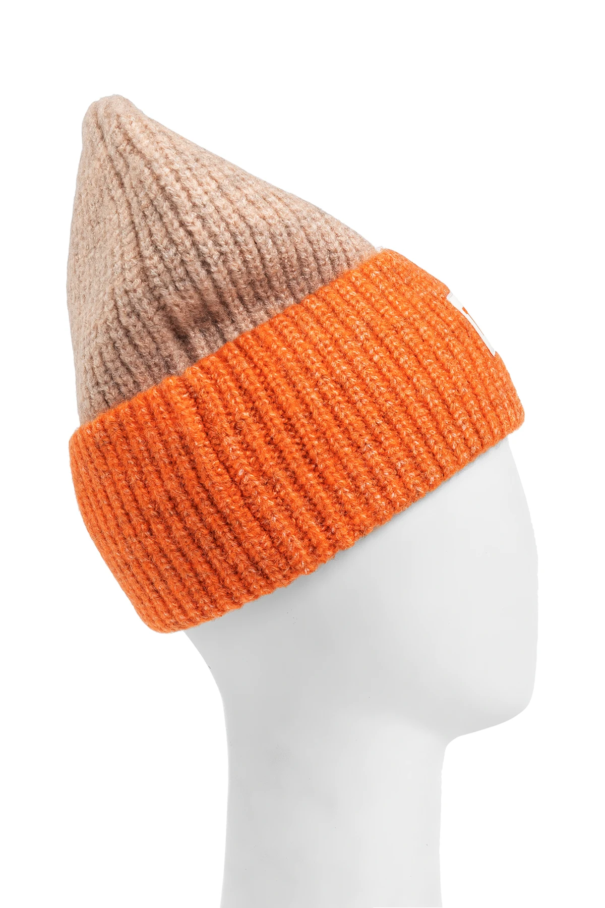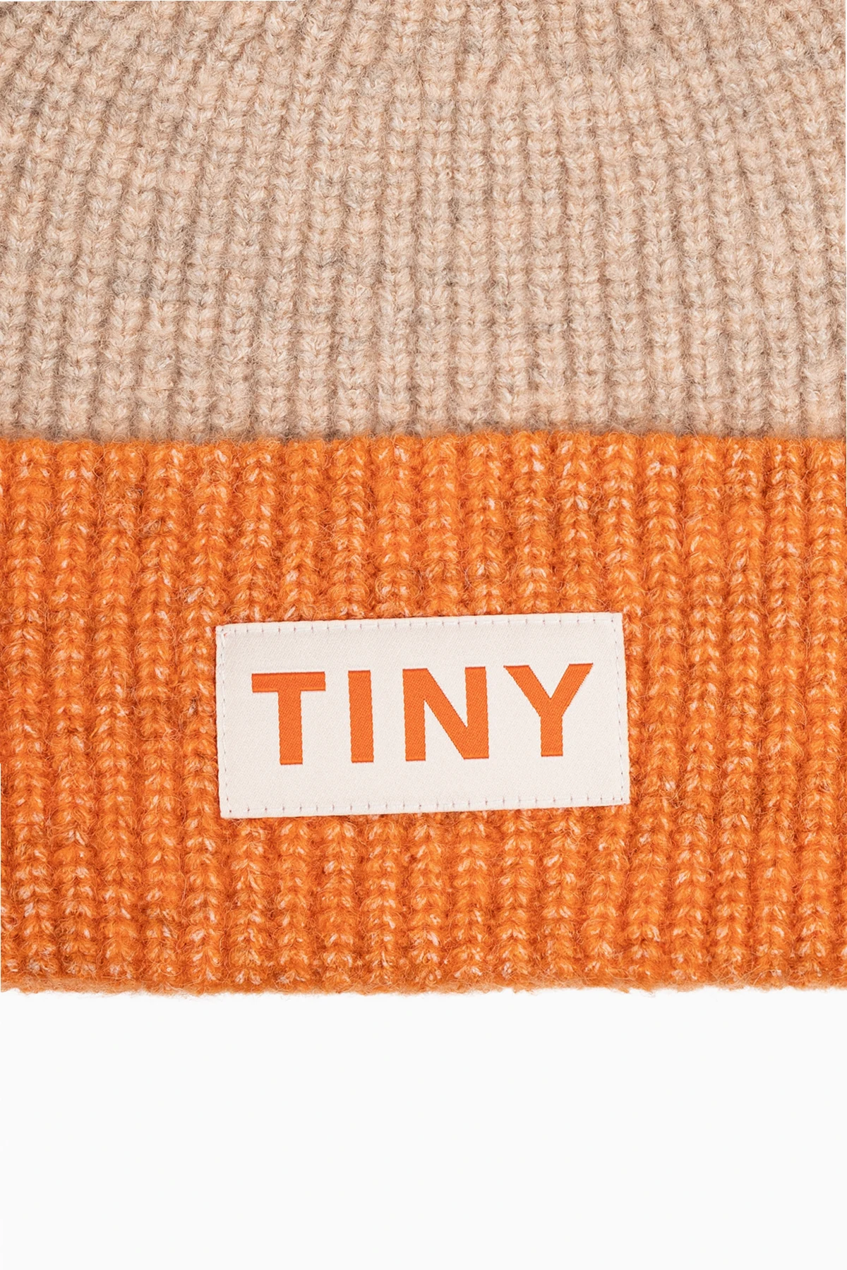 Wyróżniająca się kolorystyka – beżowa czapka z pomarańczowym wywinięciem – sprawia, że dodatek ten staje się nie tylko praktycznym, ale i stylowym elementem garderoby. Biała naszywka z napisem "TINY" w pomarańczowym kolorze, umieszczona na brzegu, podkreśla unikatowość produktu i stanowi jego charakterystyczny akcent.